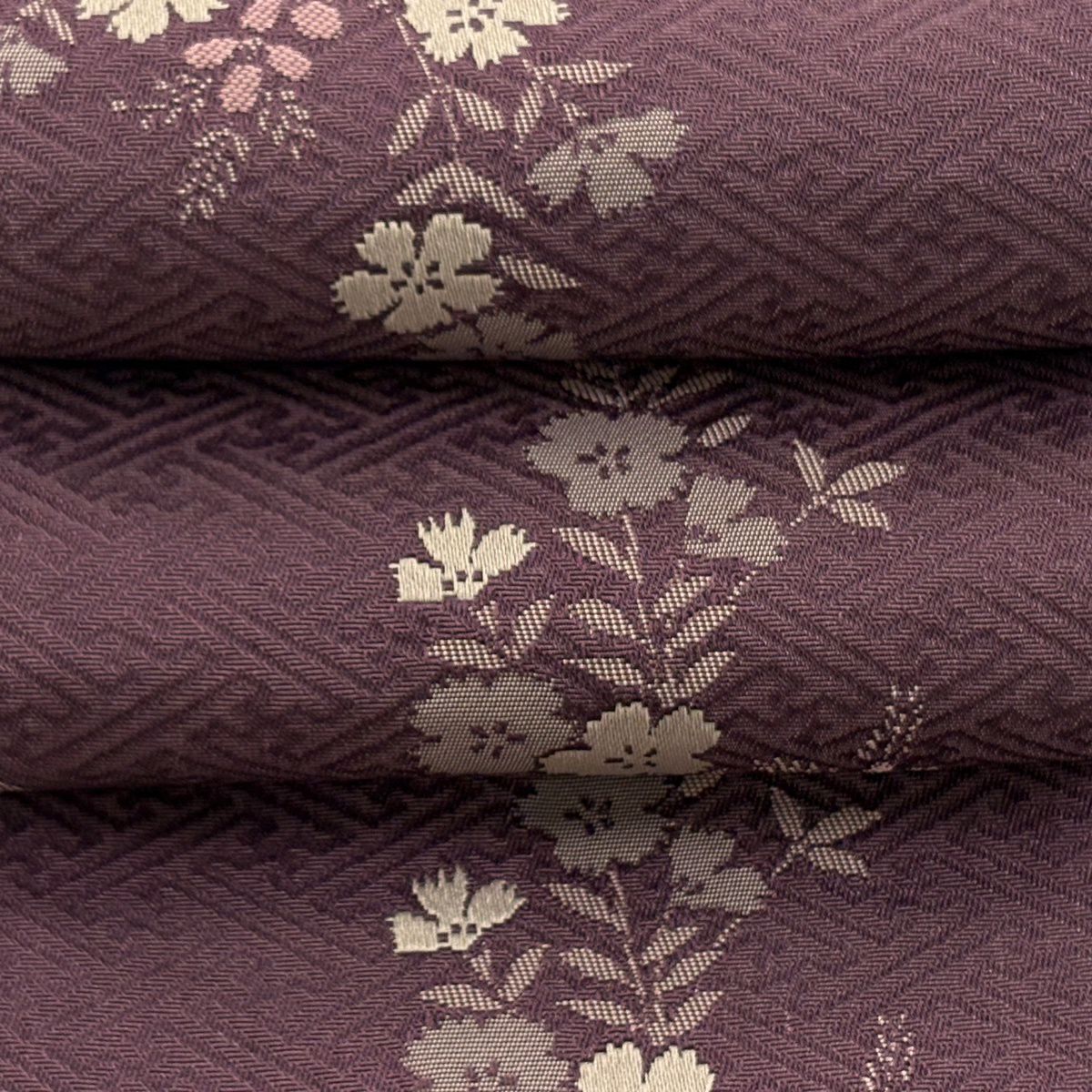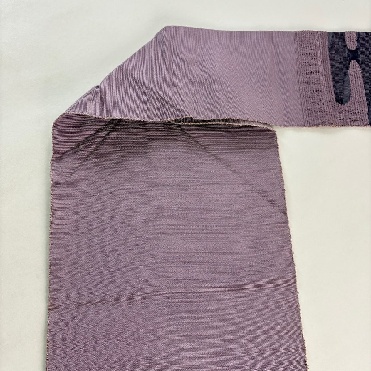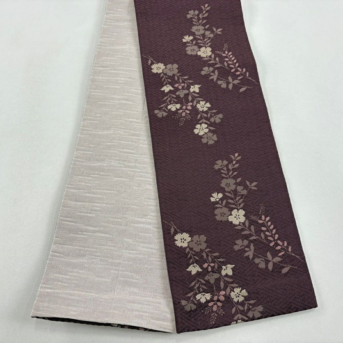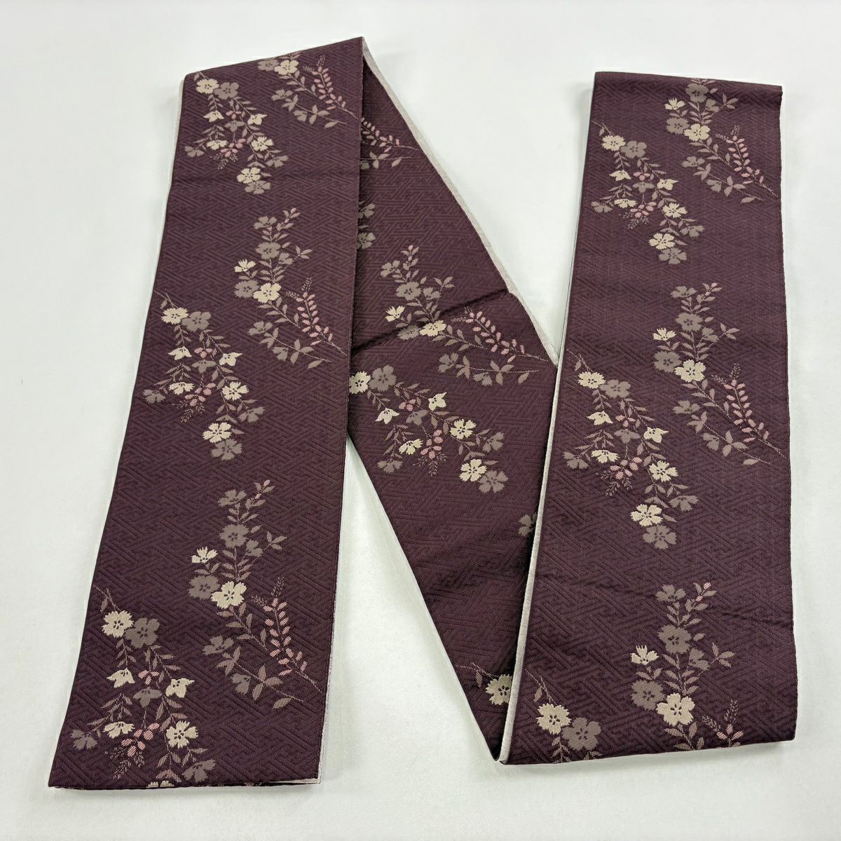 【美品】半幅帯 優品 草花 茶紫 化繊