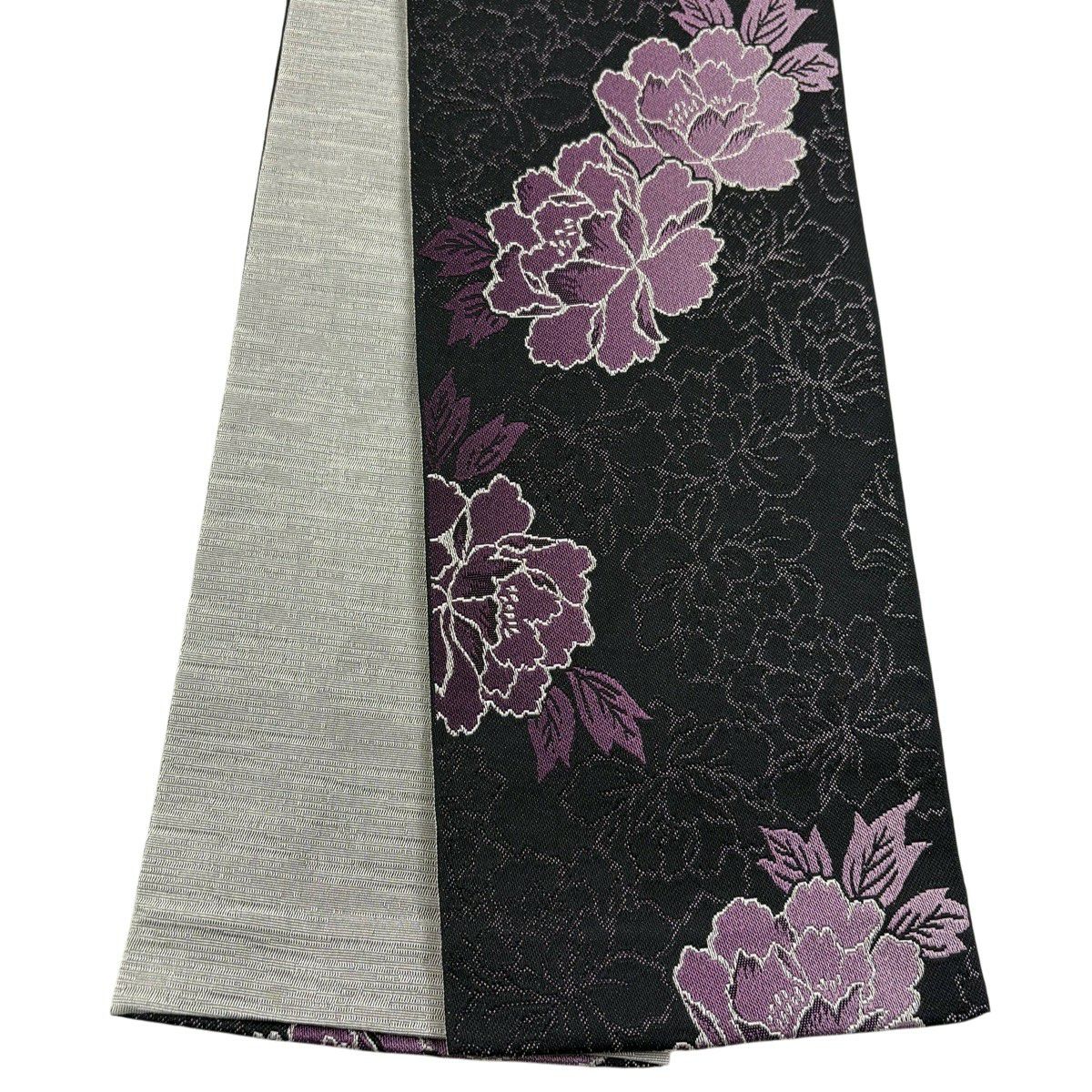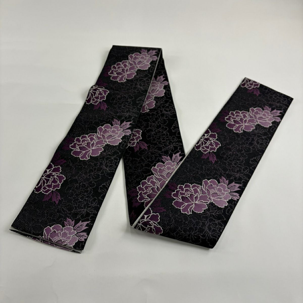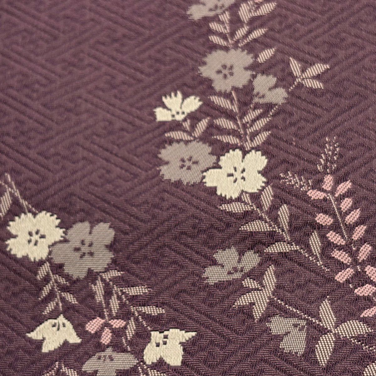 【美品】半幅帯 優品 草花 茶紫 化繊