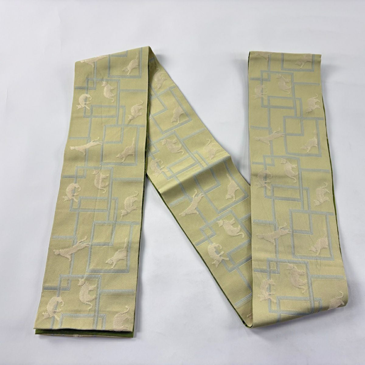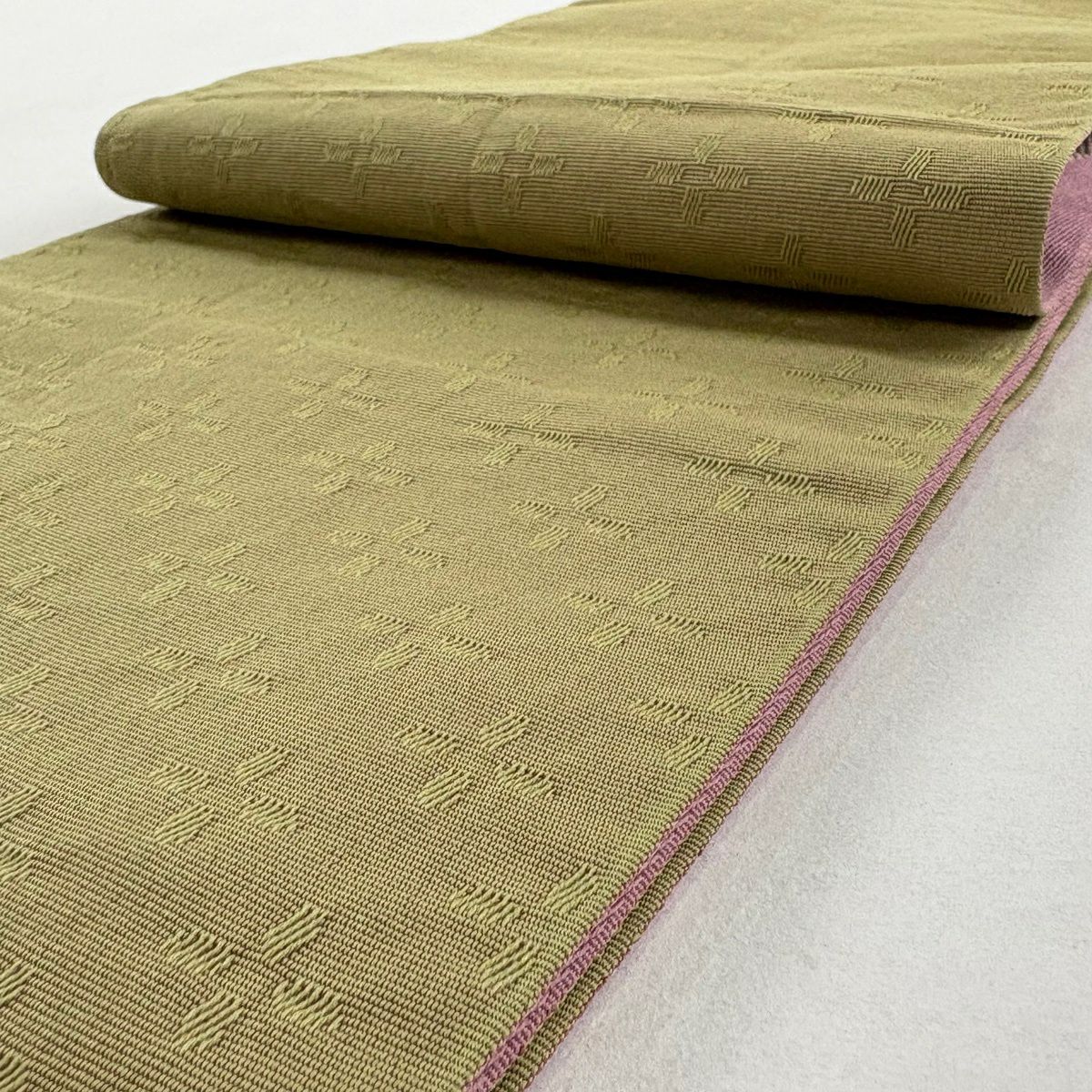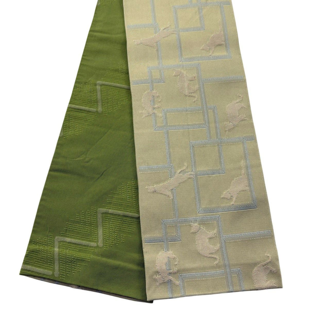 半幅帯 優品 猫 幾何学 抹茶色 化繊