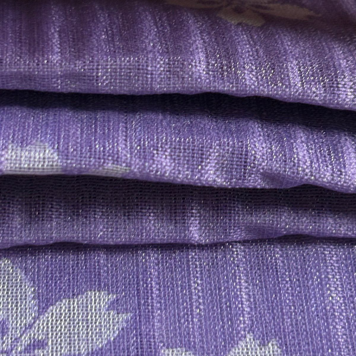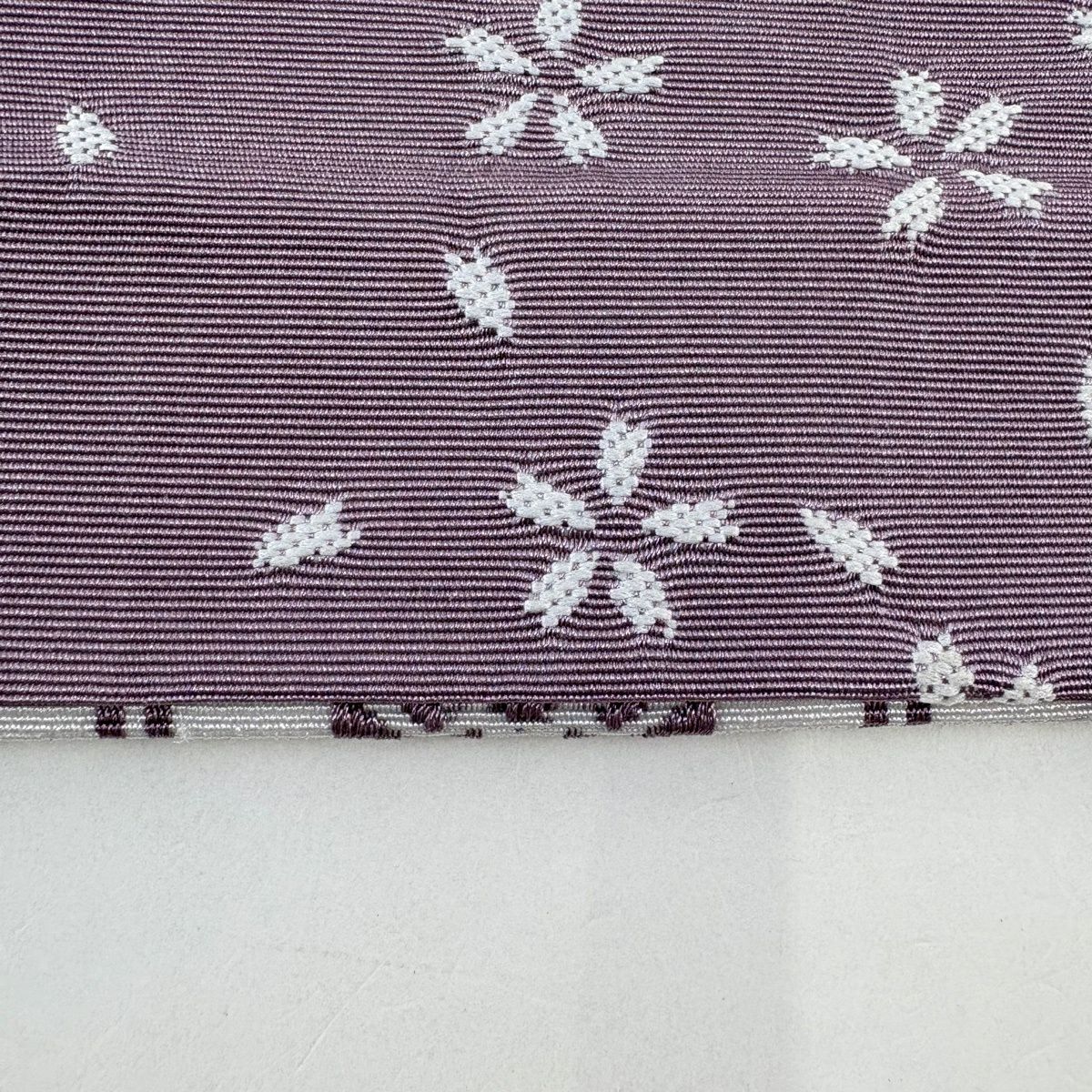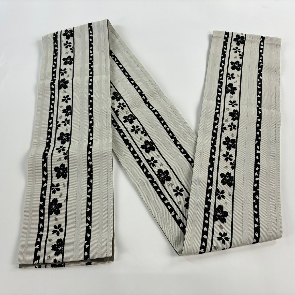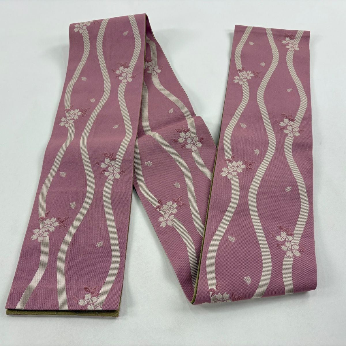半幅帯 優品 桜 縞 銀糸 薄紫 化繊