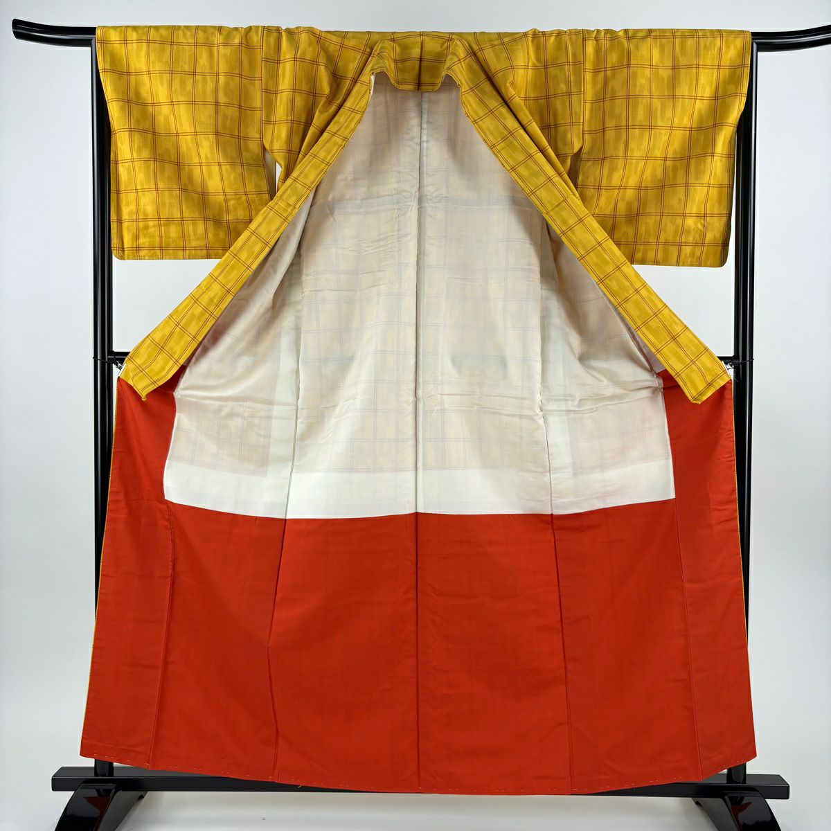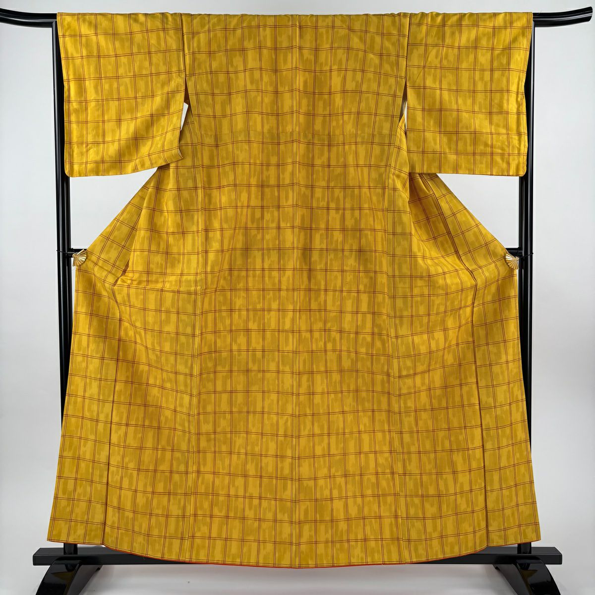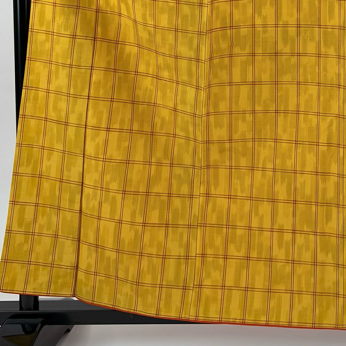【美品】 紬 身丈160.5cm 裄丈65.5cm M 袷 格子 山吹色 正絹 優品