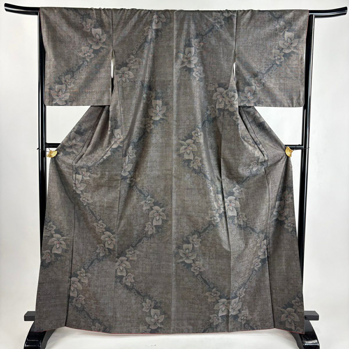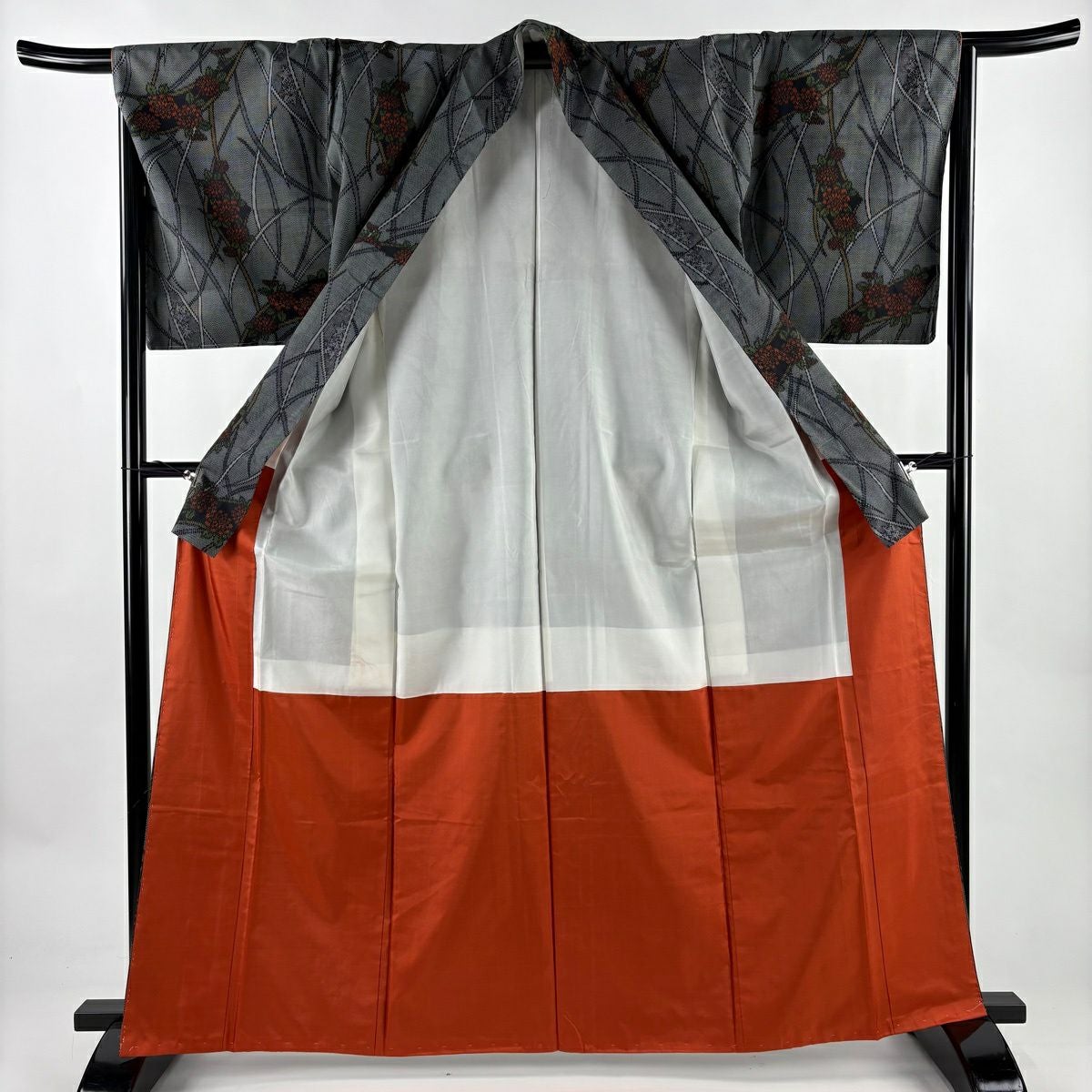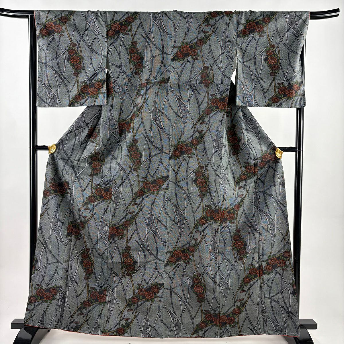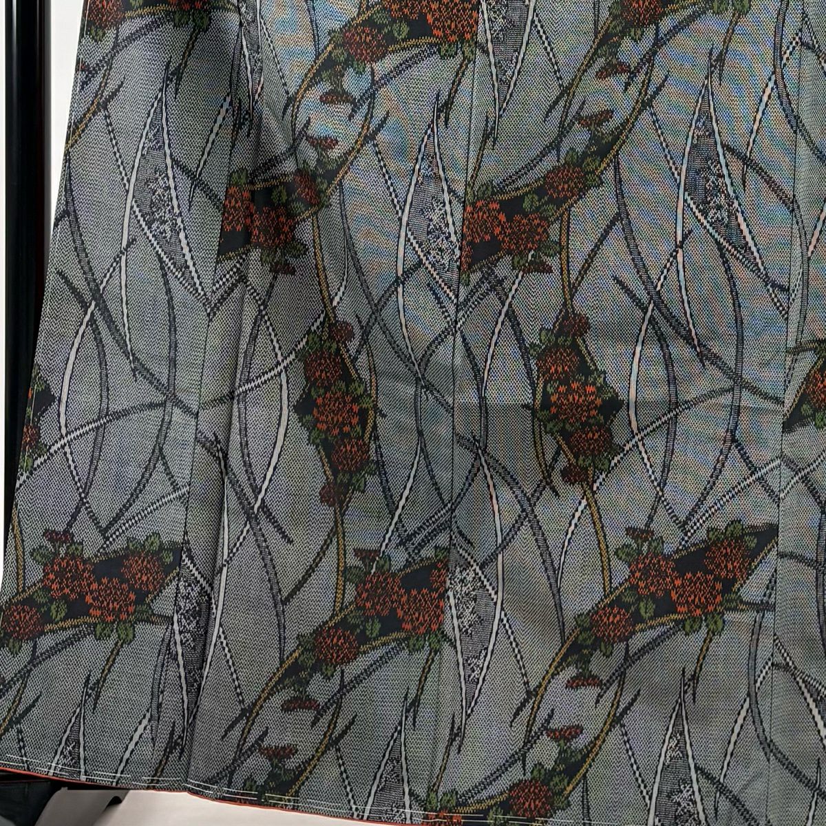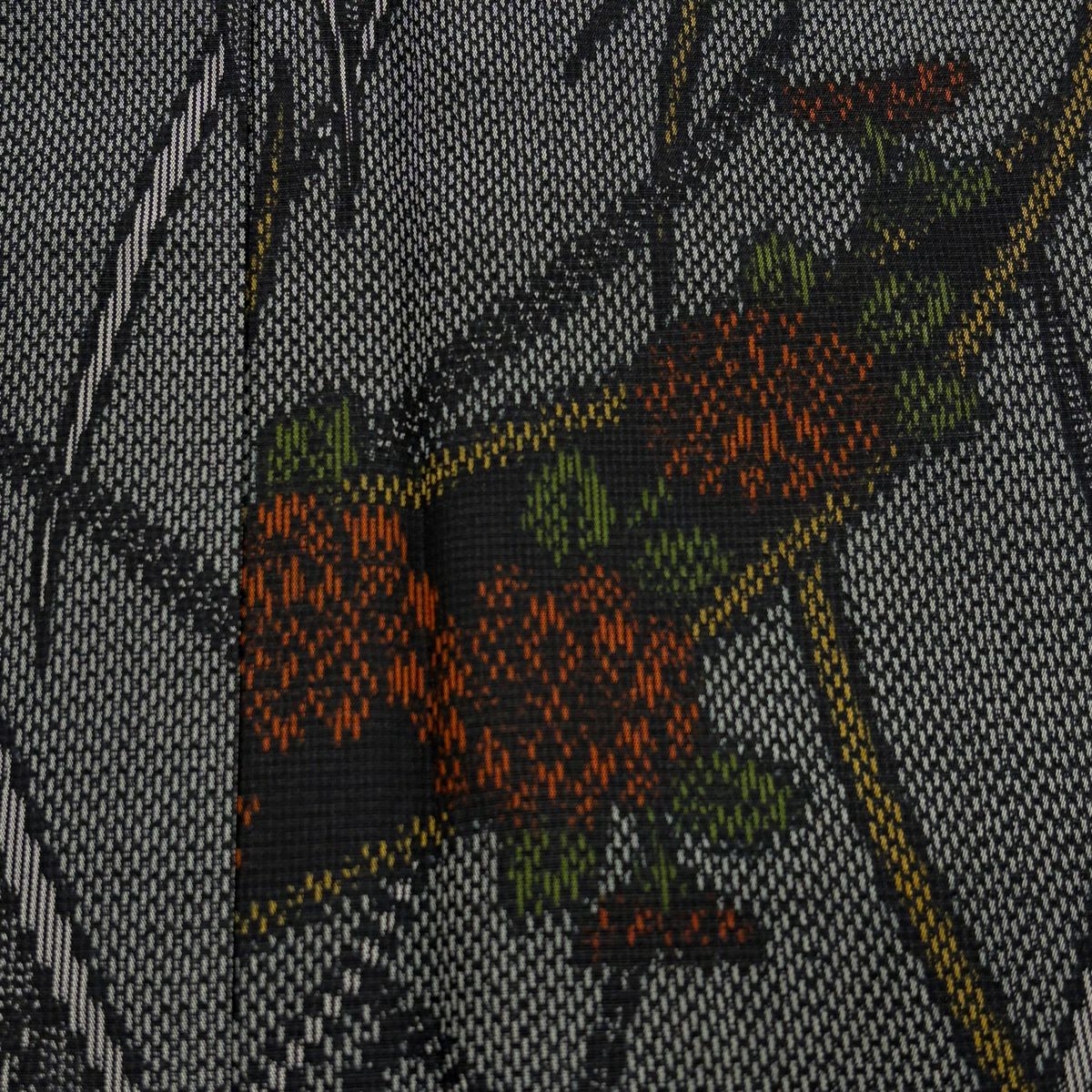 【美品】 紬 身丈165cm 裄丈66.5cm M 袷 草花 芝 黒灰 正絹 優品