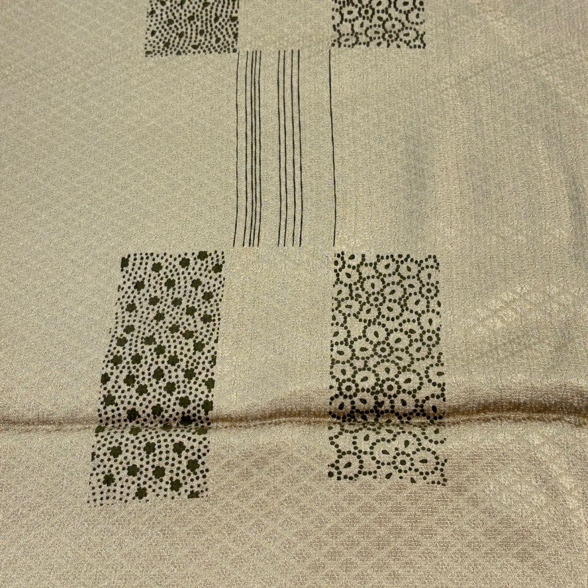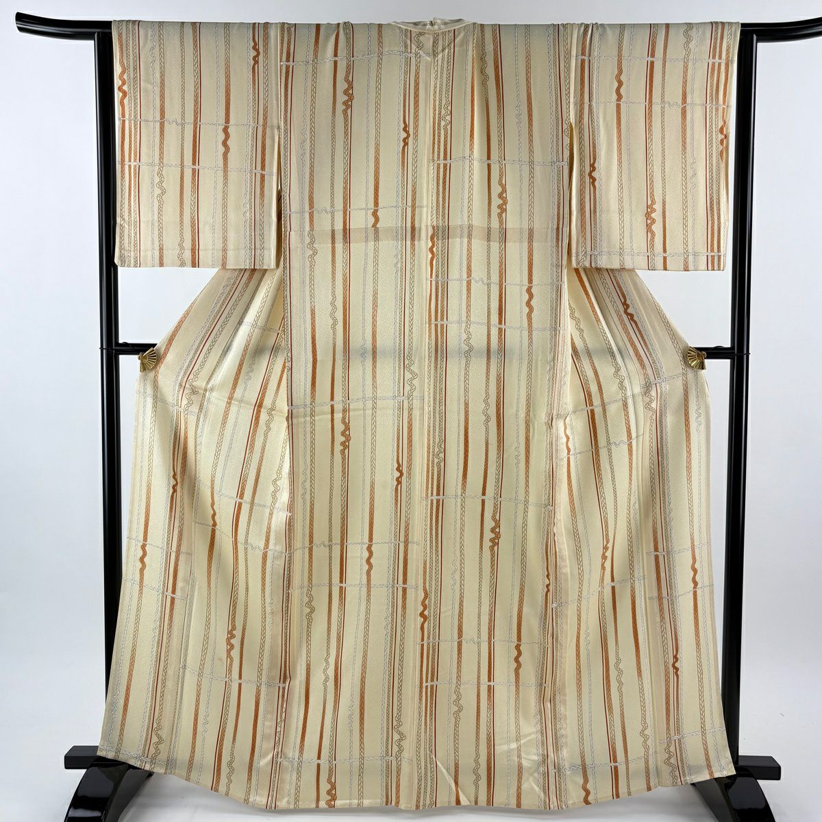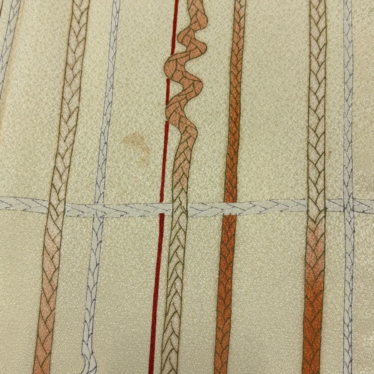 小紋 身丈164cm 裄丈65cm M 単衣 組紐 縞 ベージュ 化繊 優品