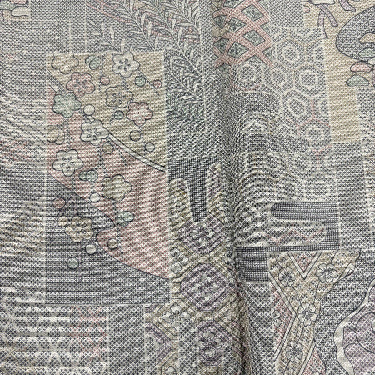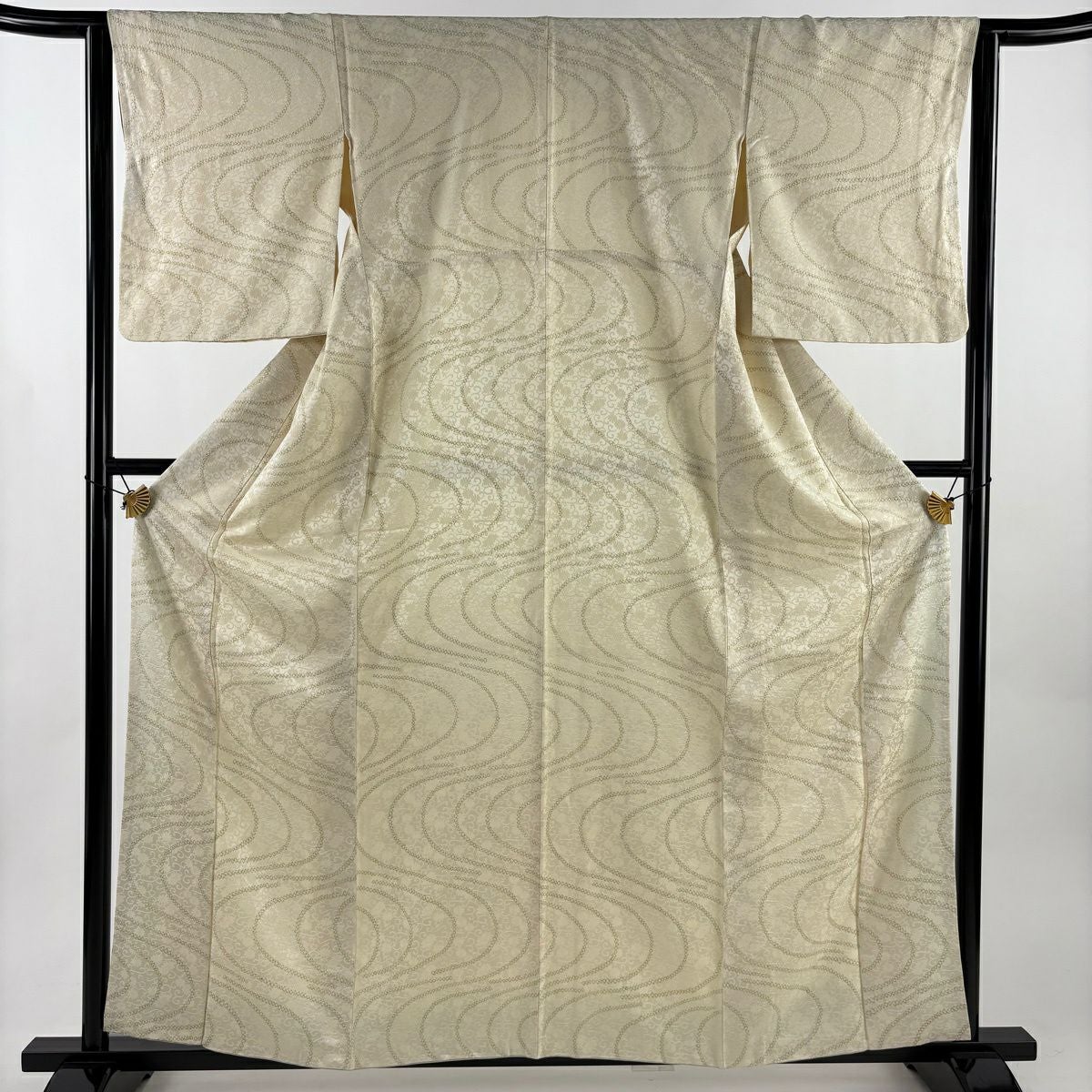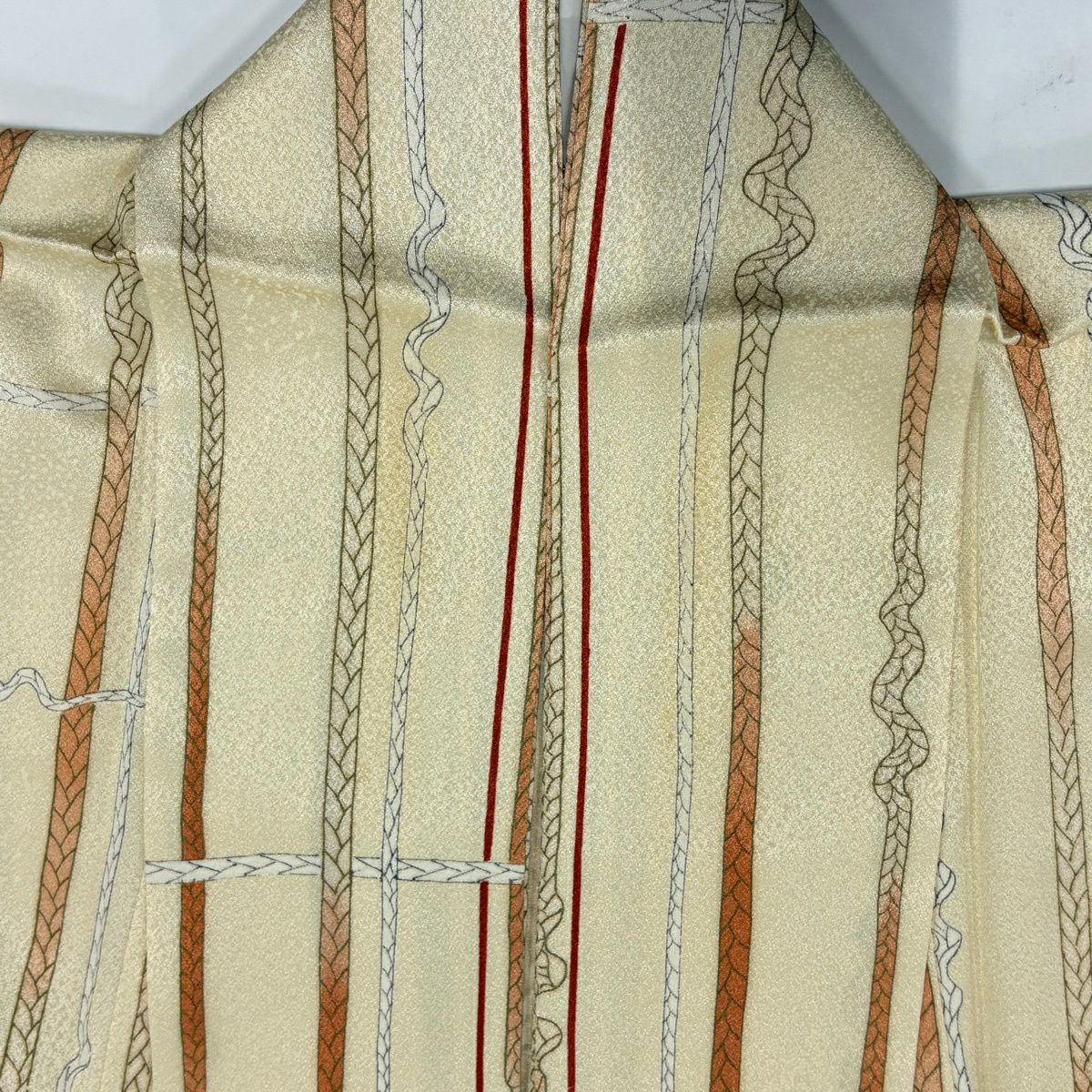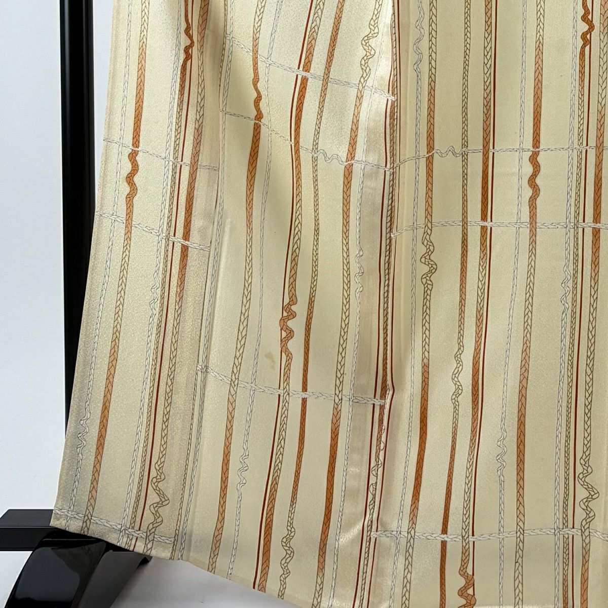 小紋 身丈164cm 裄丈65cm M 単衣 組紐 縞 ベージュ 化繊 優品