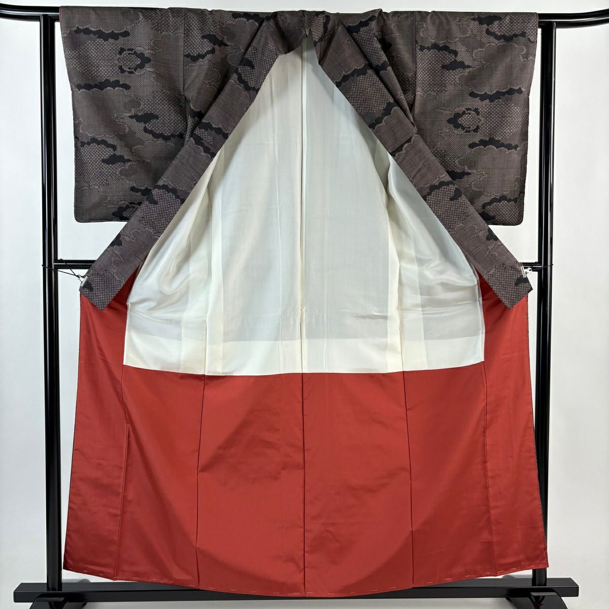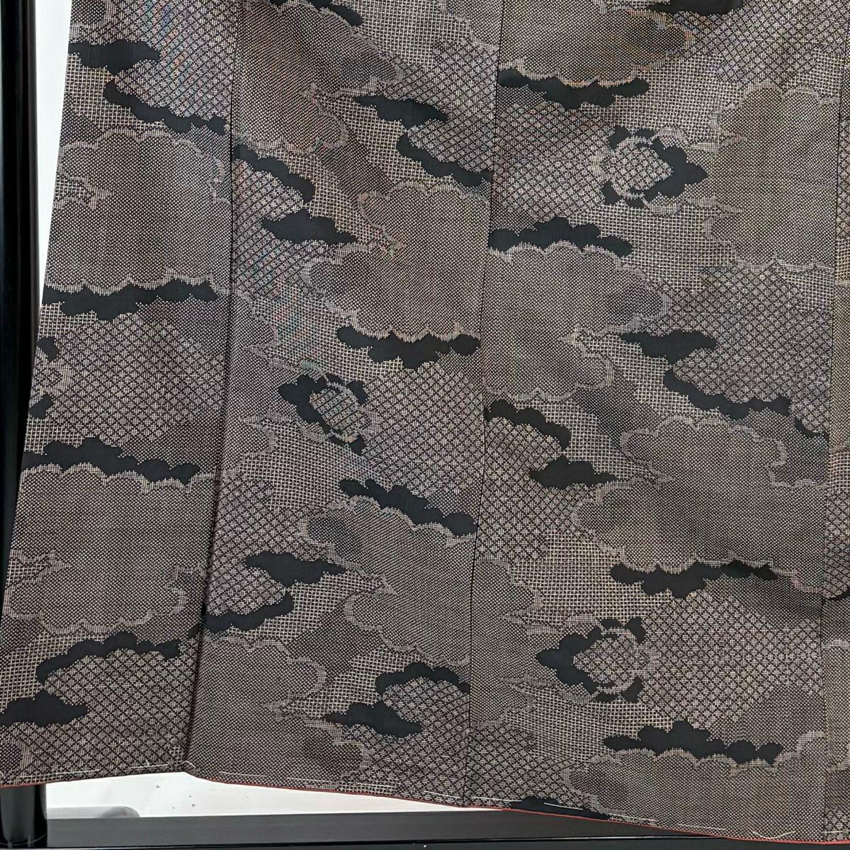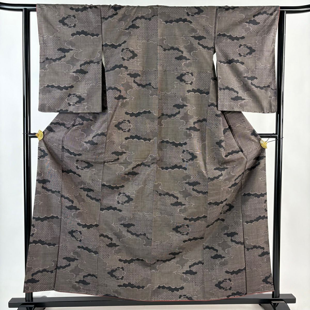 紬 身丈159cm 裄丈62.5cm S 袷 雲文 幾何学模様 茶紫 正絹 優品