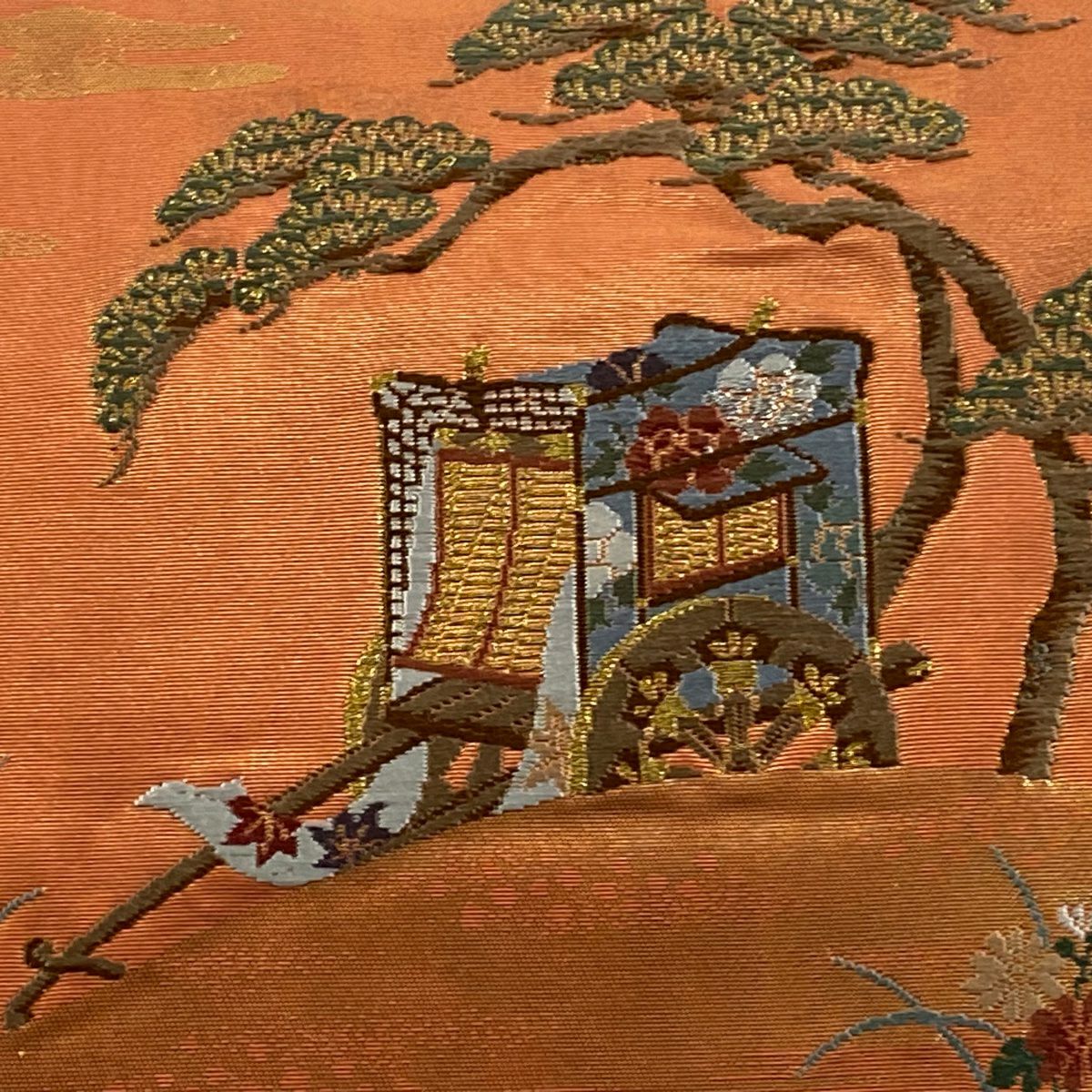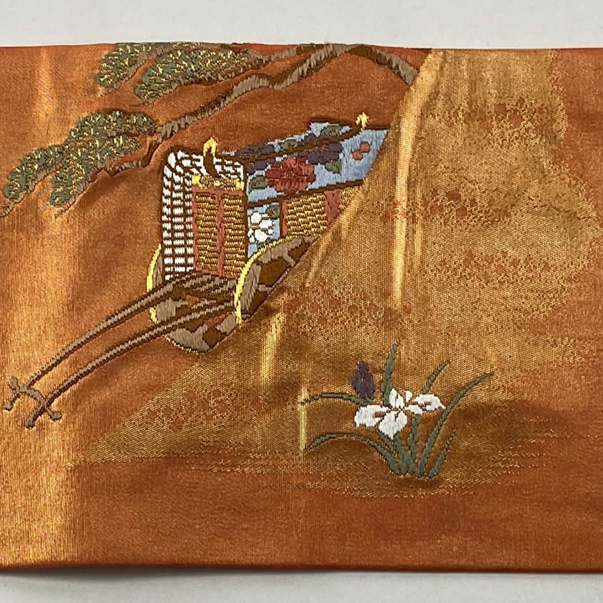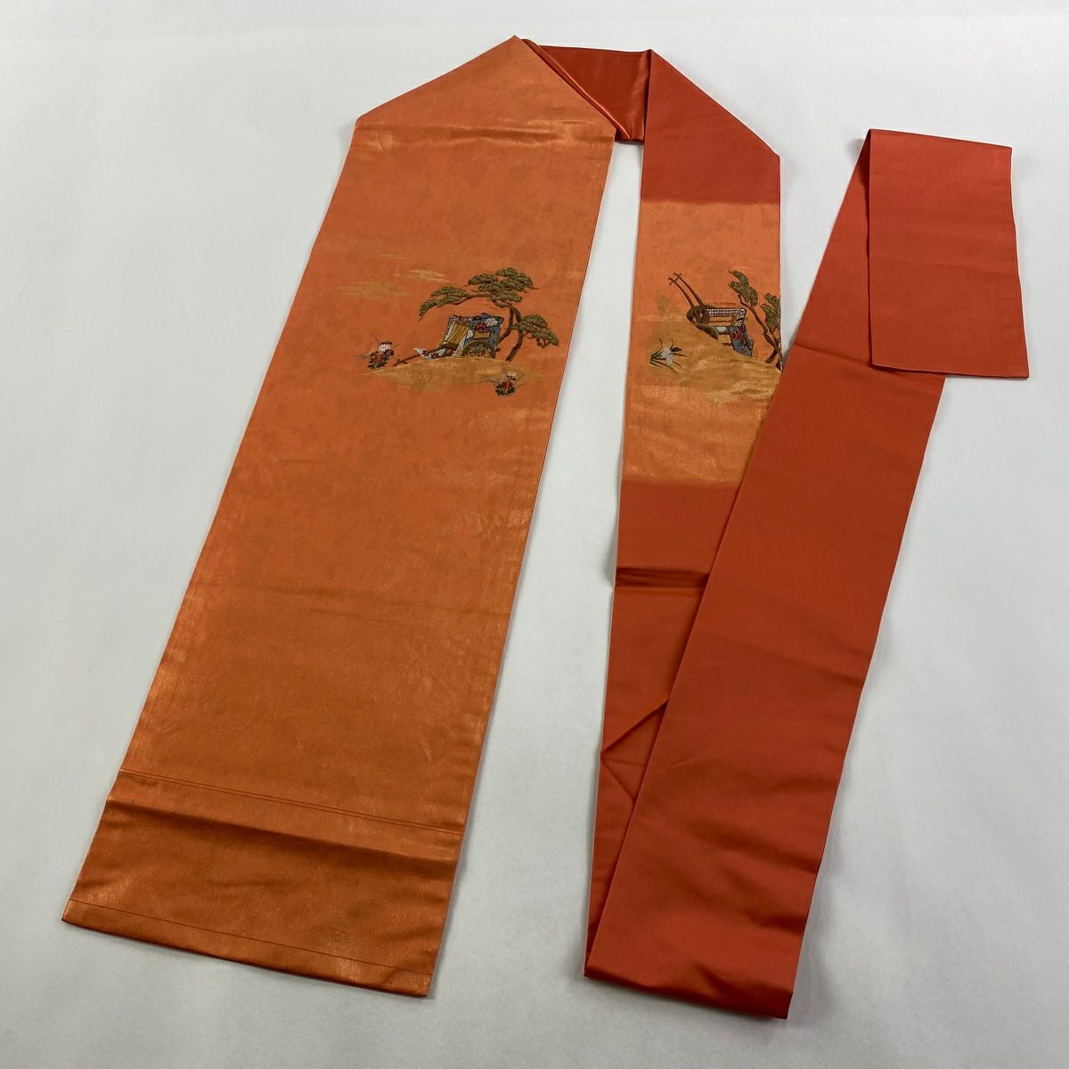 【在庫一掃】 名古屋帯 優品 関西仕立て 御所車 松 刺繍 金銀糸 朱色 正絹