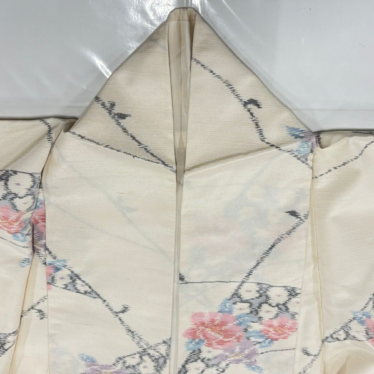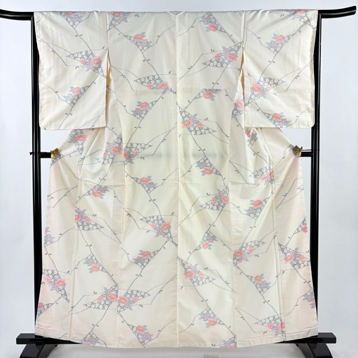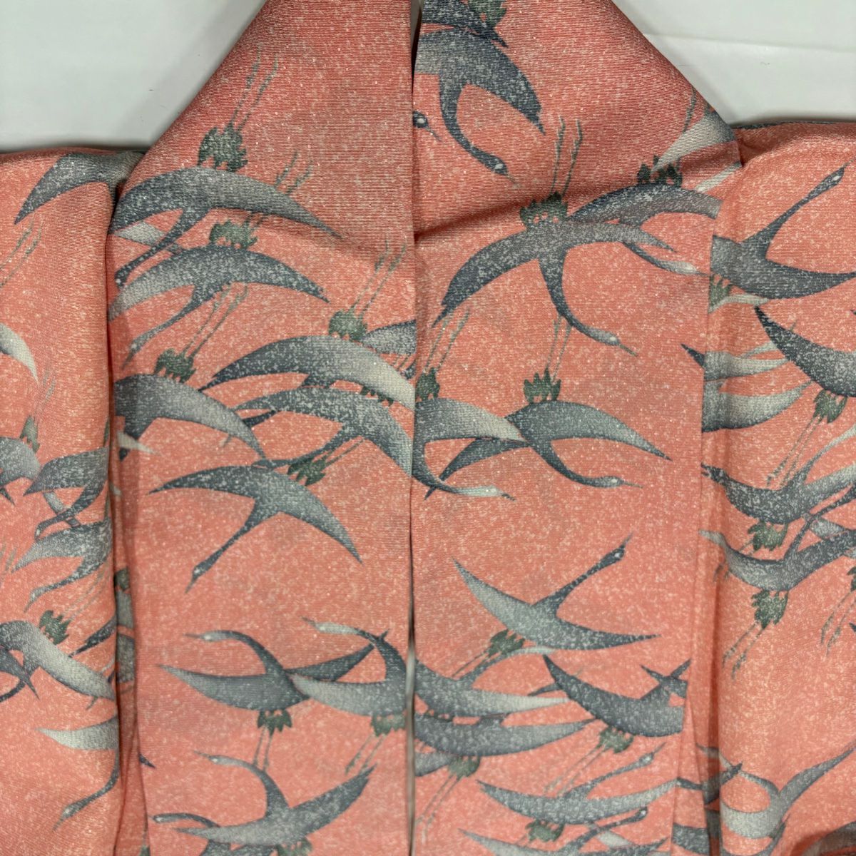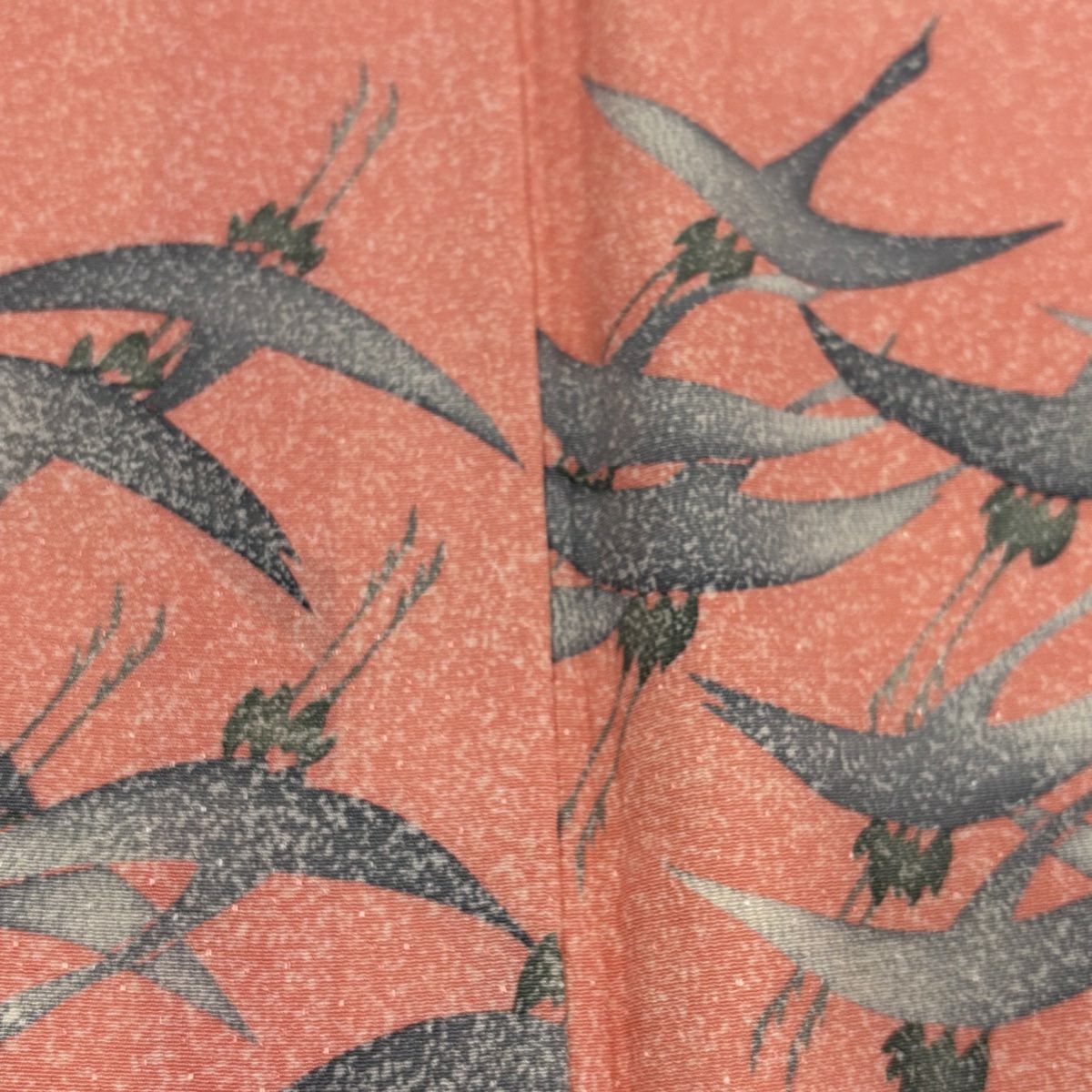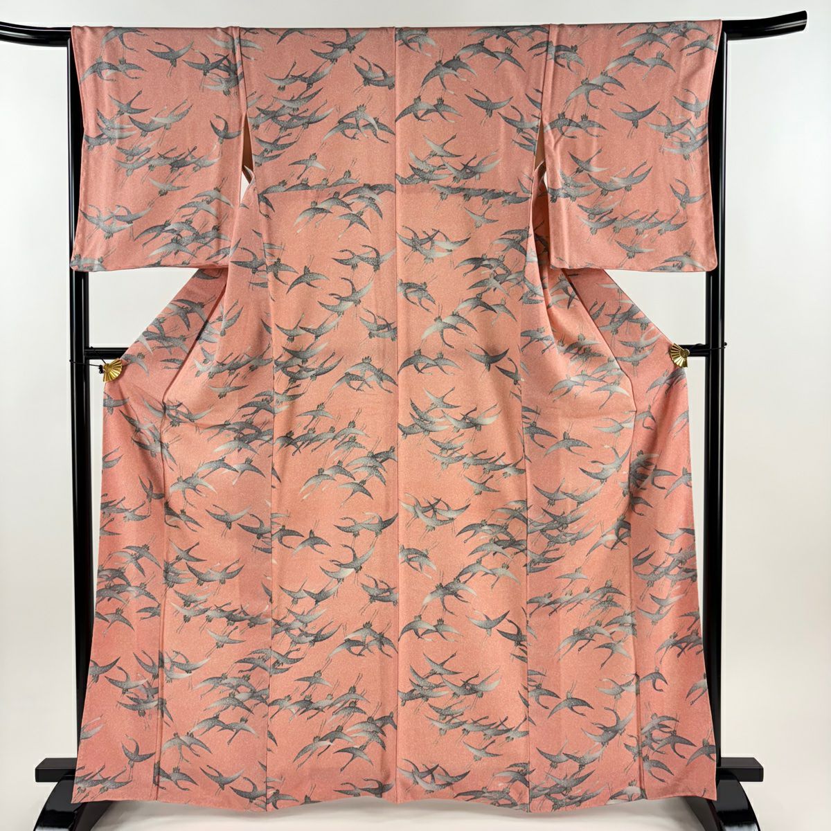 【美品】 小紋 身丈165cm 裄丈65cm M 袷 鶴 サーモンピンク 正絹 優品