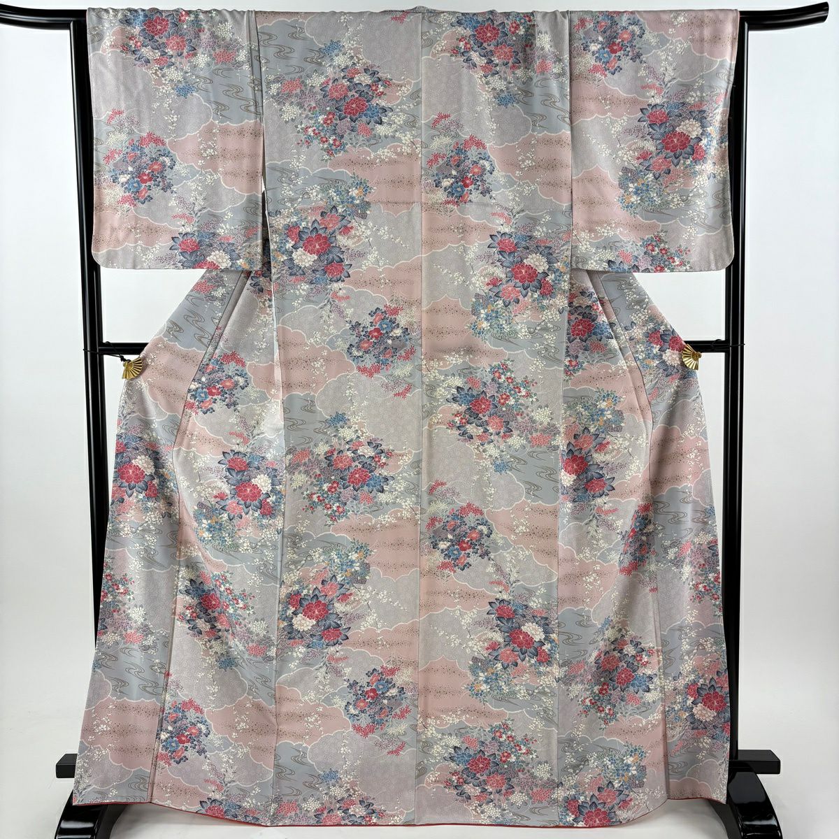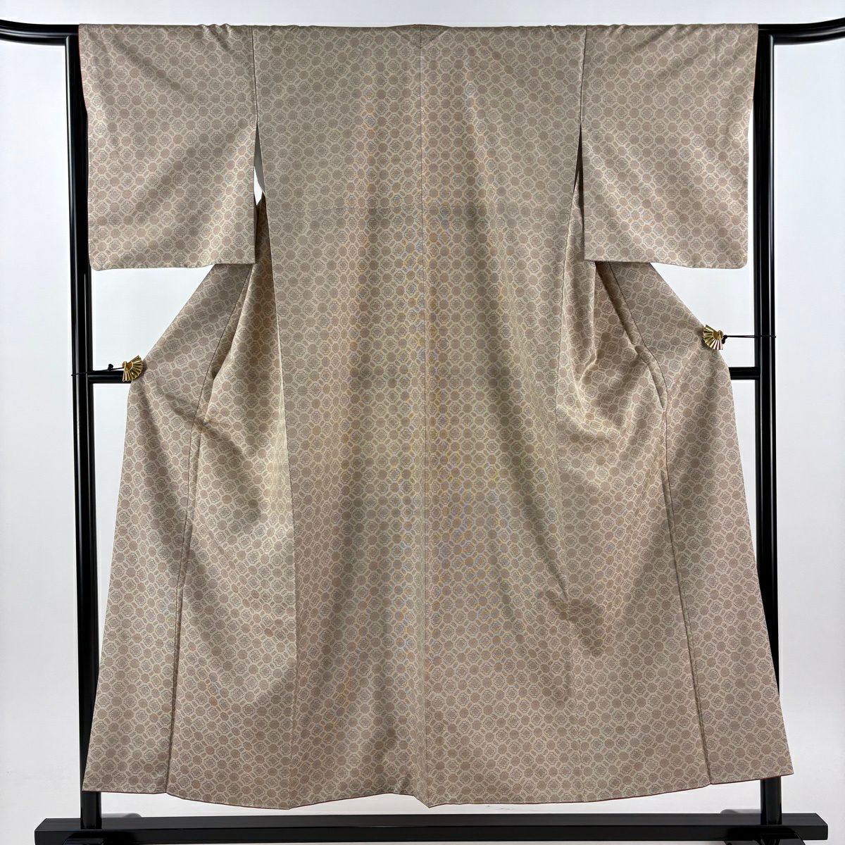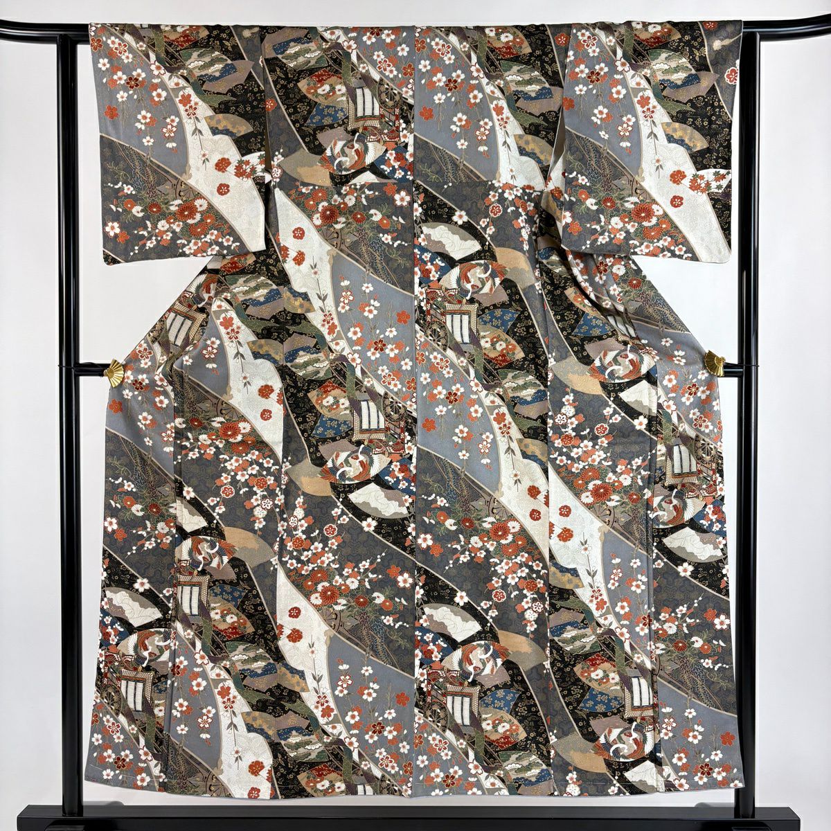 小紋 身丈153.5cm 裄丈62cm S 袷 御所車 花鳥 金彩 灰色 正絹 優品