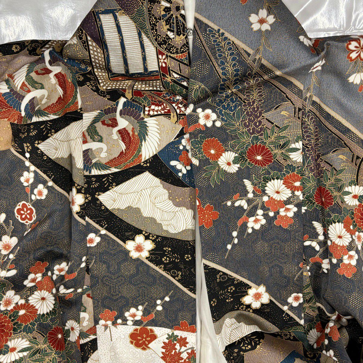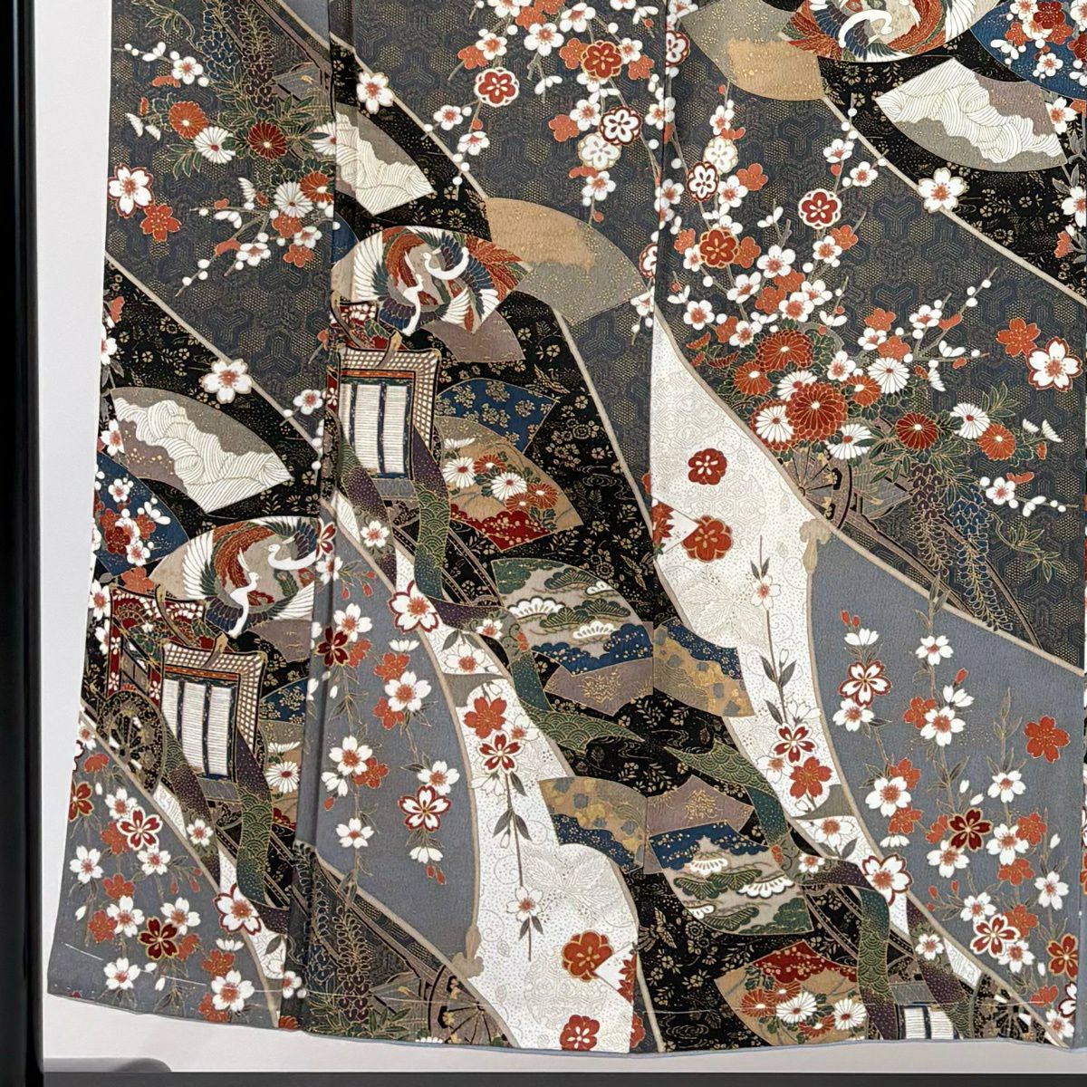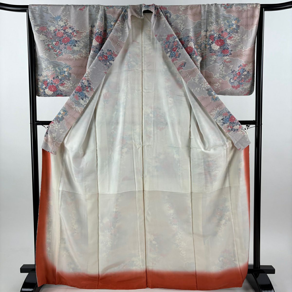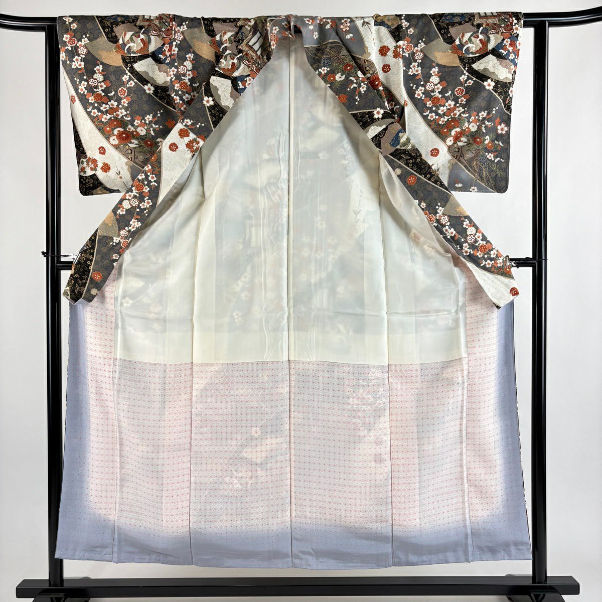 小紋 身丈153.5cm 裄丈62cm S 袷 御所車 花鳥 金彩 灰色 正絹 優品