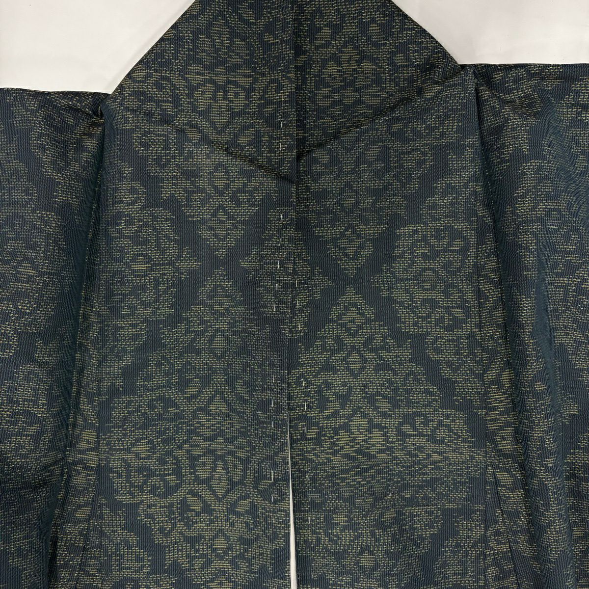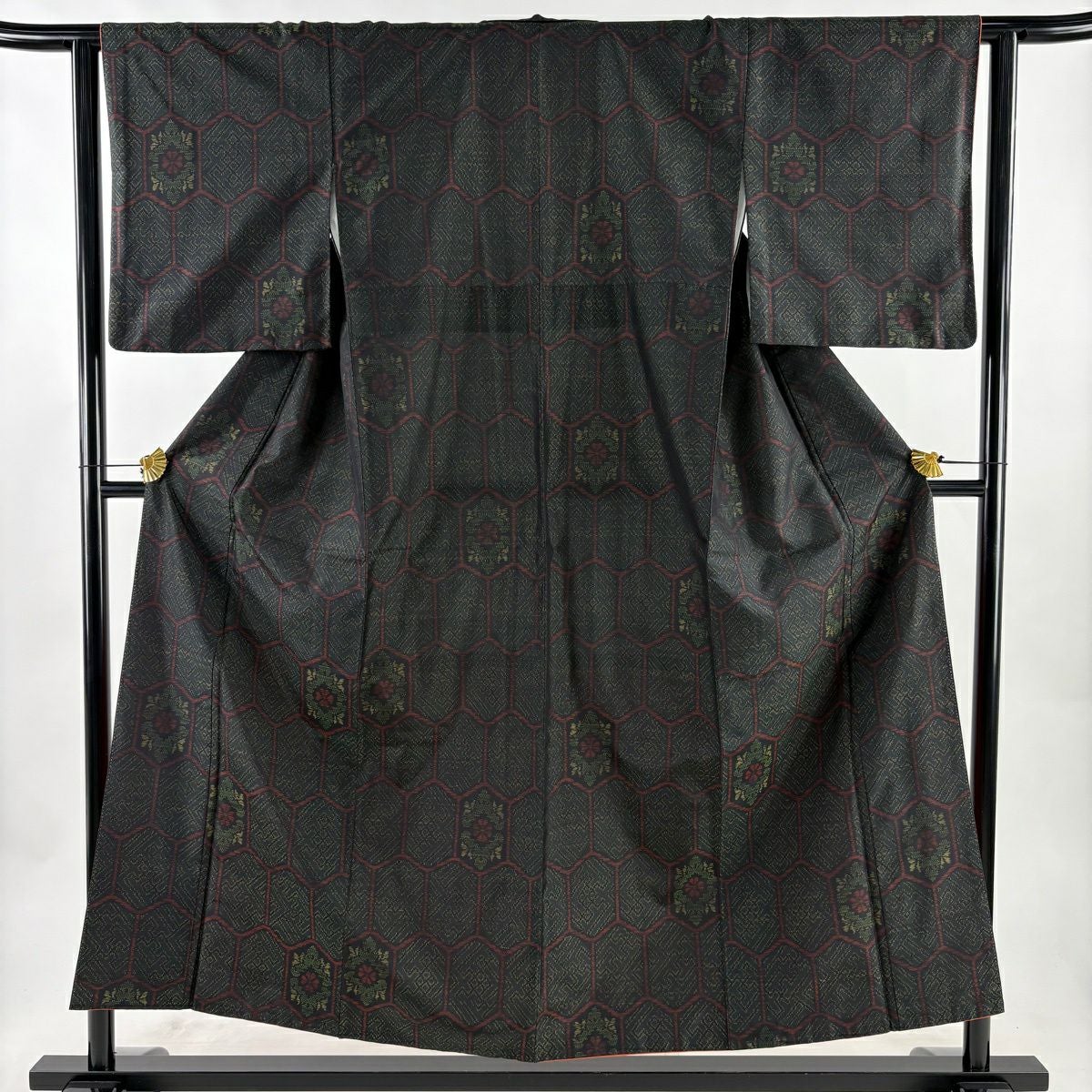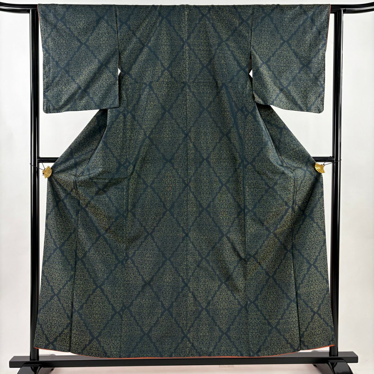 【美品】 紬 身丈153cm 裄丈62.5cm S 袷 華文 亀甲 深緑 正絹 優品