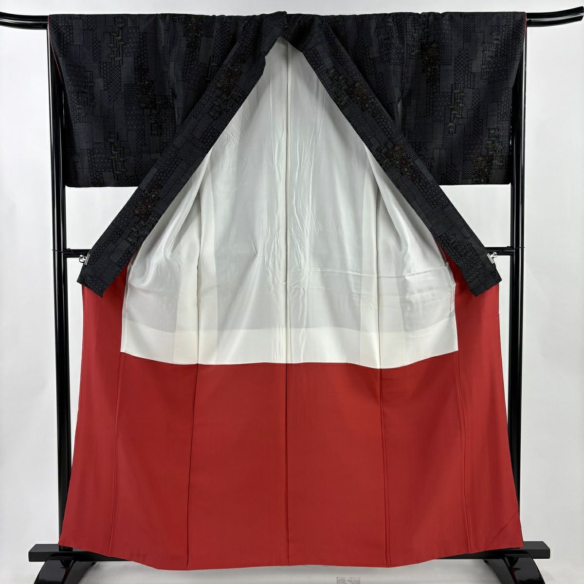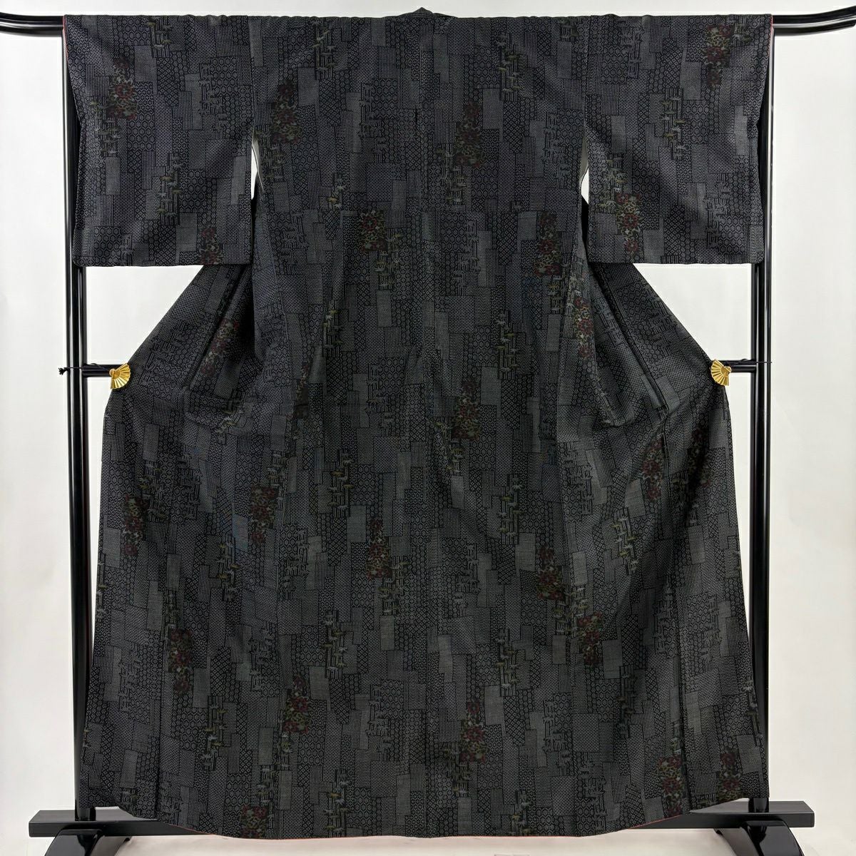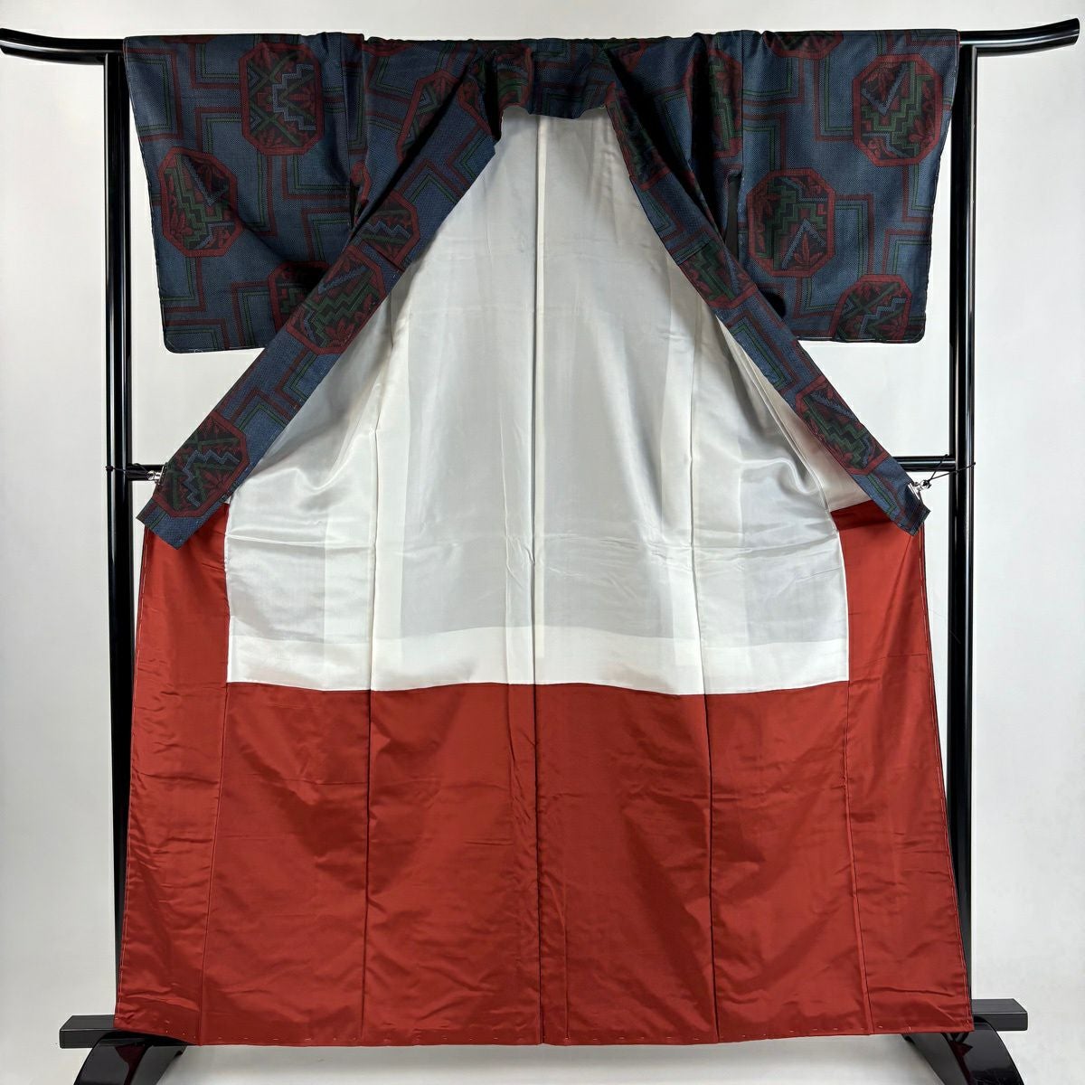小紋 身丈156.5cm 裄丈64cm M 袷 草花 幾何学 縮緬 紺色 正絹 優品