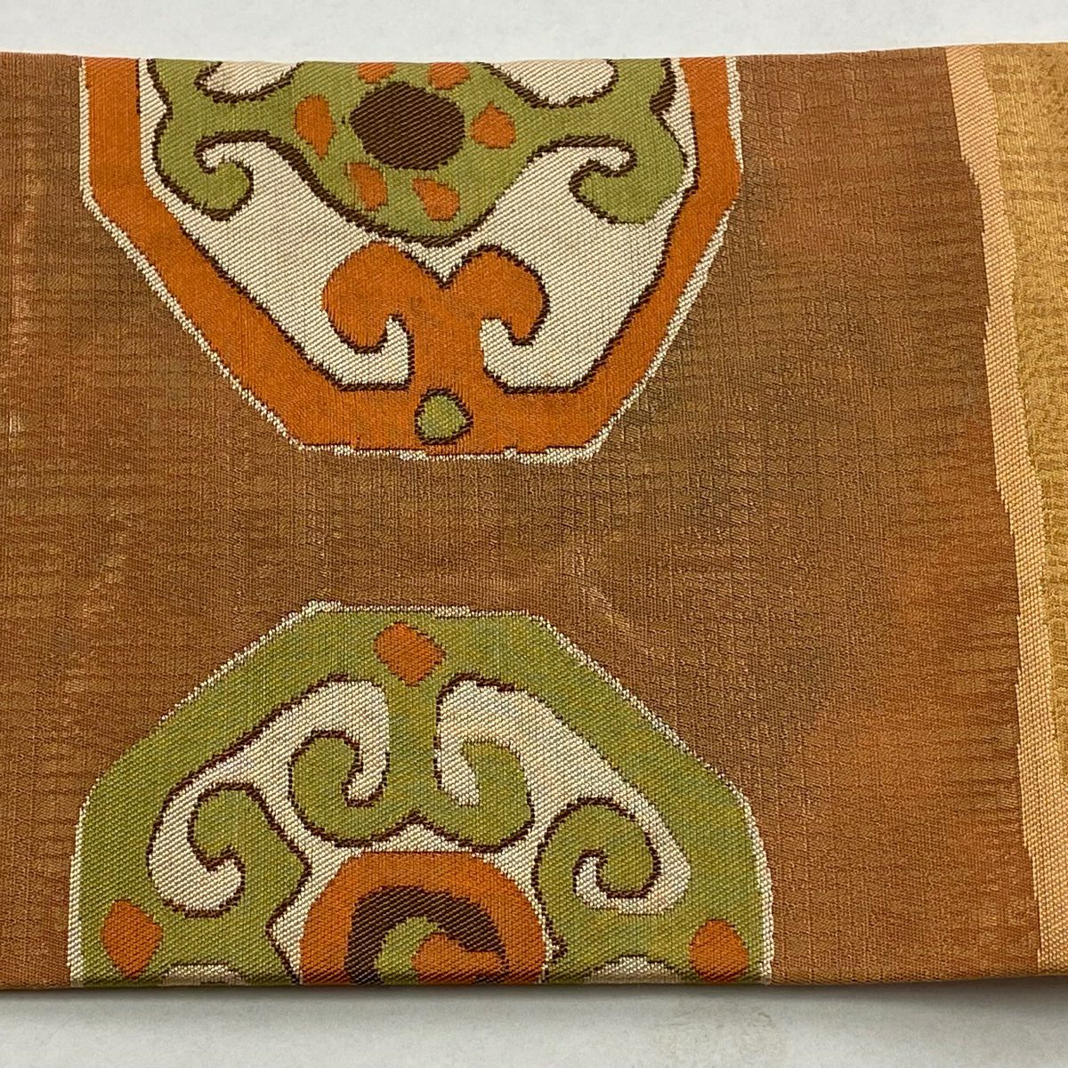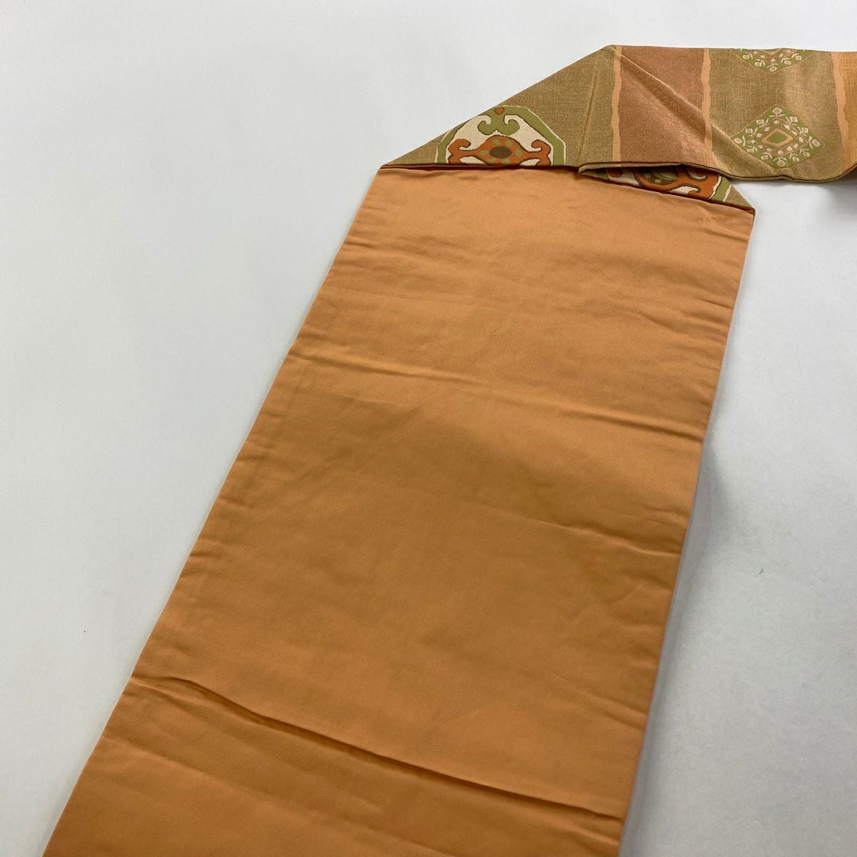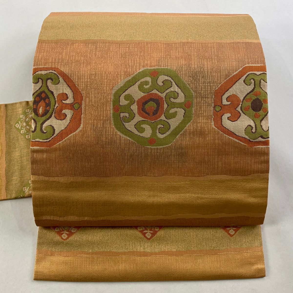 【在庫一掃】 名古屋帯 優品 関西仕立て 幾何学模様 草花 箔 オレンジ 正絹
