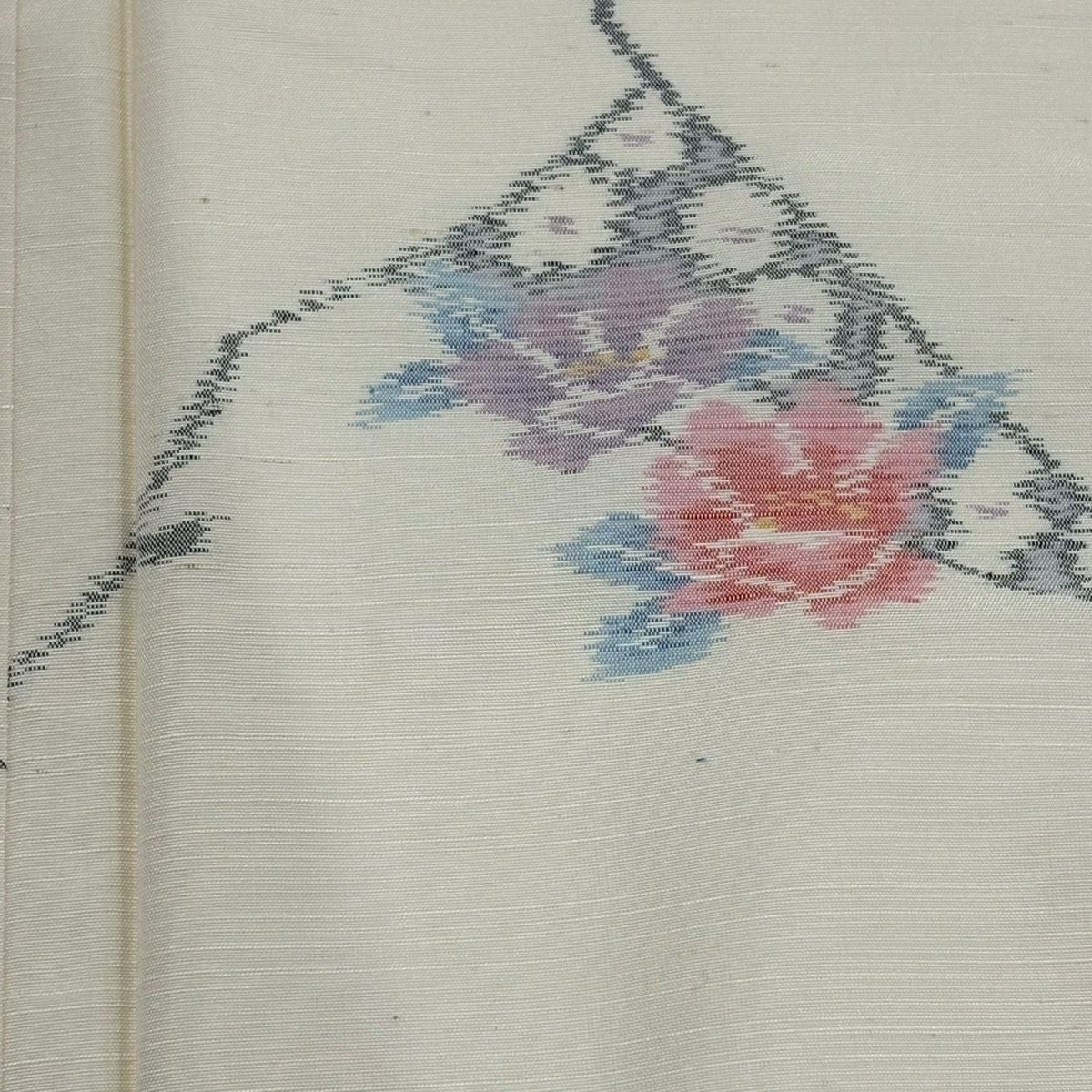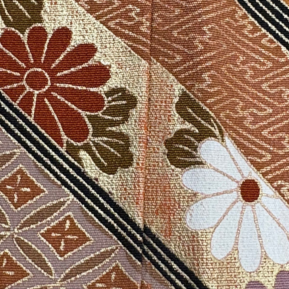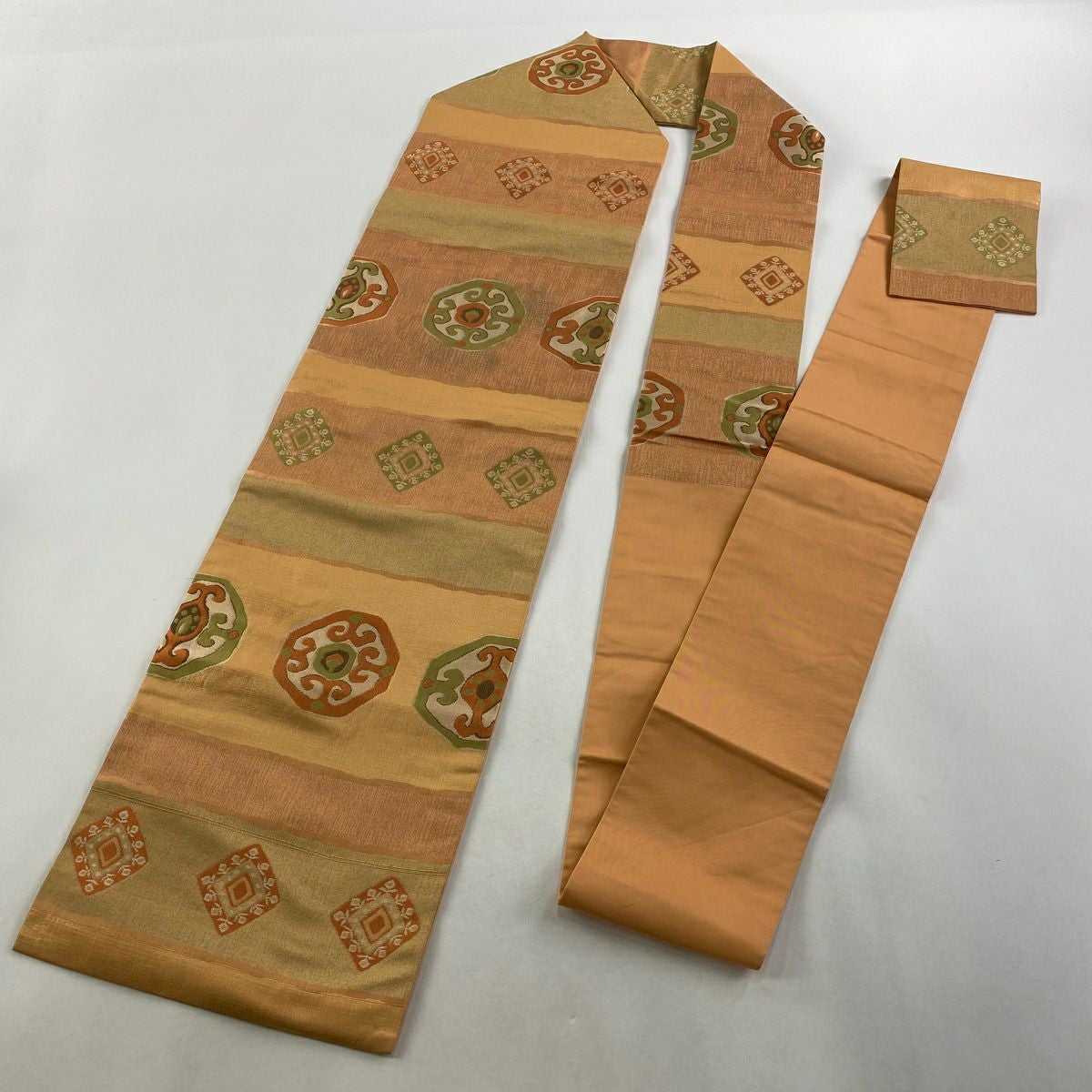 【在庫一掃】 名古屋帯 優品 関西仕立て 幾何学模様 草花 箔 オレンジ 正絹