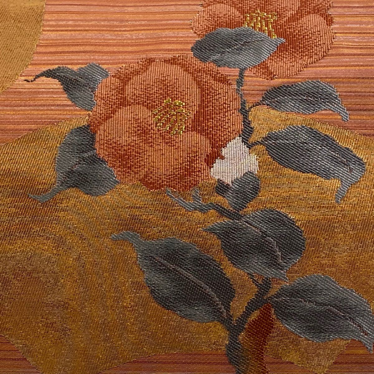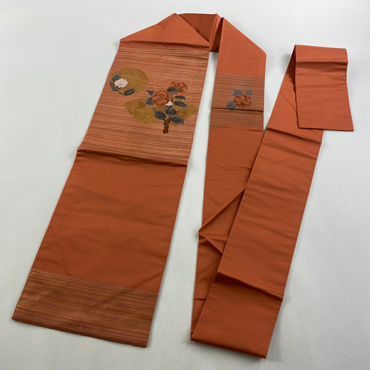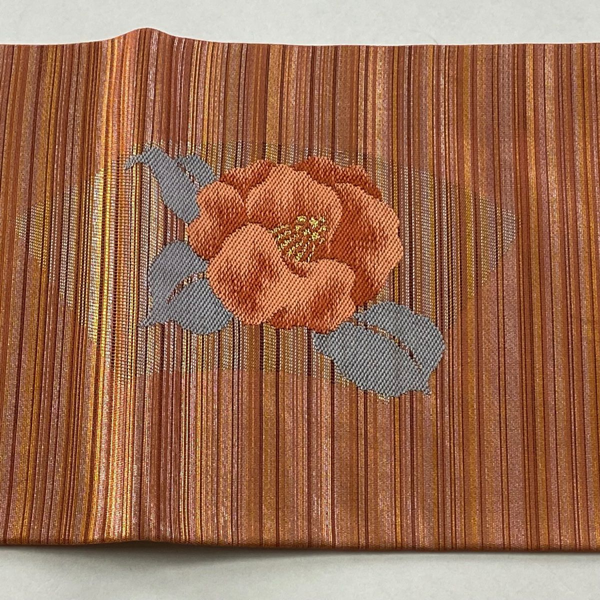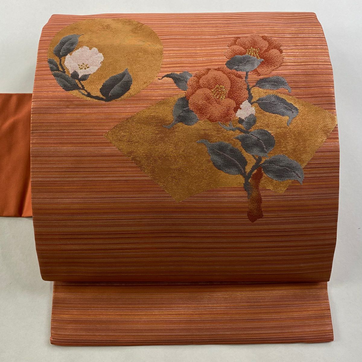 【在庫一掃】 【美品】 名古屋帯 優品 椿 扇面 金糸 箔 サーモンピンク 正絹