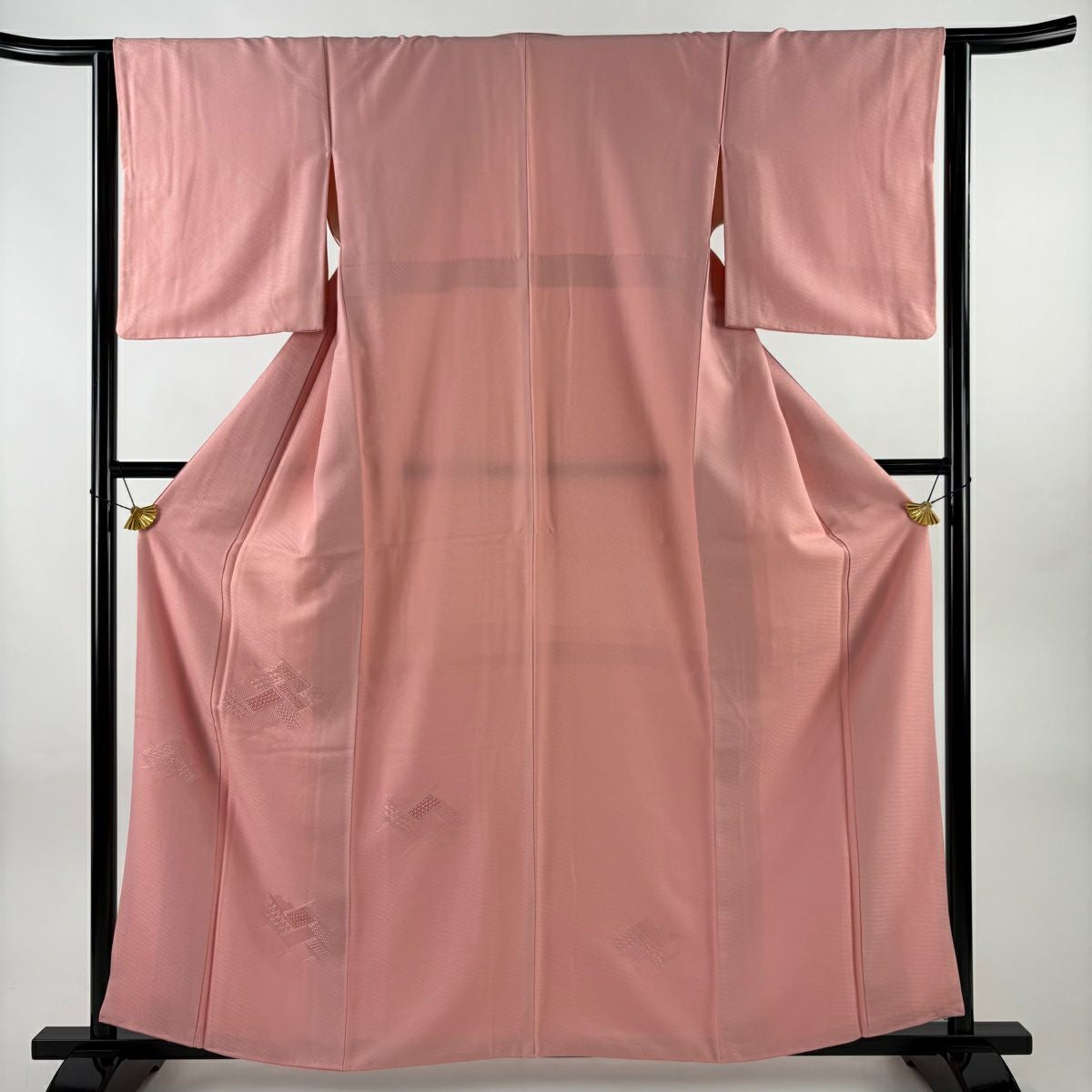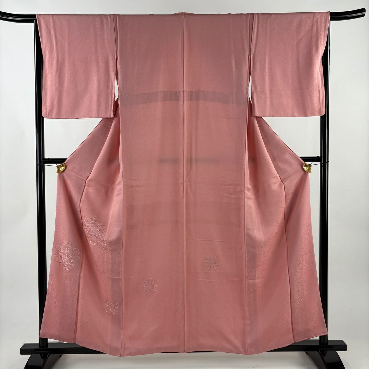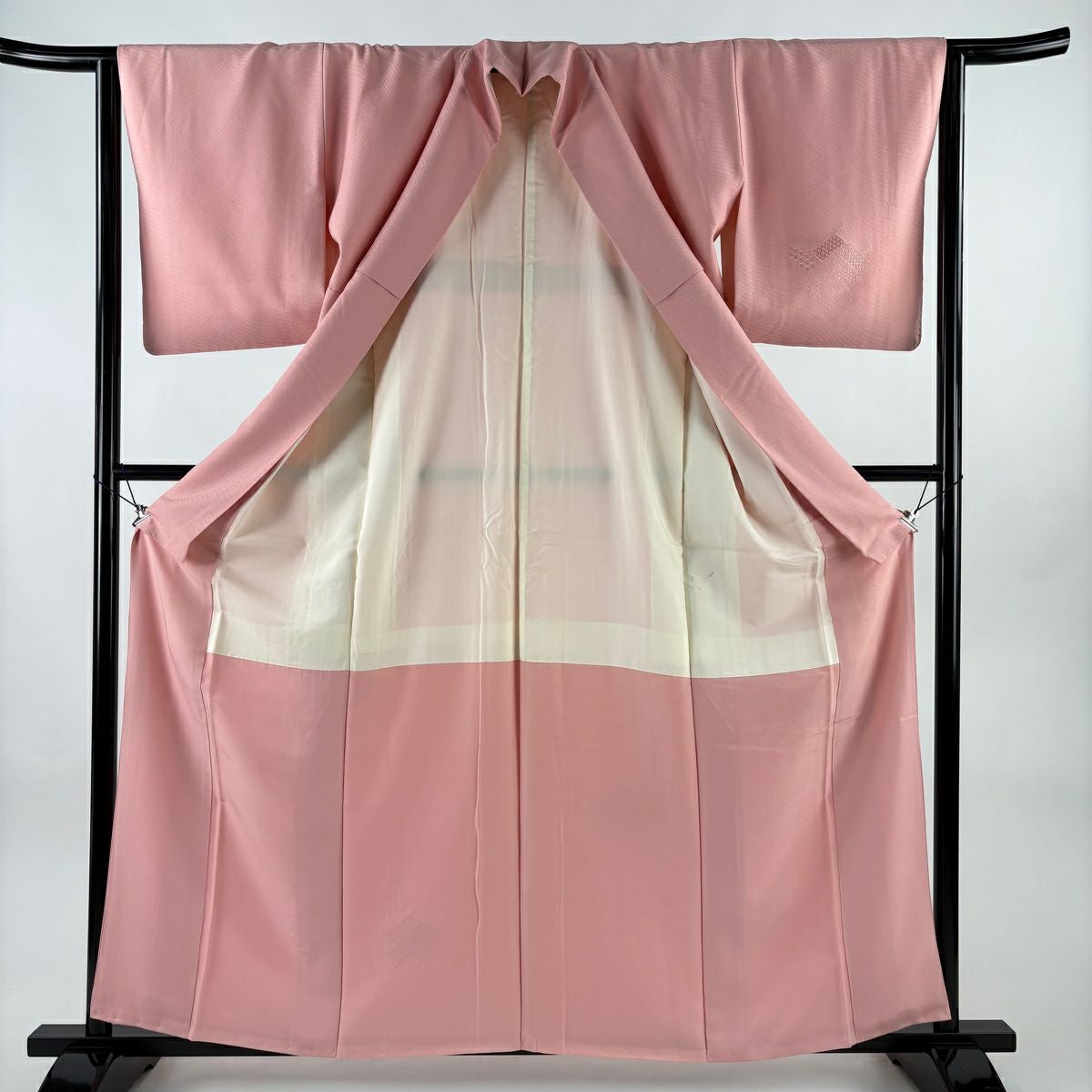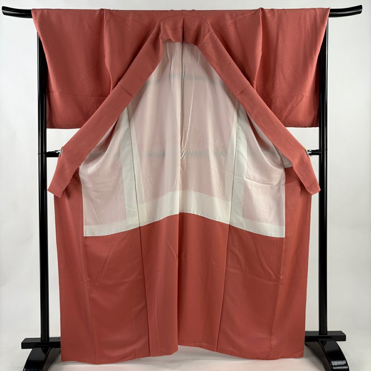 色無地 身丈164.5cm 裄丈70.5cm L 袷 地紋 サーモンピンク 正絹 優品 一つ紋