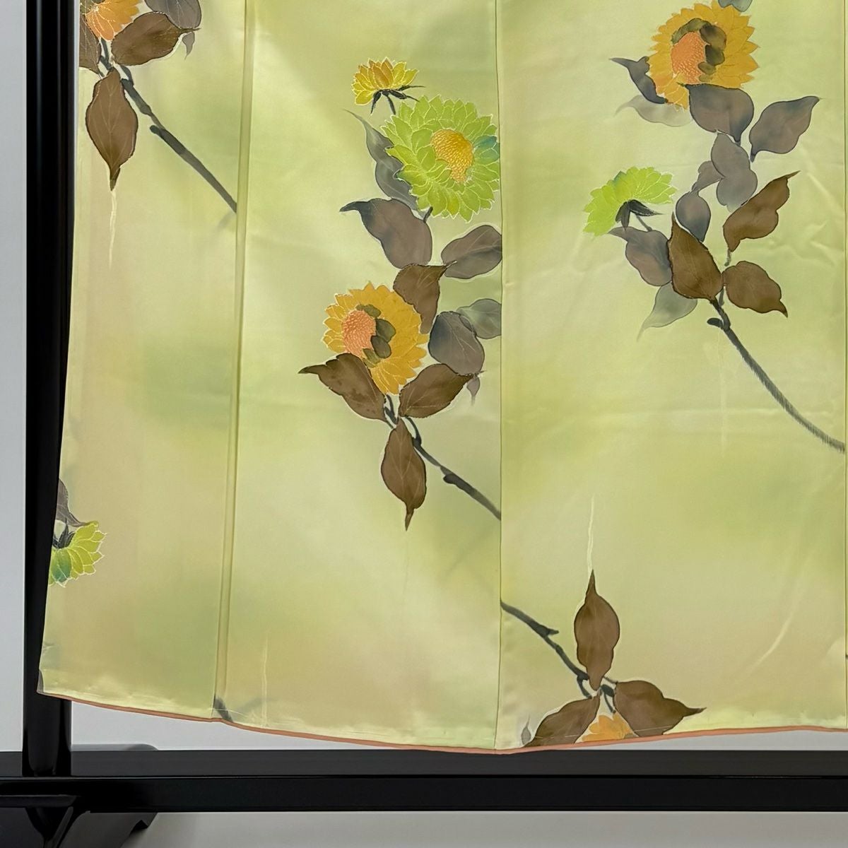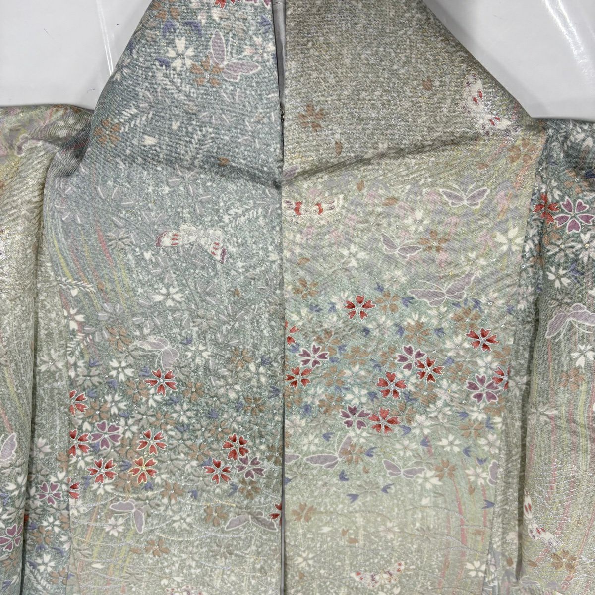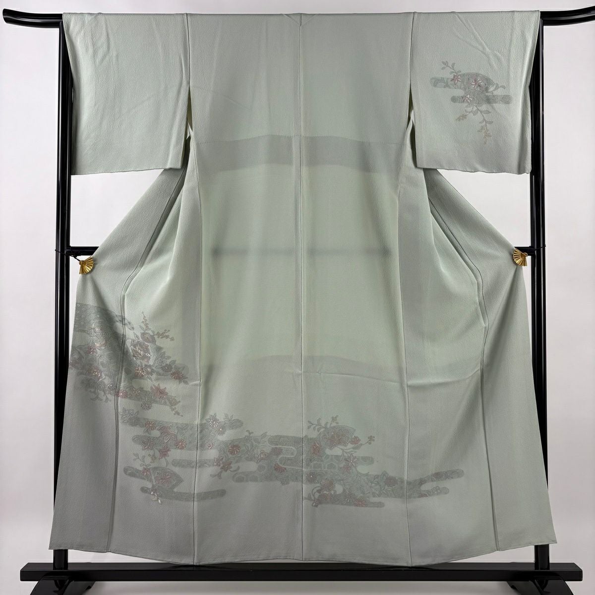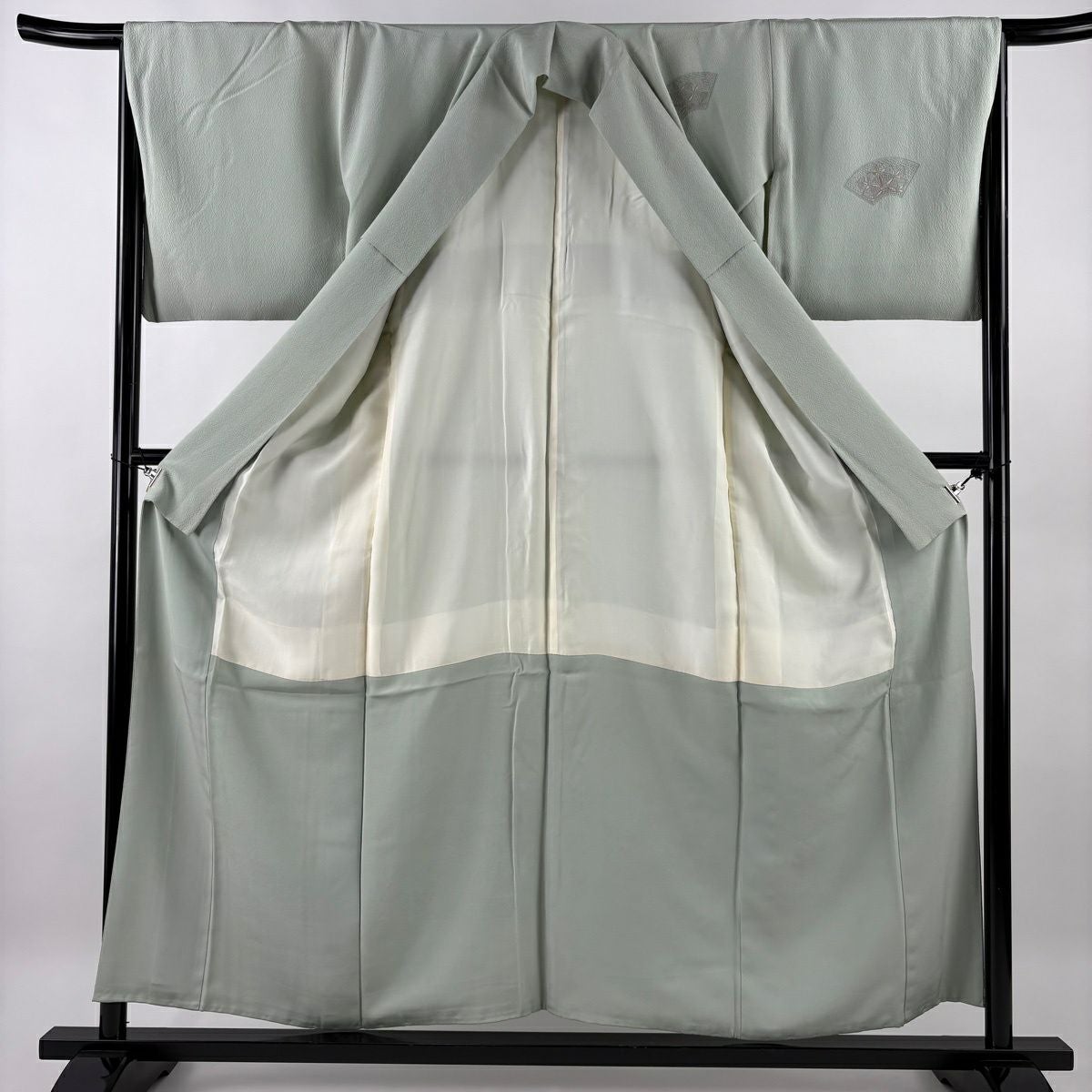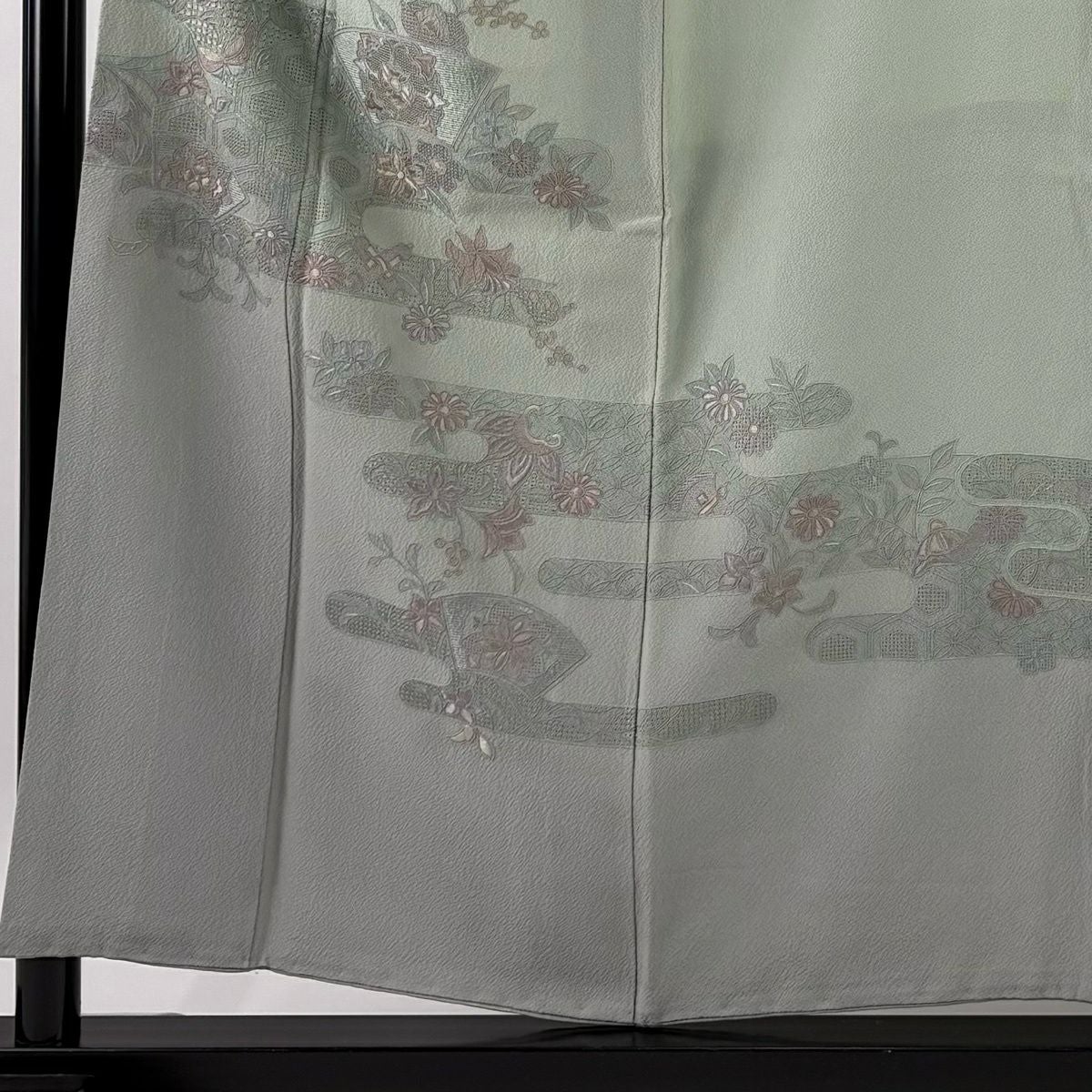 付下げ 身丈157cm 裄丈65.5cm M 袷 扇面 ヱ霞 刺繍 ぼかし 薄緑 正絹 優品