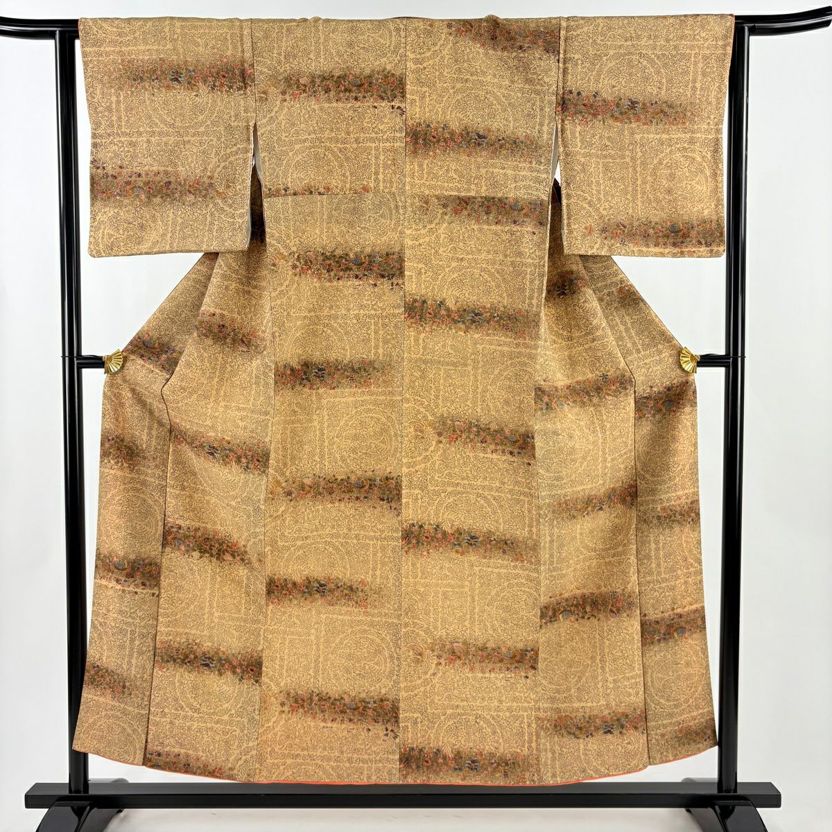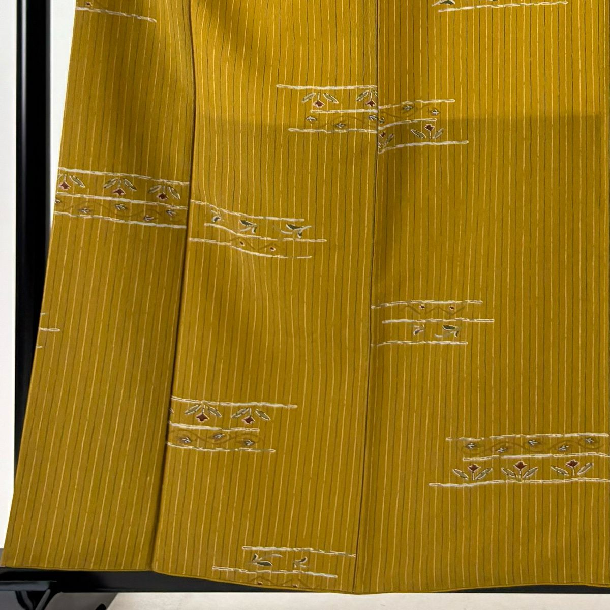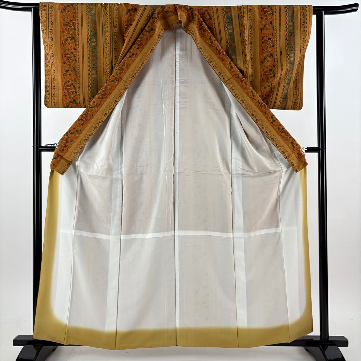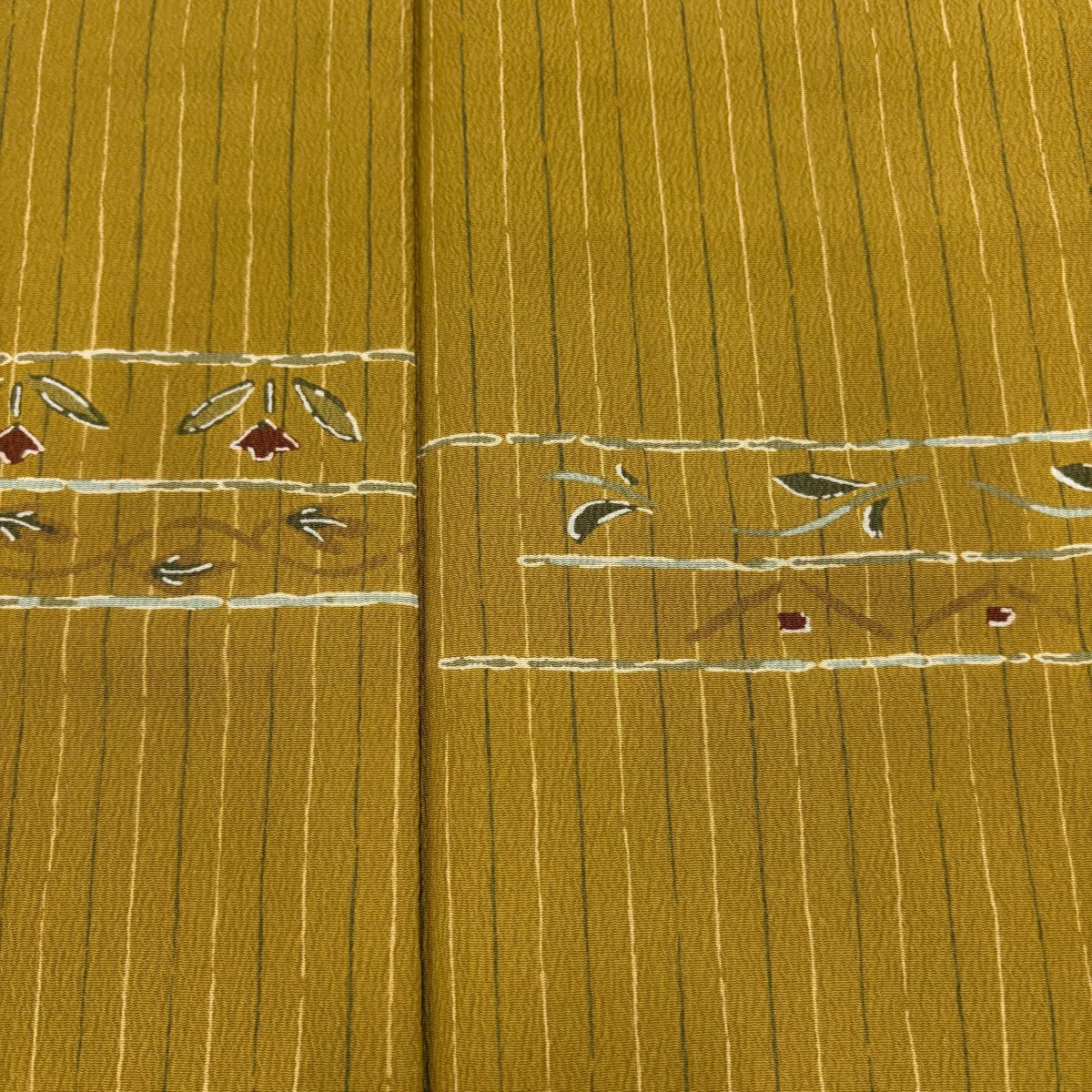 小紋 身丈159cm 裄丈64cm M 袷 さんび 洗える着物 草花 縞 黄土色 化繊 優品