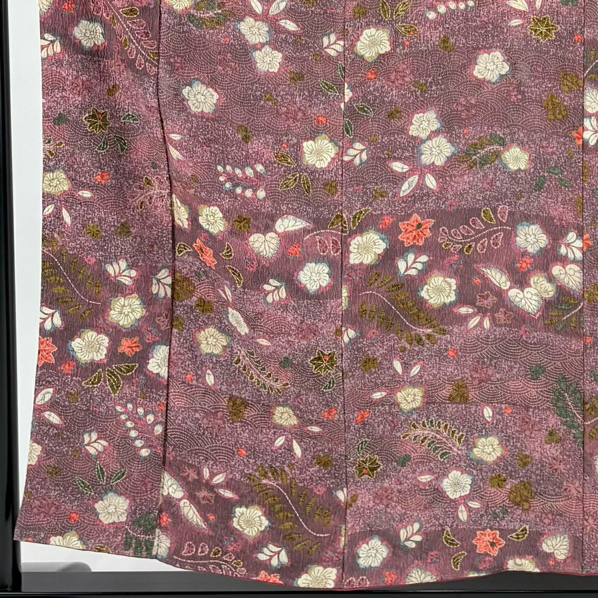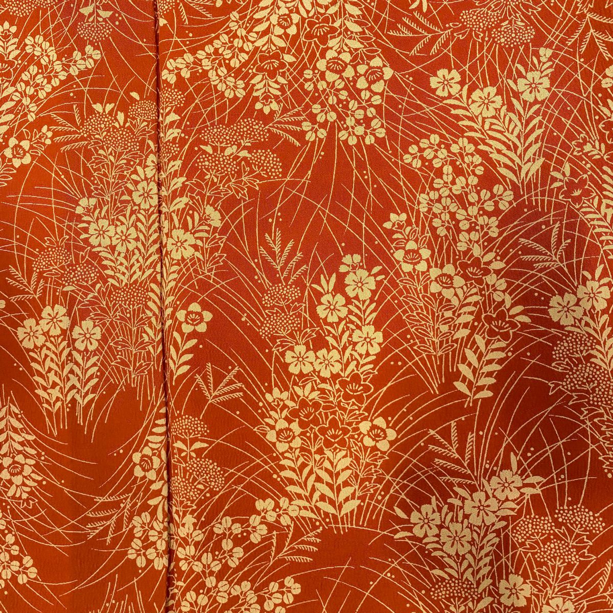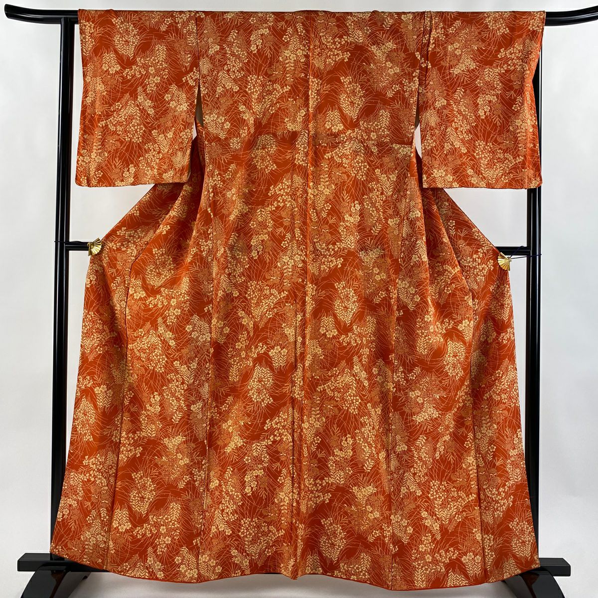 【在庫一掃】 小紋 身丈160cm 裄丈65.5cm M 袷 秋草 縮緬 朱色 正絹 優品