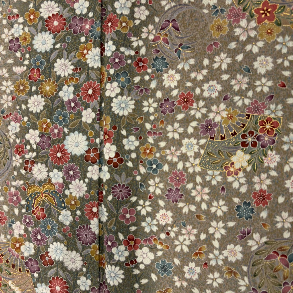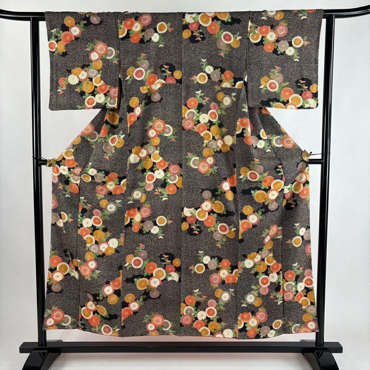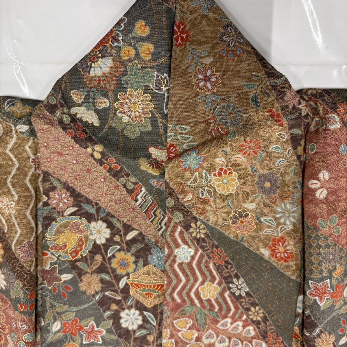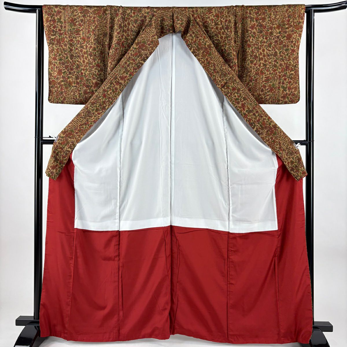 【美品】 小紋 身丈157cm 裄丈64cm M 袷 草花 有職文様 金彩 茶色 正絹 優品