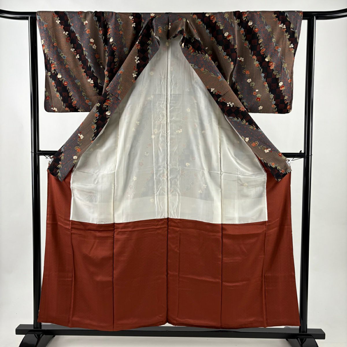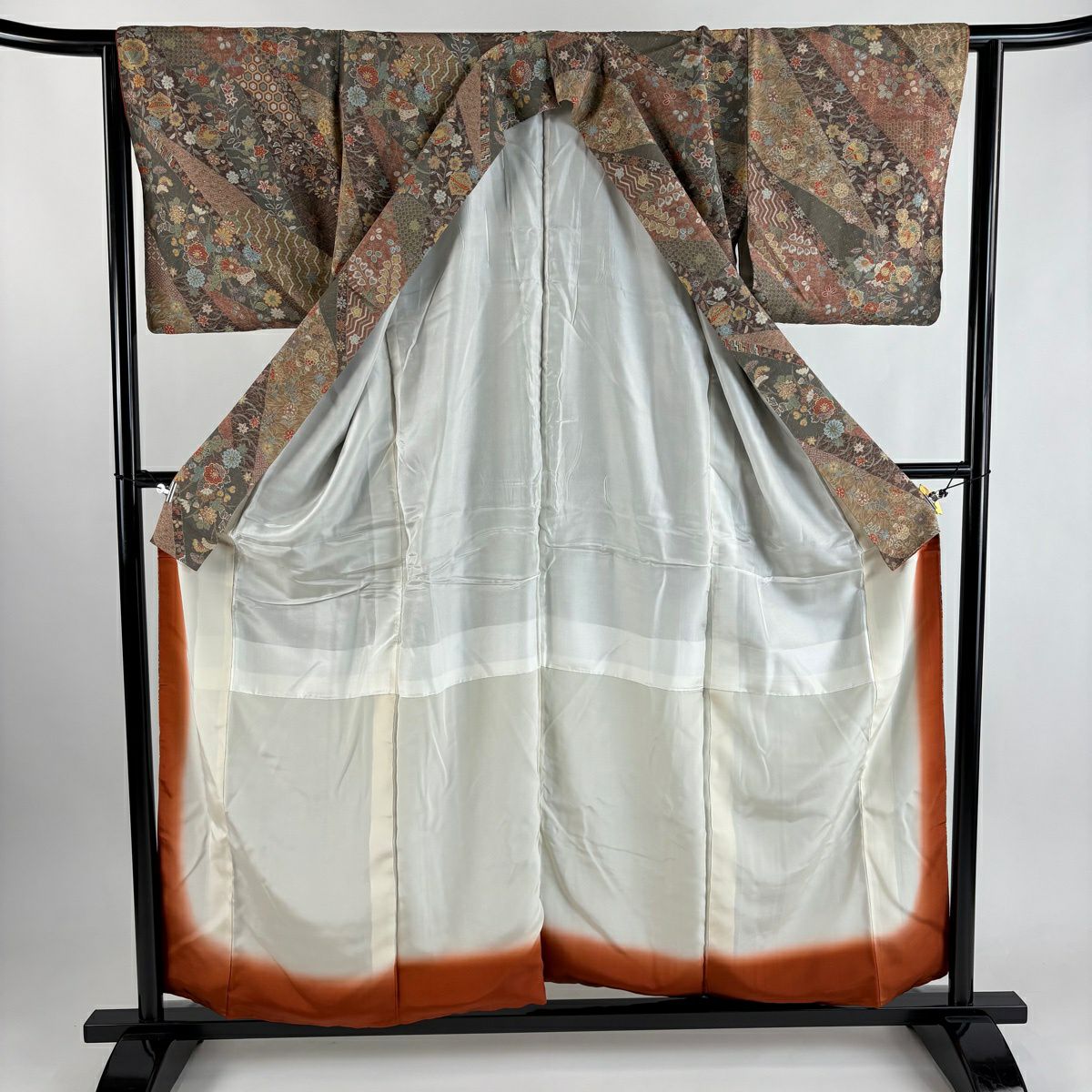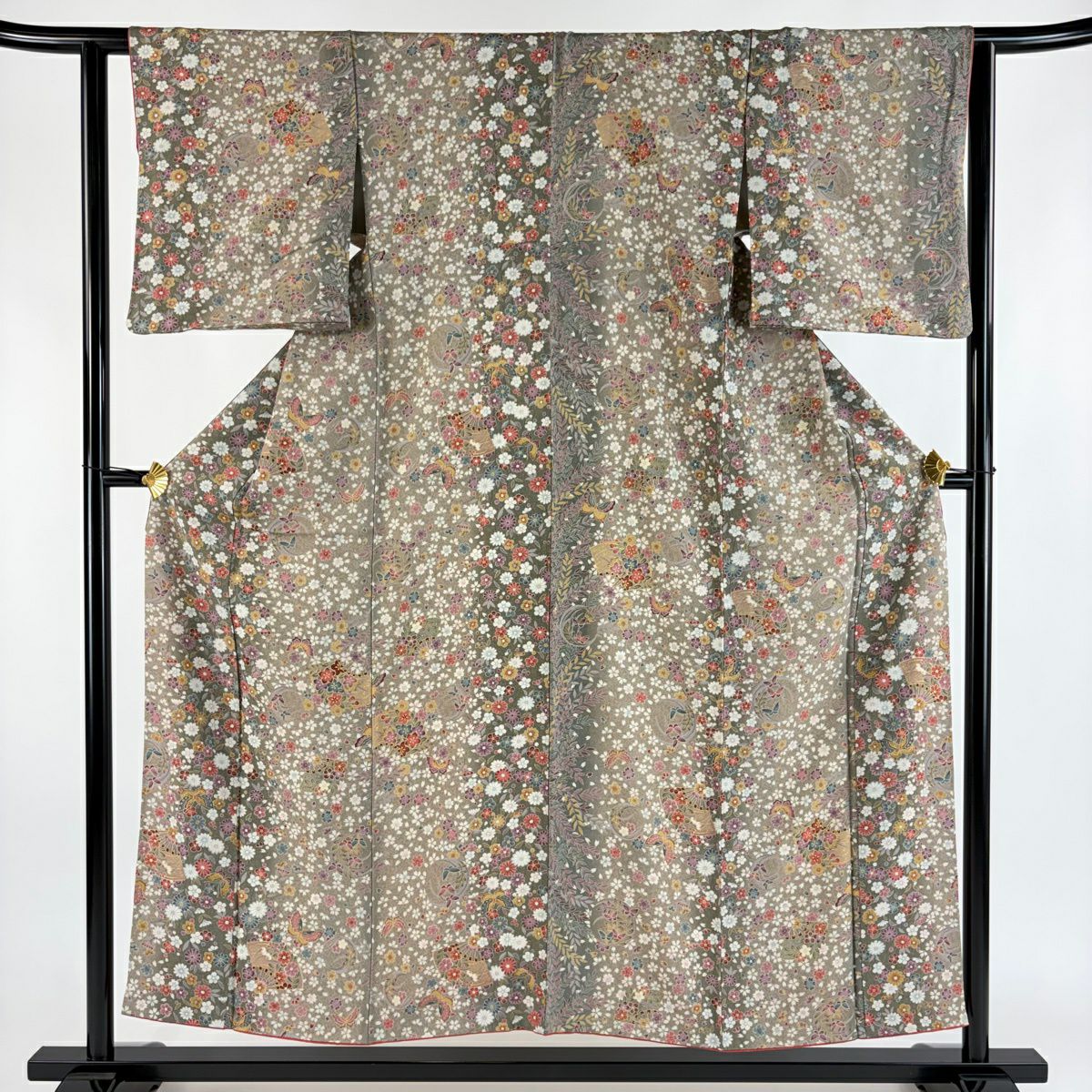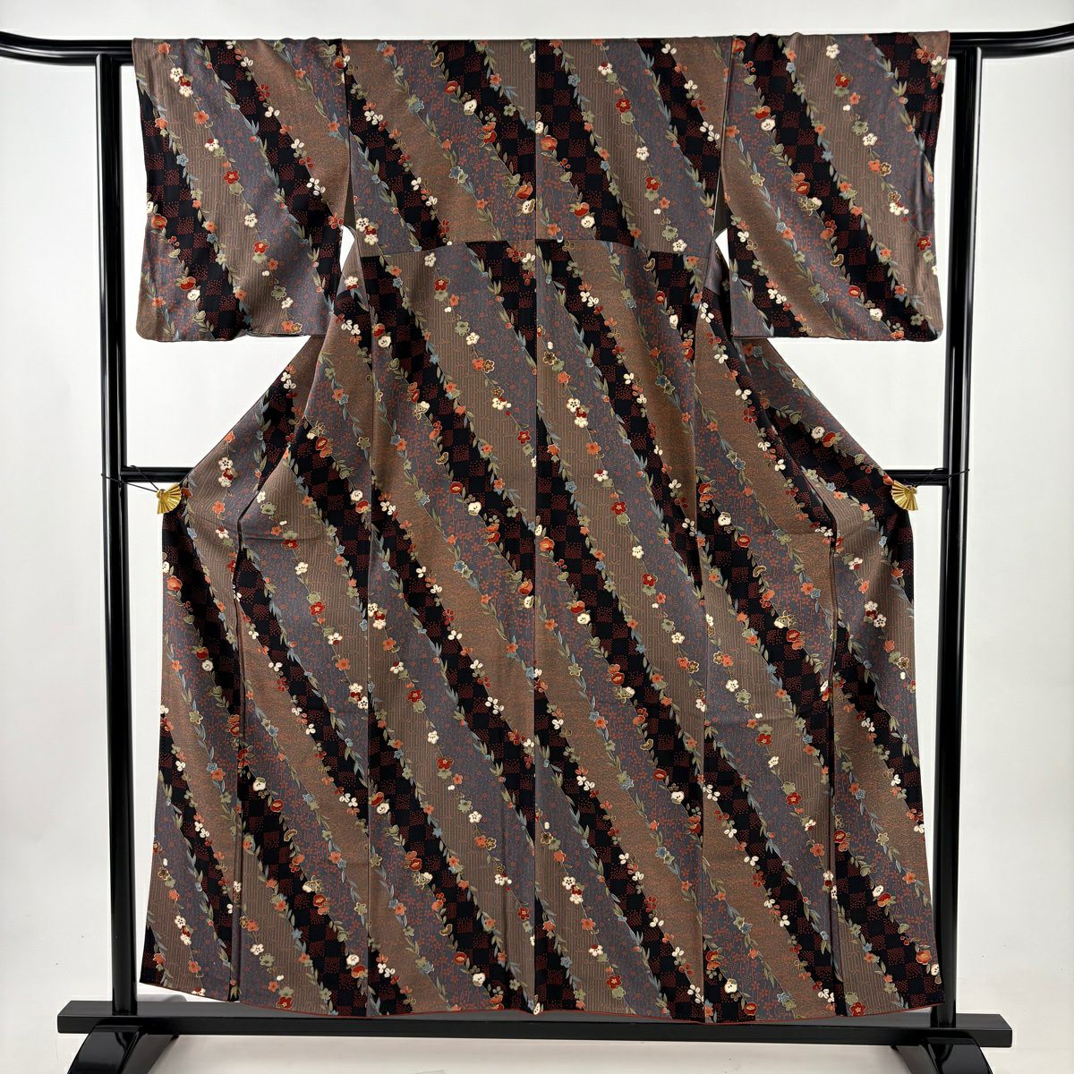 【美品】 小紋 身丈158cm 裄丈61.5cm S 袷 草花 斜縞 金彩 灰茶 正絹 優品