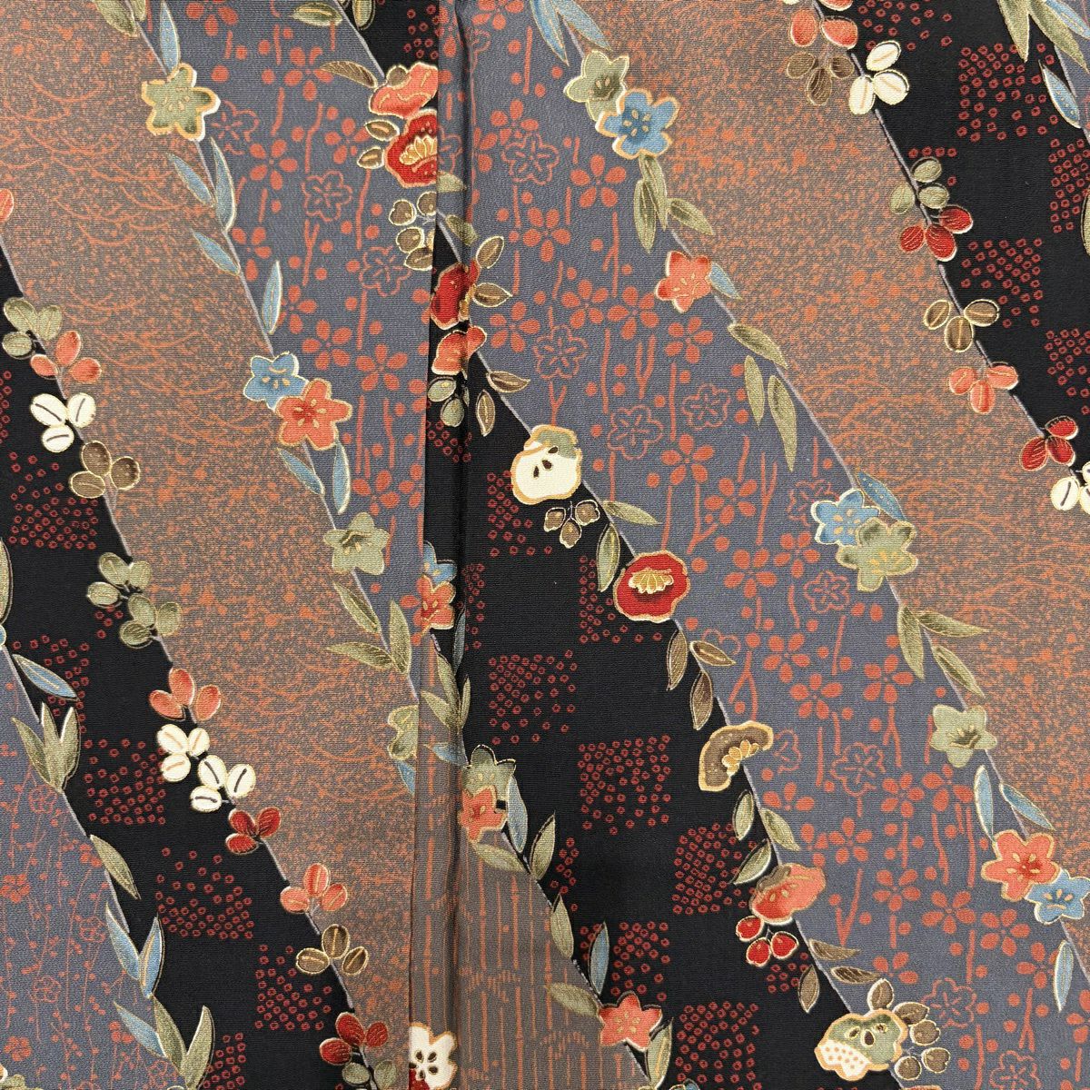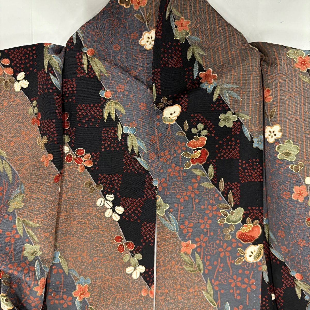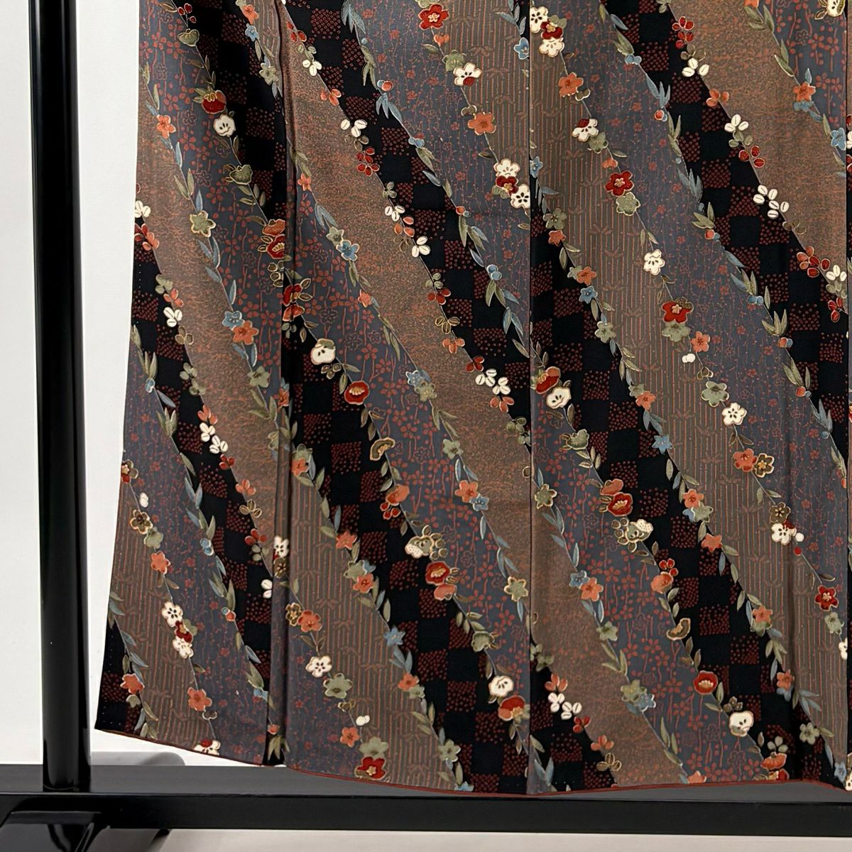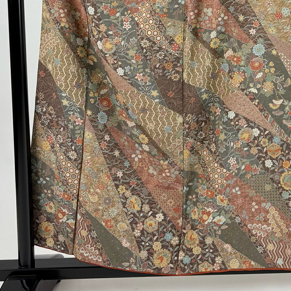 【美品】 小紋 身丈158cm 裄丈61.5cm S 袷 草花 斜縞 金彩 灰茶 正絹 優品