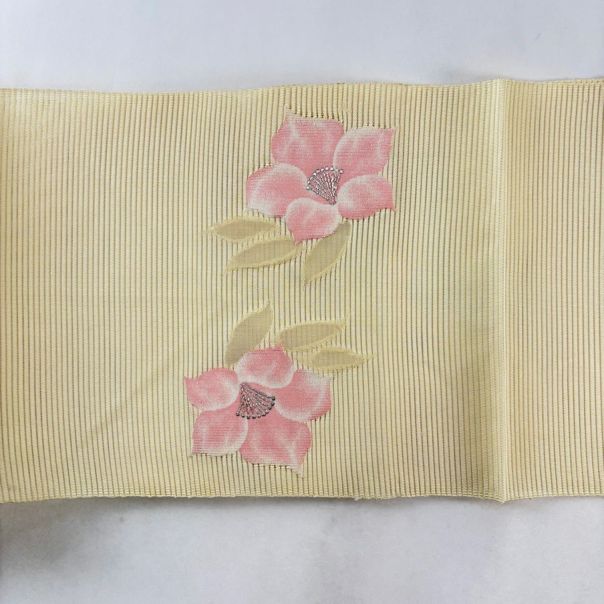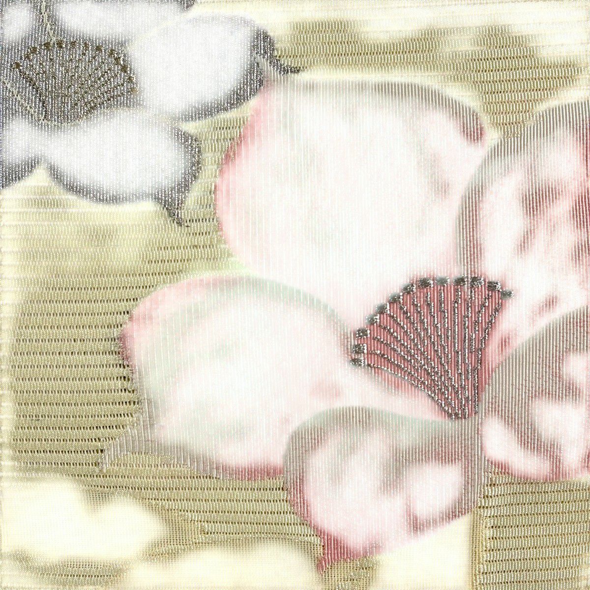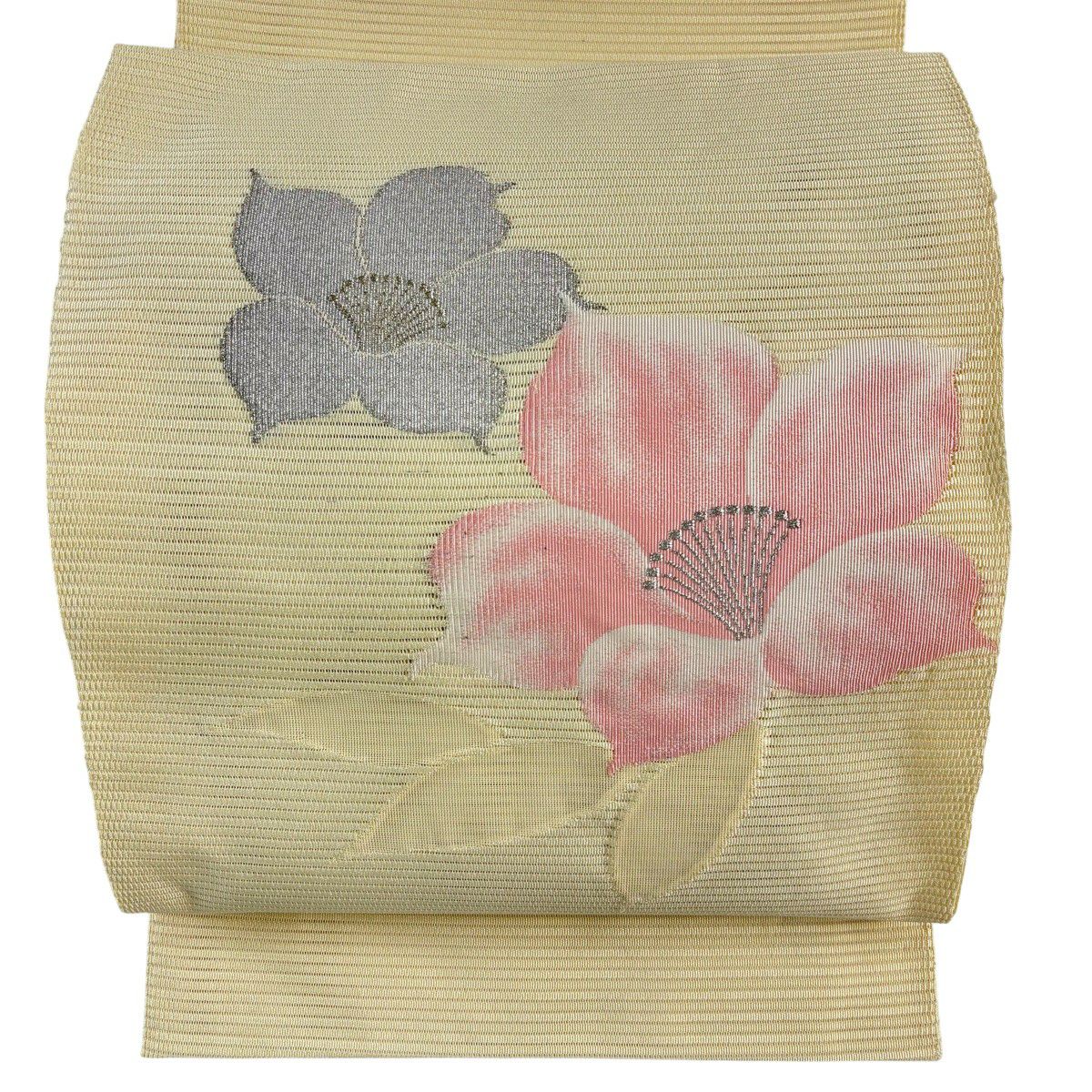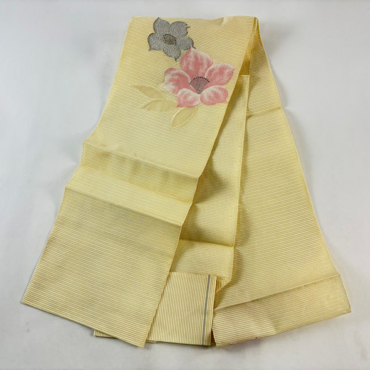 【美品】 名古屋帯 優品 松葉仕立て 八寸名古屋帯 夏帯 絽 トンネル仕立て 草花 銀糸 薄黄 正絹