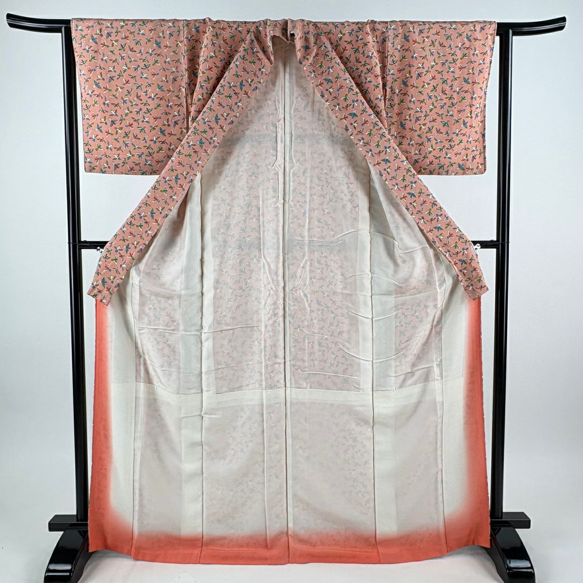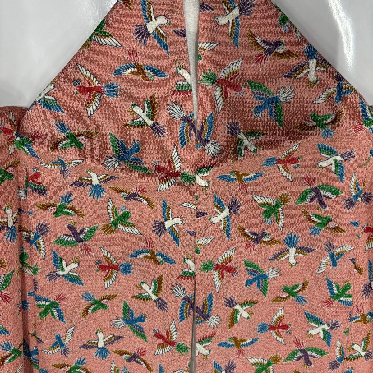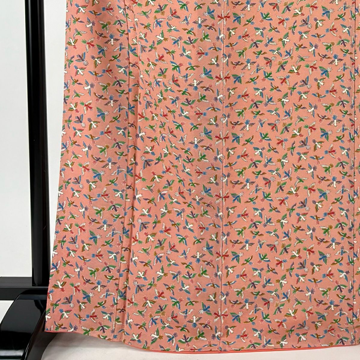 【美品】 小紋 身丈167cm 裄丈63cm S 袷 鳥 縮緬 サーモンピンク 正絹 優品