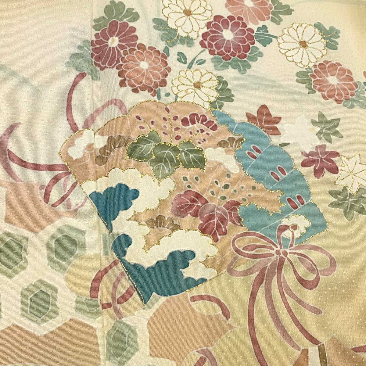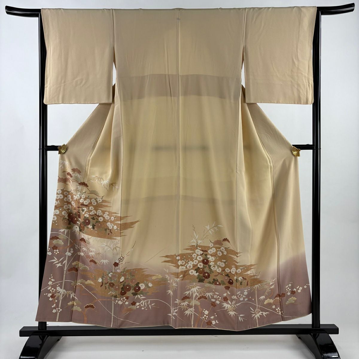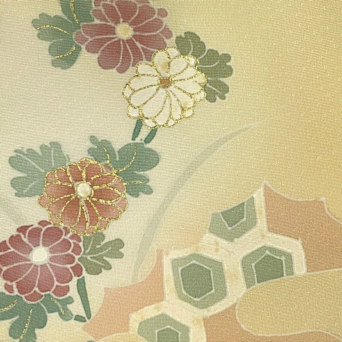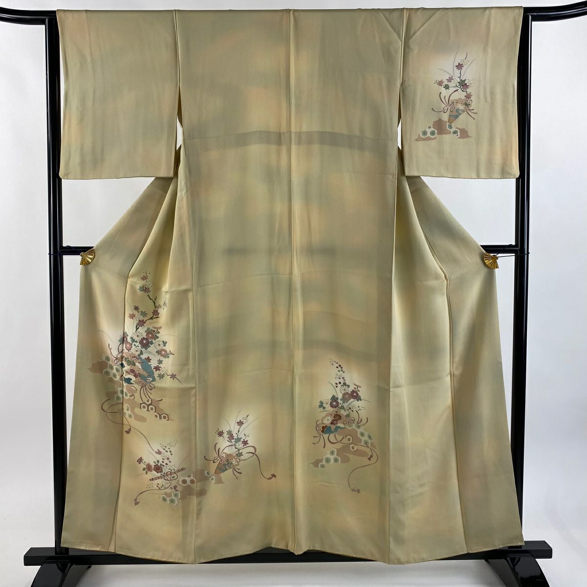 【在庫一掃】 付下げ 身丈156cm 裄丈63.5cm S 袷 桧扇 亀甲 金彩 ぼかし ベージュ 正絹 優品