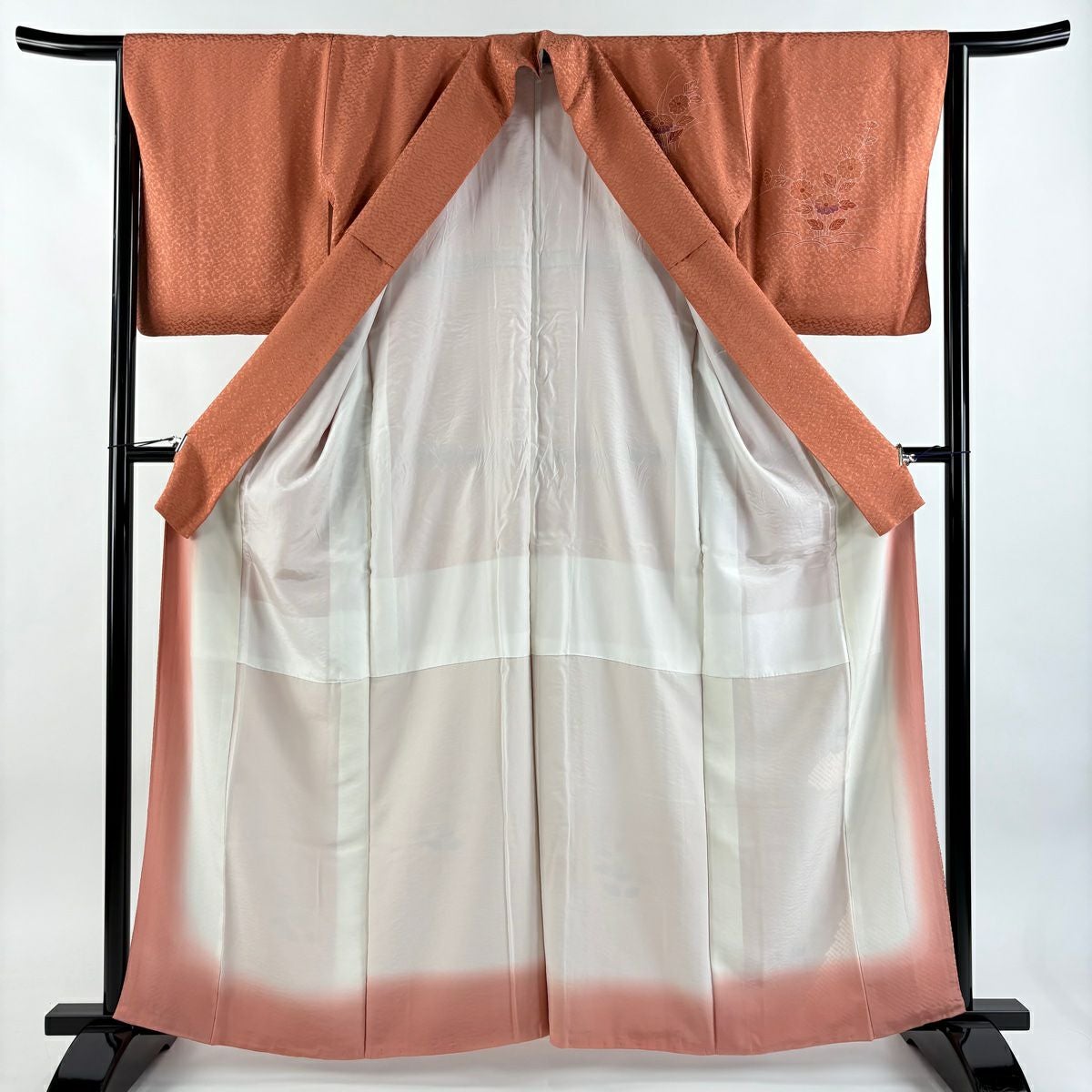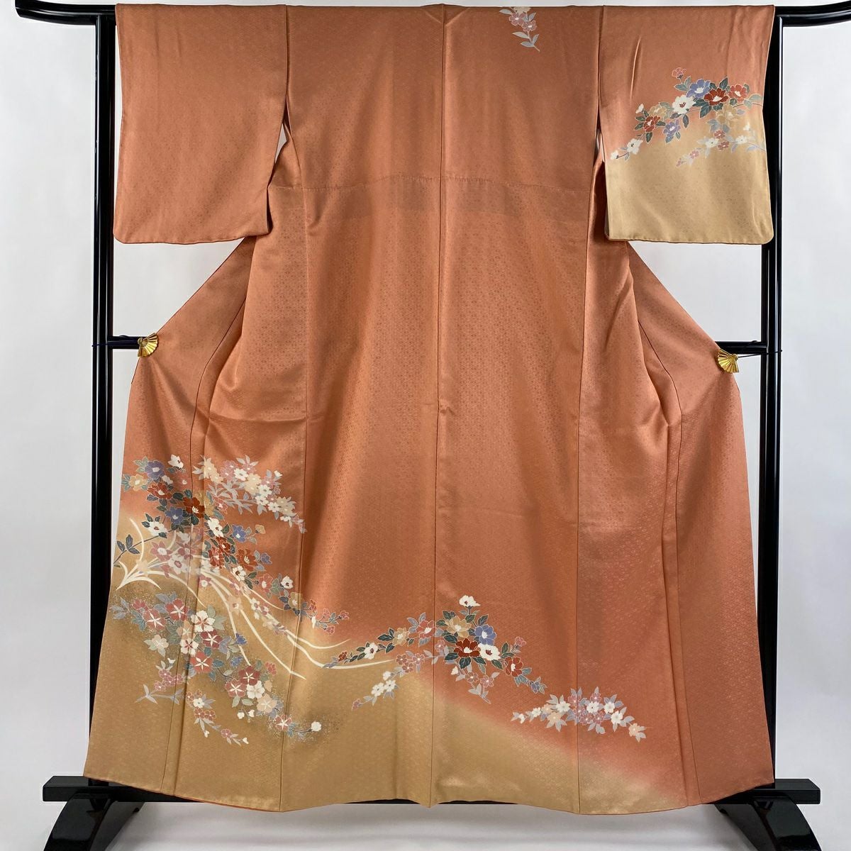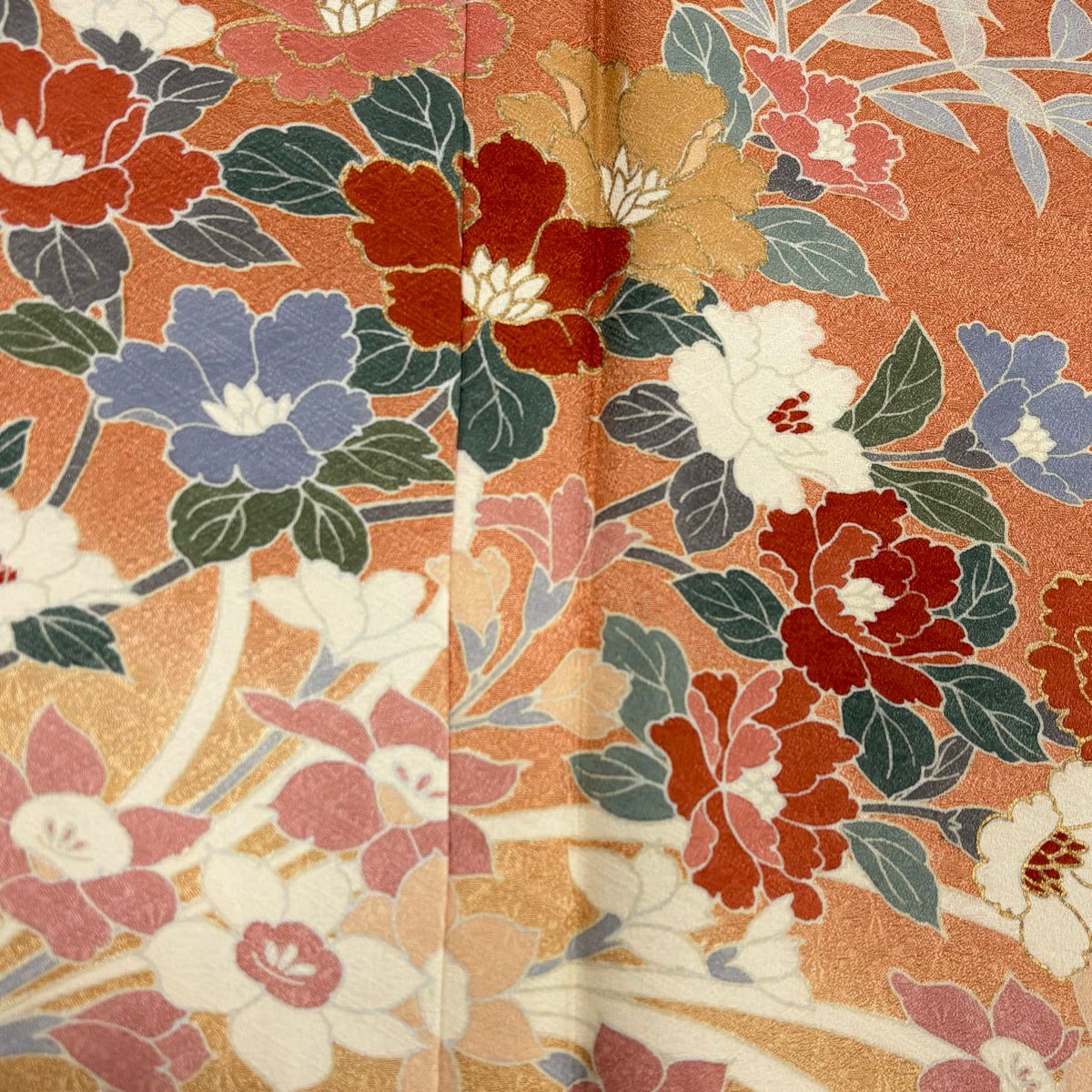 【在庫一掃】 訪問着 身丈159cm 裄丈64cm M 袷 草花 地紋 金銀彩 染め分け サーモンピンク 正絹 優品