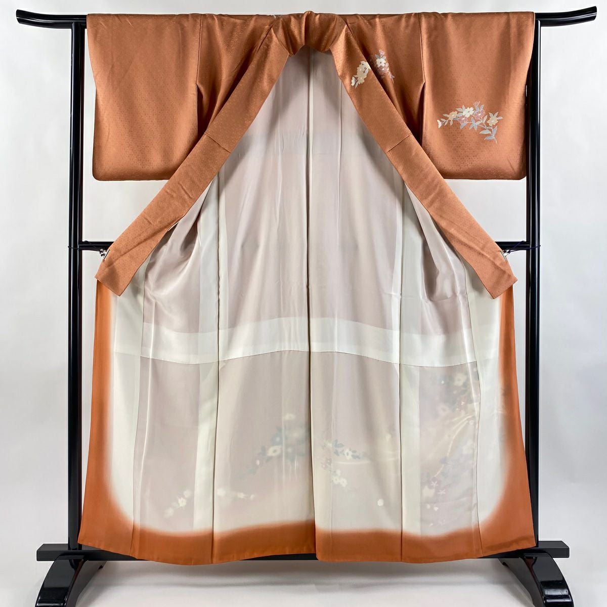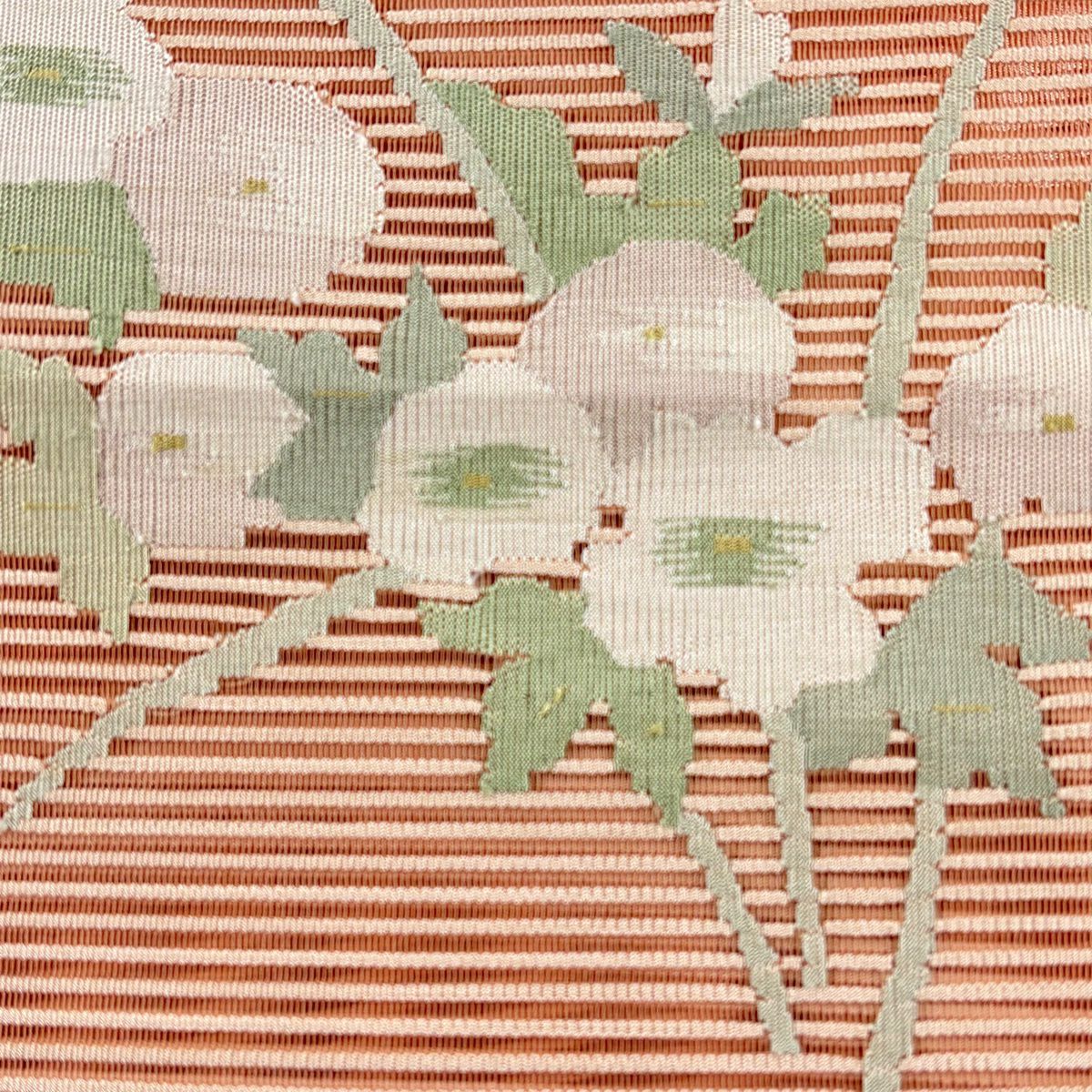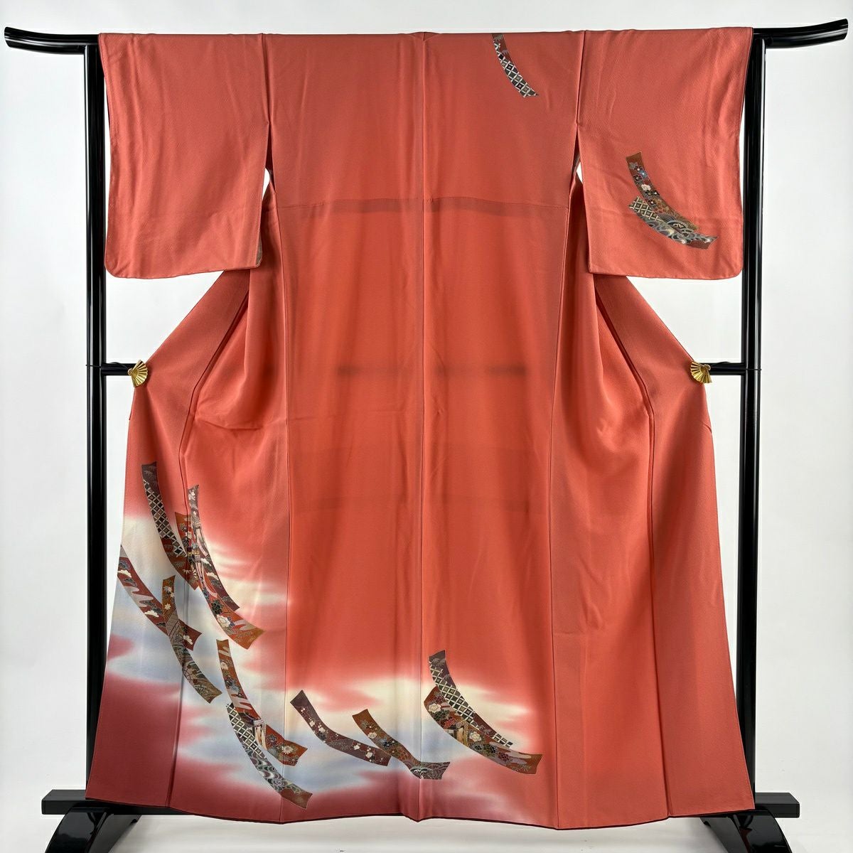 【在庫一掃】 訪問着 身丈159cm 裄丈64cm M 袷 草花 地紋 金銀彩 染め分け サーモンピンク 正絹 優品