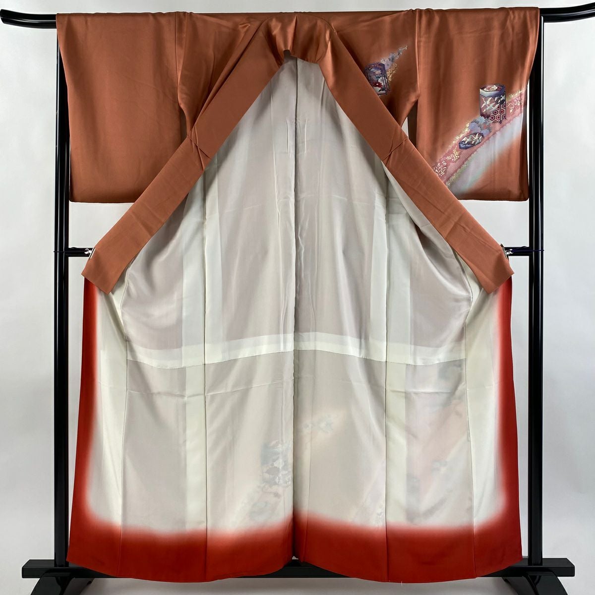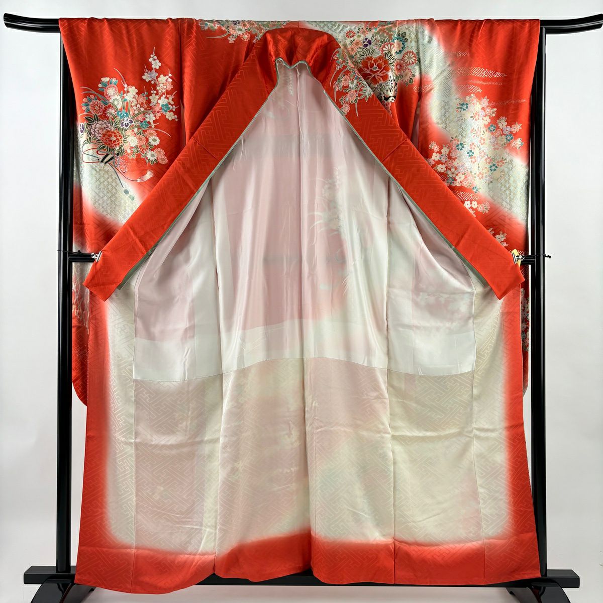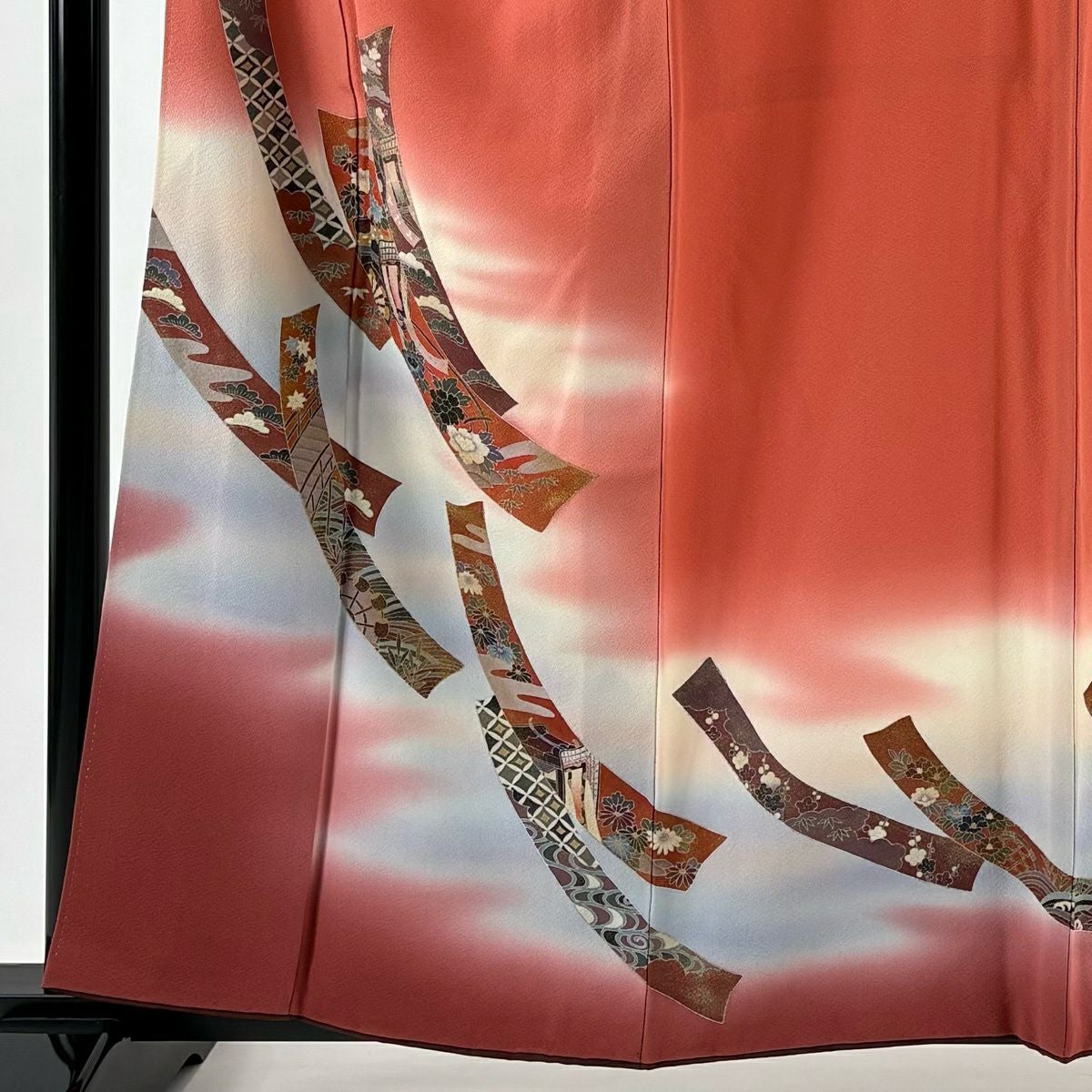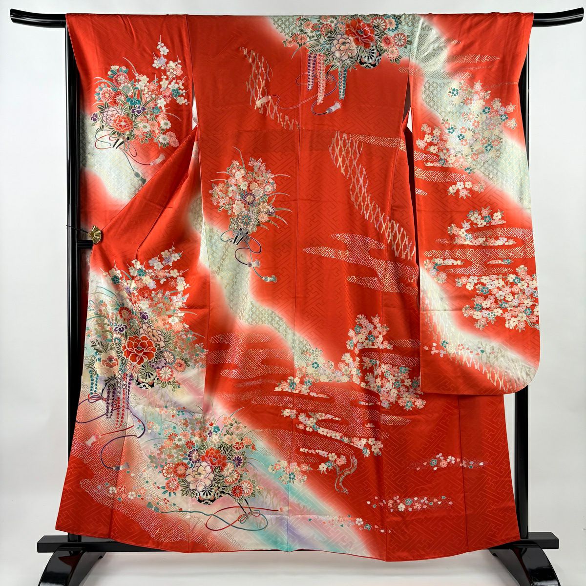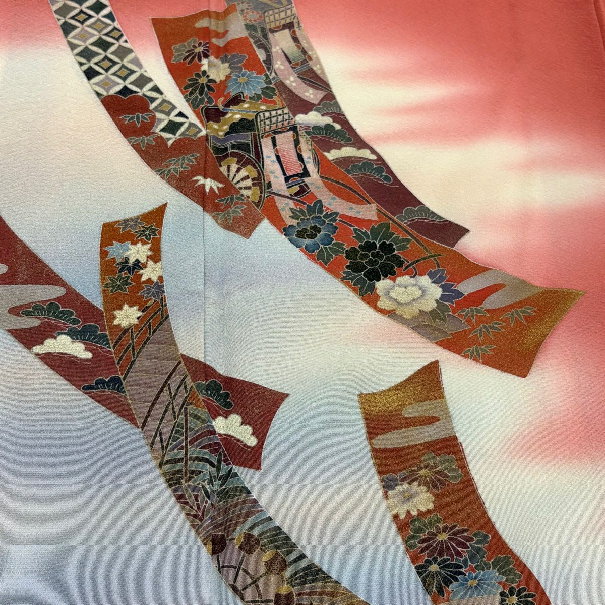 【美品】 振袖 身丈160cm 裄丈67cm M 袷 鈴乃屋 花車 組紐 金銀彩 ぼかし 朱色 正絹 優品