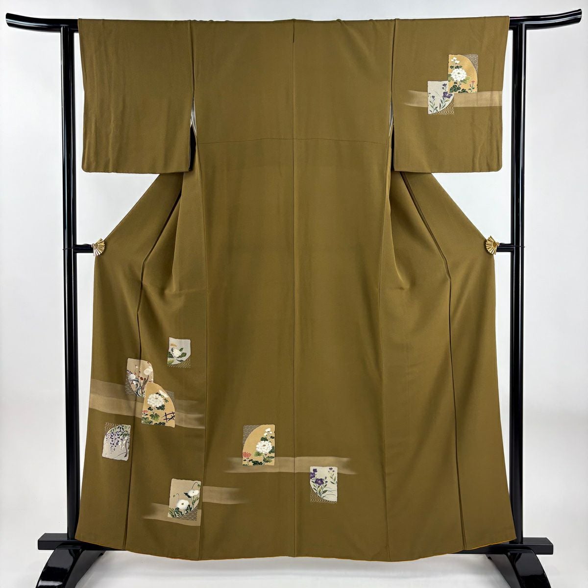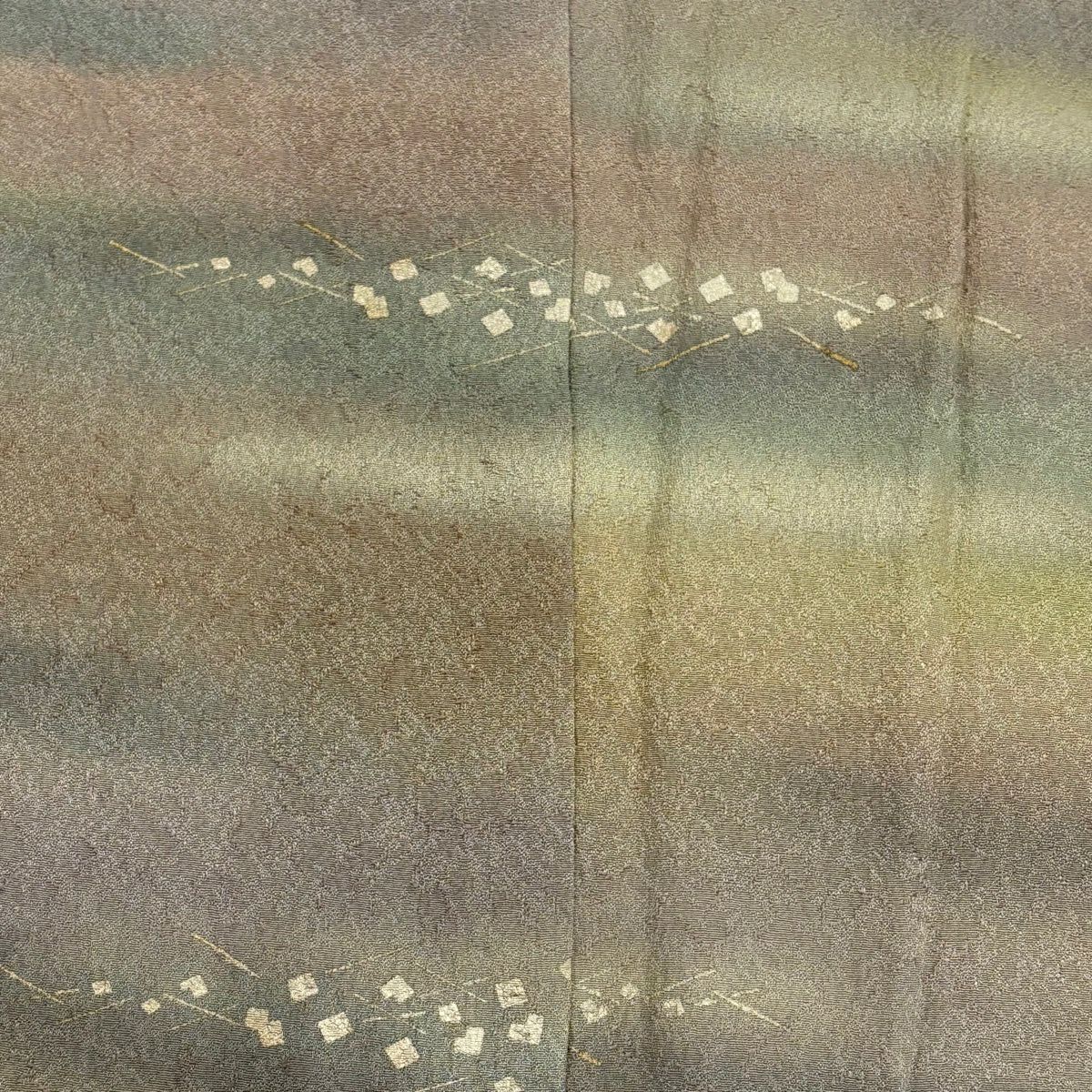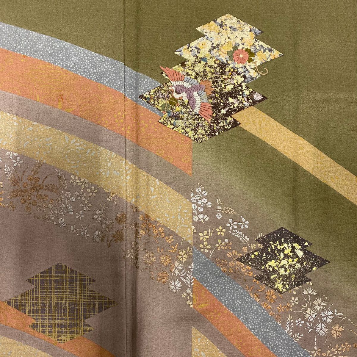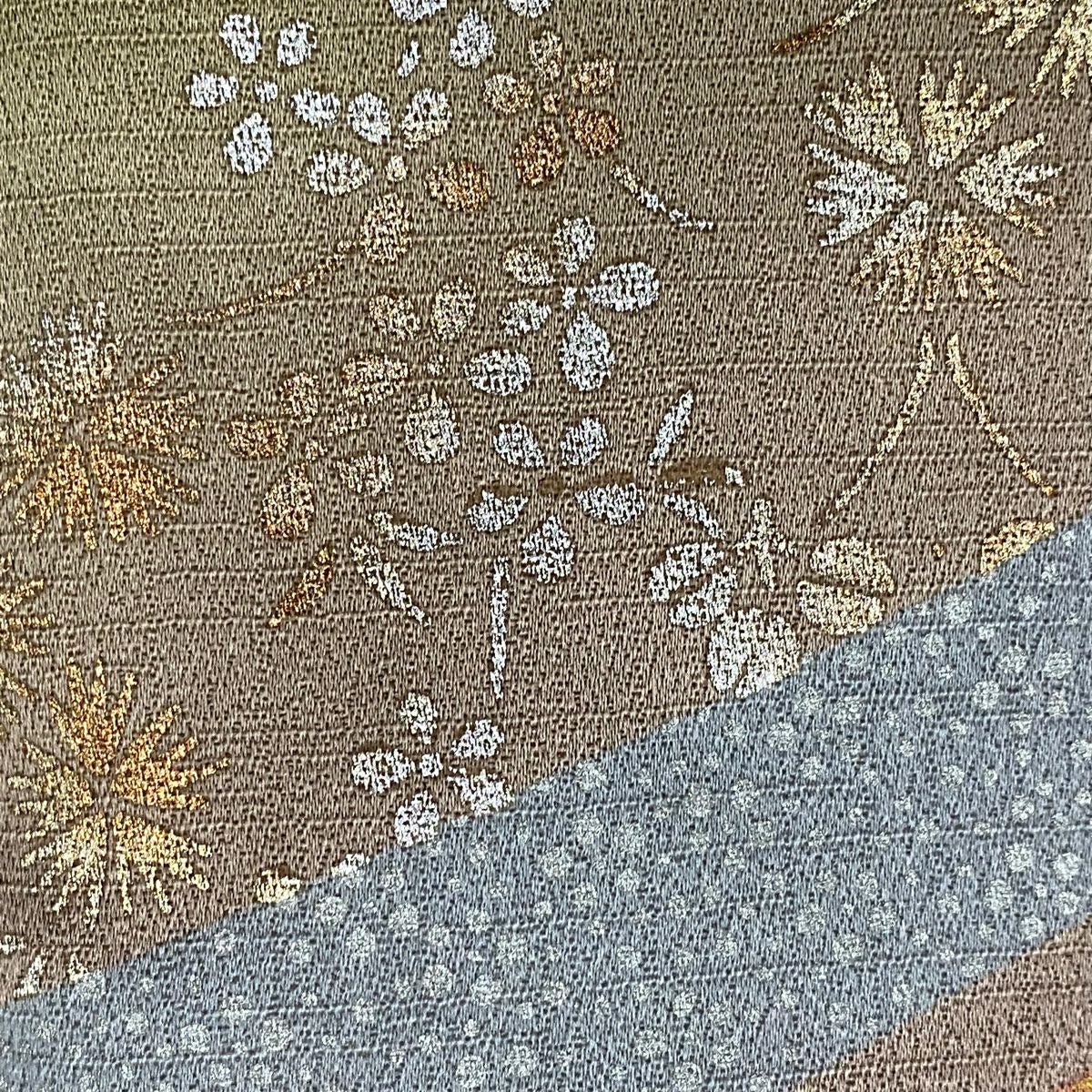 【在庫一掃】 訪問着 身丈157cm 裄丈65cm M 袷 松皮菱 花鳥 金銀彩 刺繍 鶯色 正絹 優品