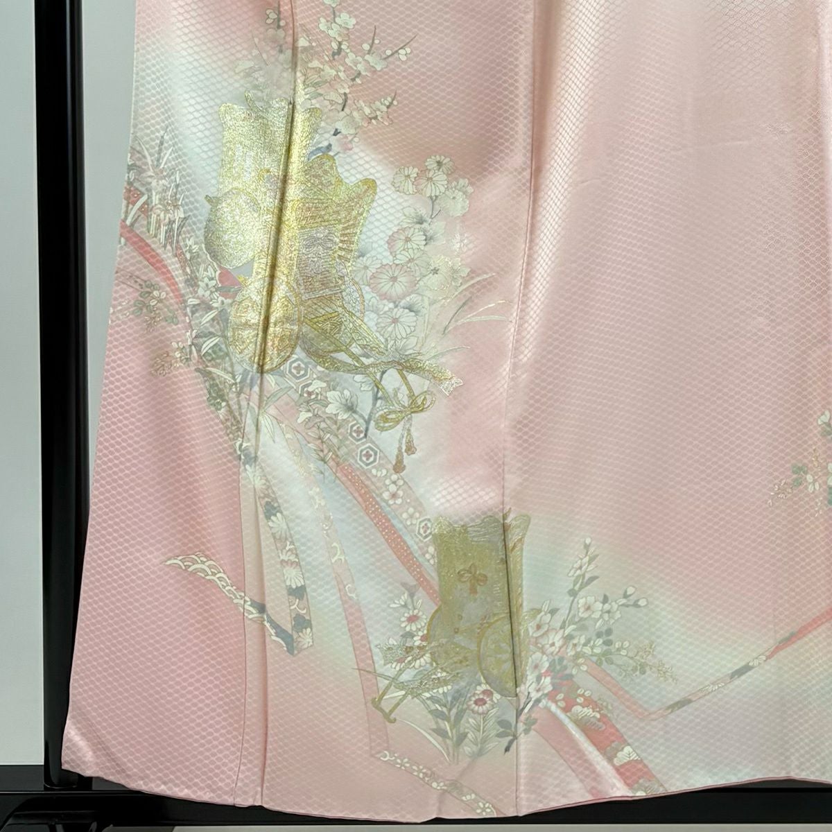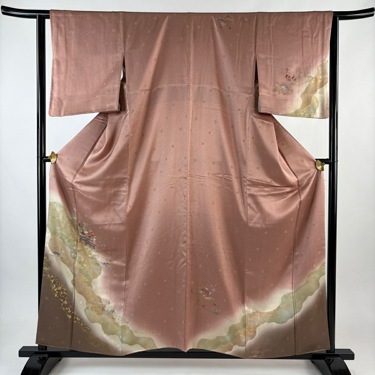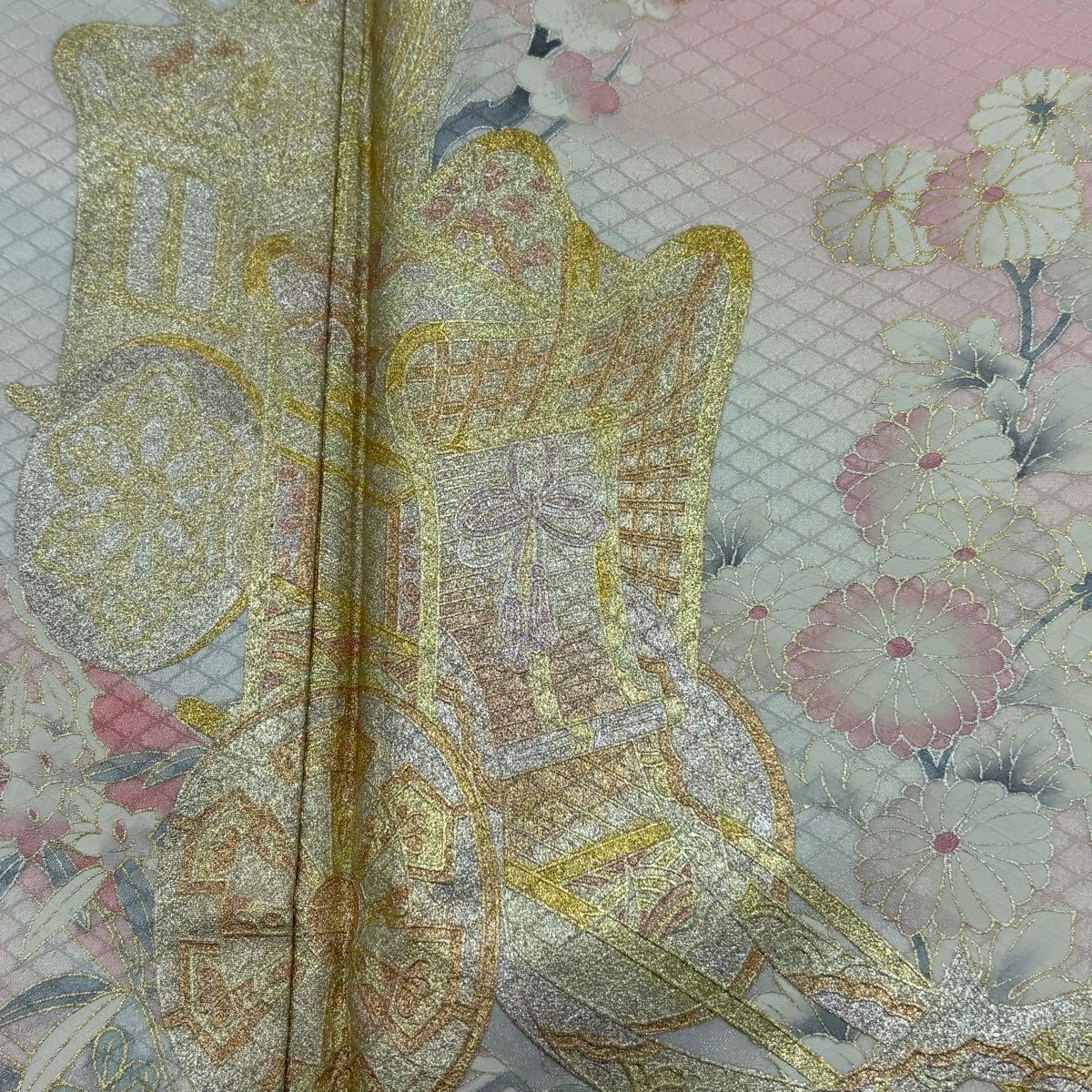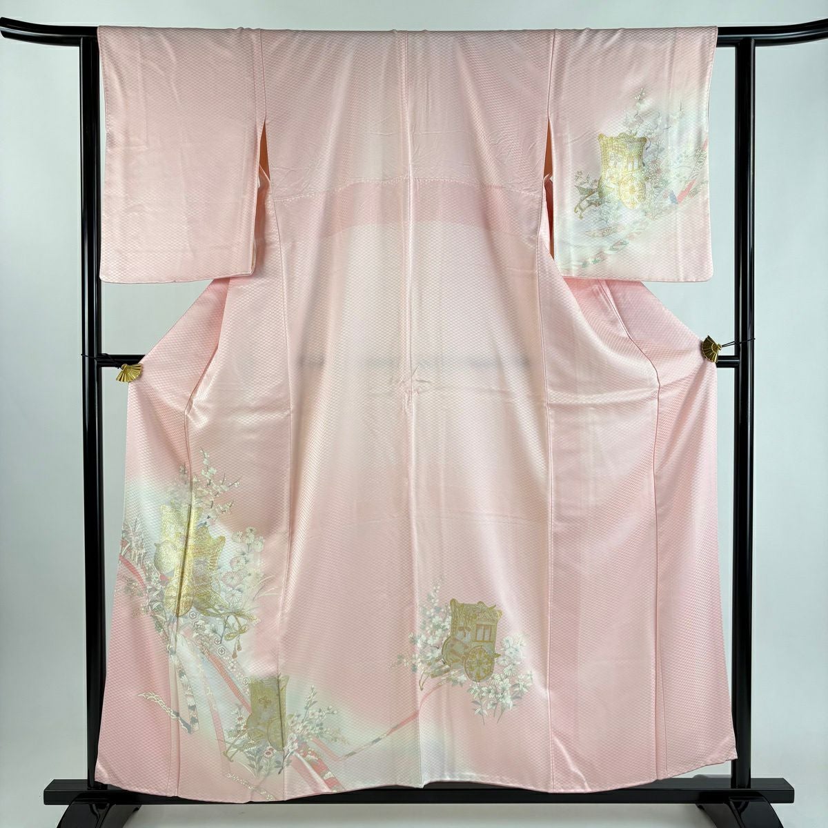 付下げ 身丈157.5cm 裄丈61cm S 袷 やまと 御所車 草花 金銀彩 ぼかし ピンク 正絹 優品