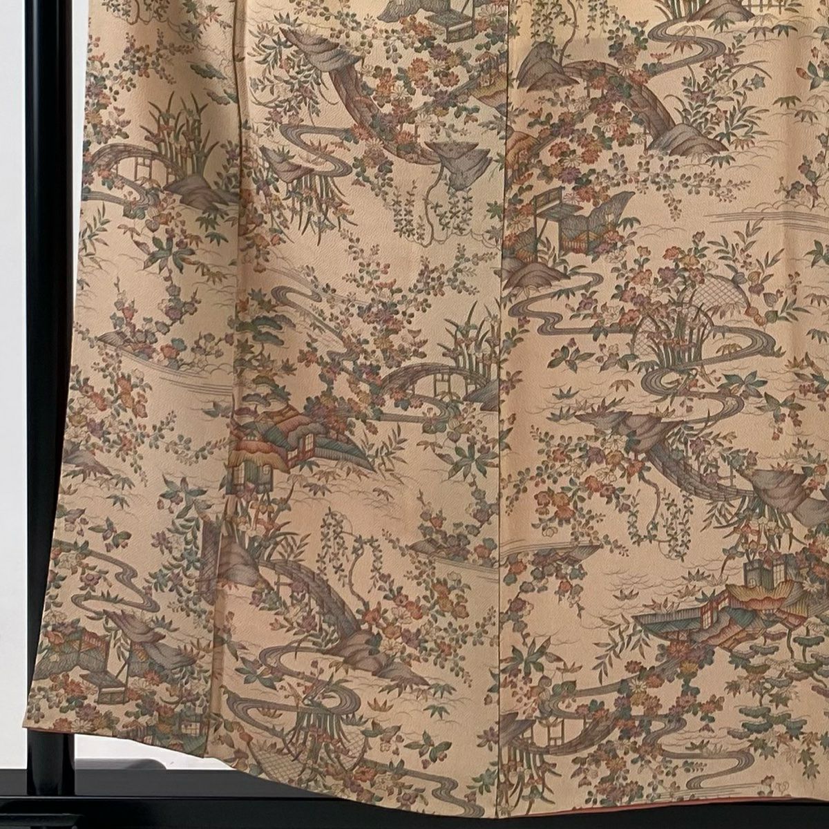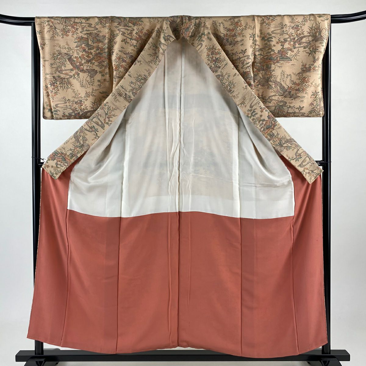 訪問着 身丈158cm 裄丈62.5cm S 袷 草花 流水 刺繍 金銀彩 ピンクベージュ 正絹 優品