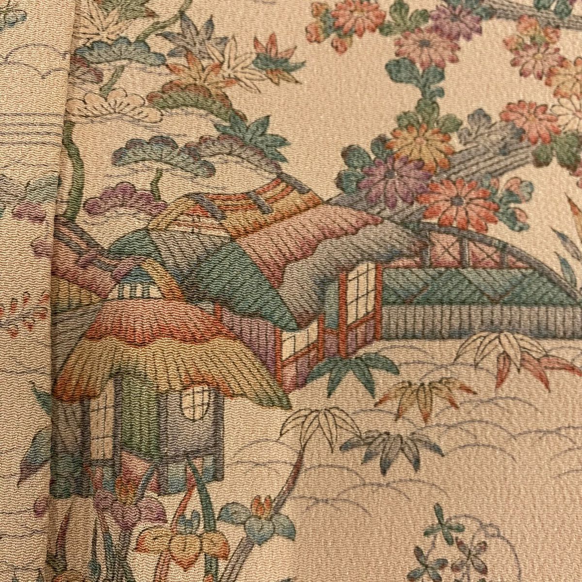 【在庫一掃】 小紋 身丈155.5cm 裄丈65cm M 袷 建物 草花 縮緬 薄オレンジ 正絹 美品 優品 一つ紋
