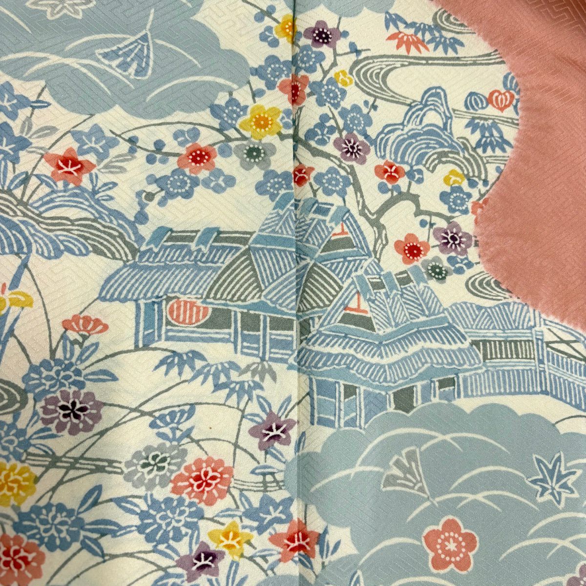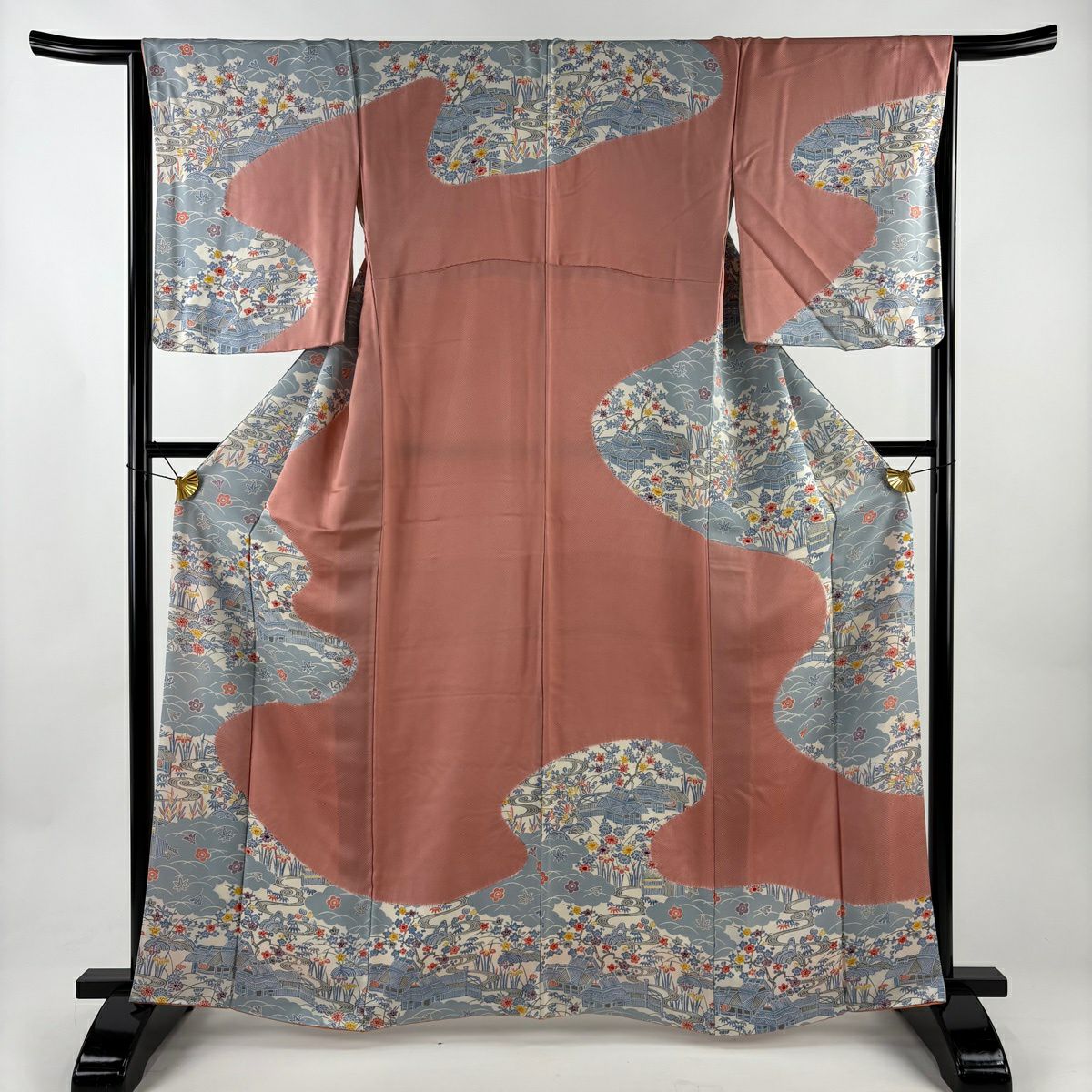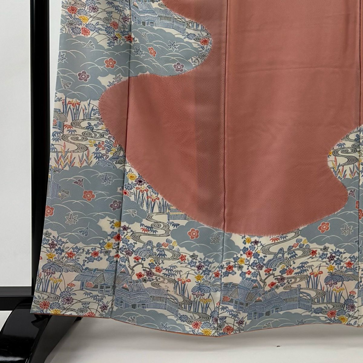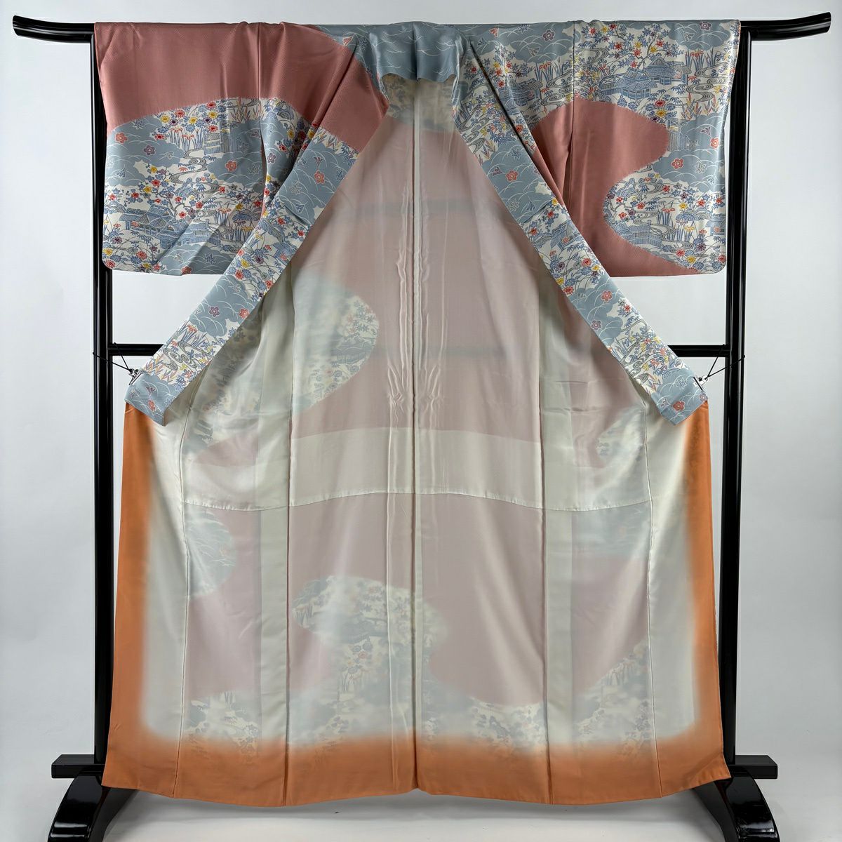 訪問着 身丈162cm 裄丈65.5cm M 袷 建物 草花 絞り 染め分け サーモンピンク 正絹 優品