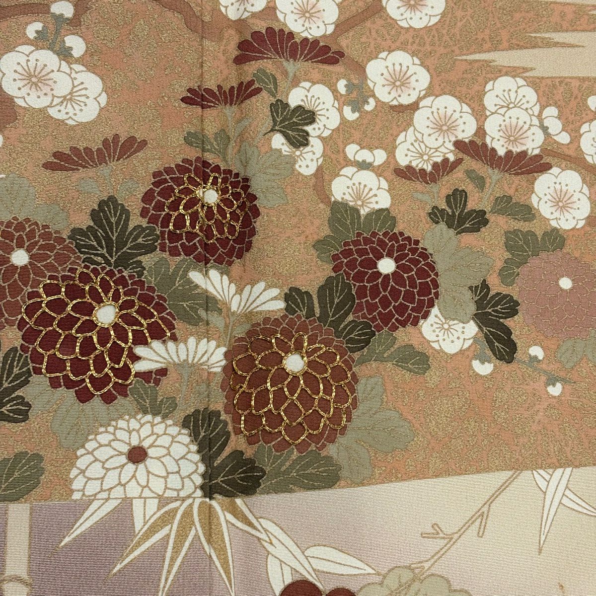 【在庫一掃】 付下げ 身丈156.5cm 裄丈64.5cm M 袷 万寿菊 萩 刺繍 金彩 ピンクベージュ 正絹 美品 優品