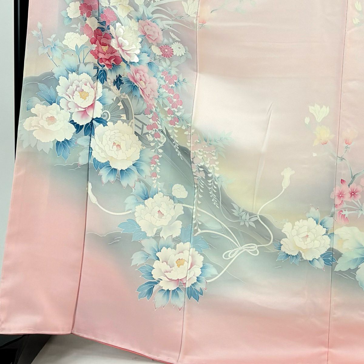 【美品】 訪問着 身丈172.5cm 裄丈64cm M 袷 花車 牡丹 刺繍 ぼかし 薄ピンク 正絹 優品