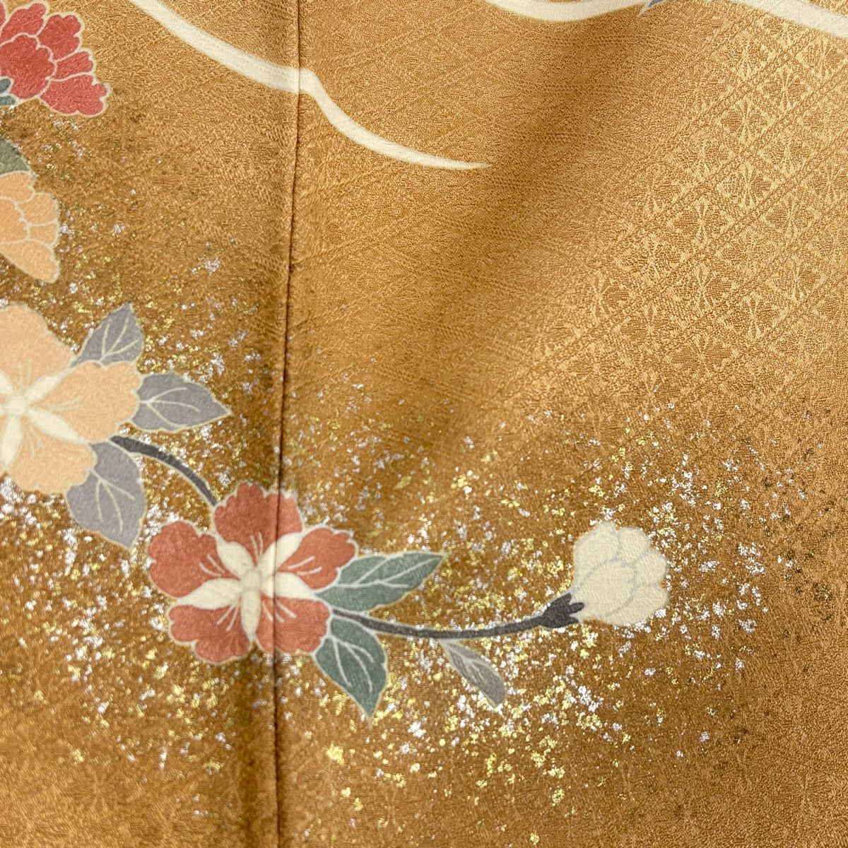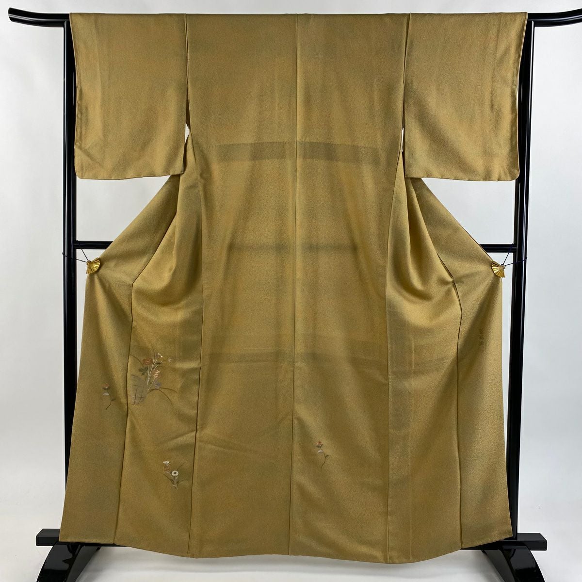 【在庫一掃】 【美品】 付下げ 身丈162.5cm 裄丈64.5cm M 袷 落款あり 草花 雪輪 刺繍 金糸 山吹茶色 正絹 優品