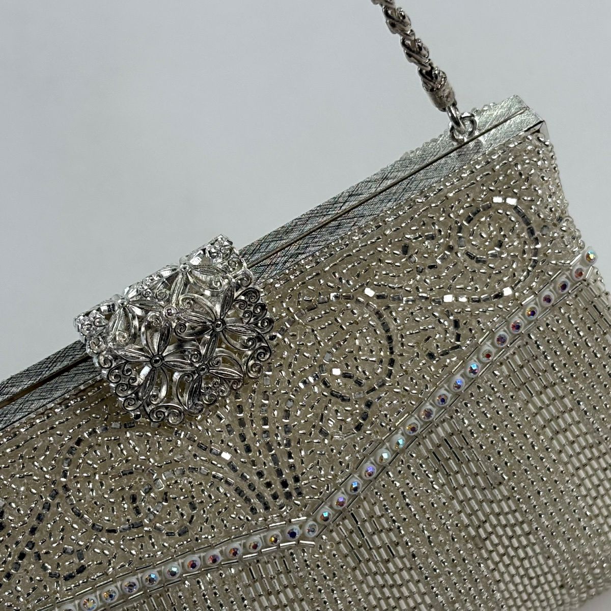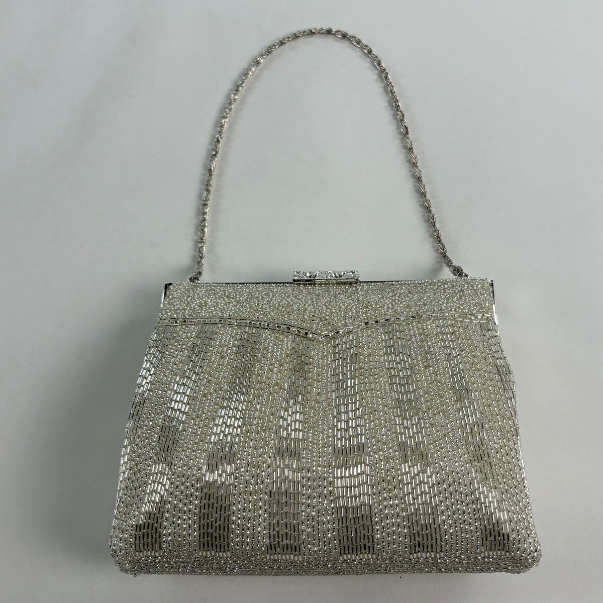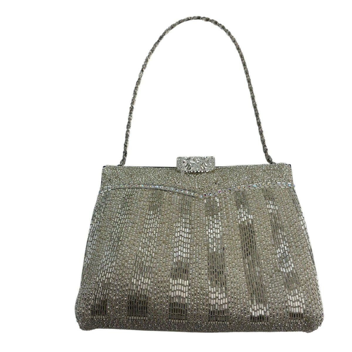 【美品】和装バッグ 優品 ビーズバッグ フォーマル チェーン付き 縞 唐草 ラインストーン 白 ビーズ 和装小物