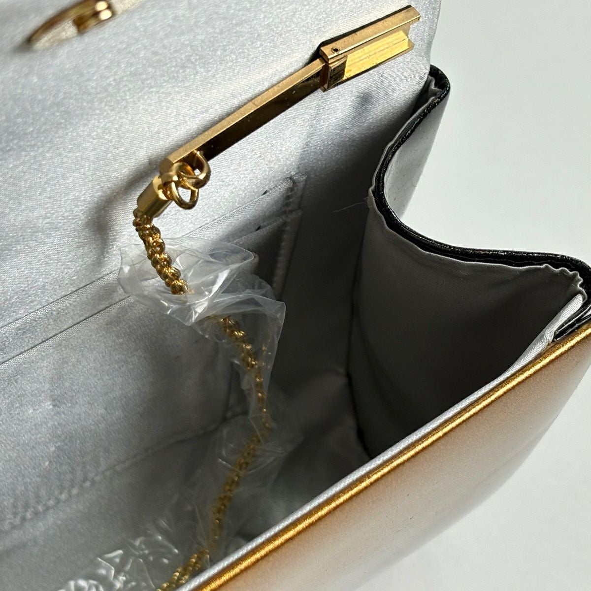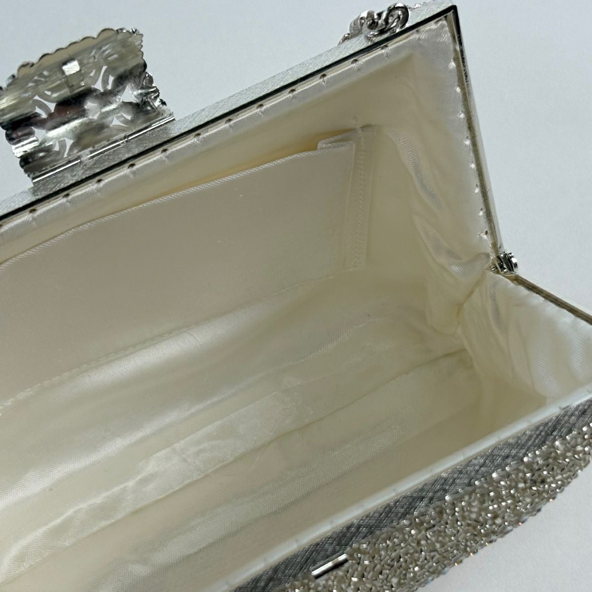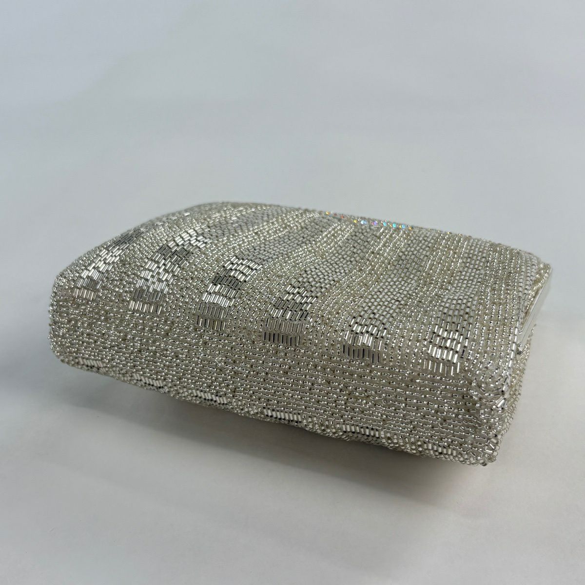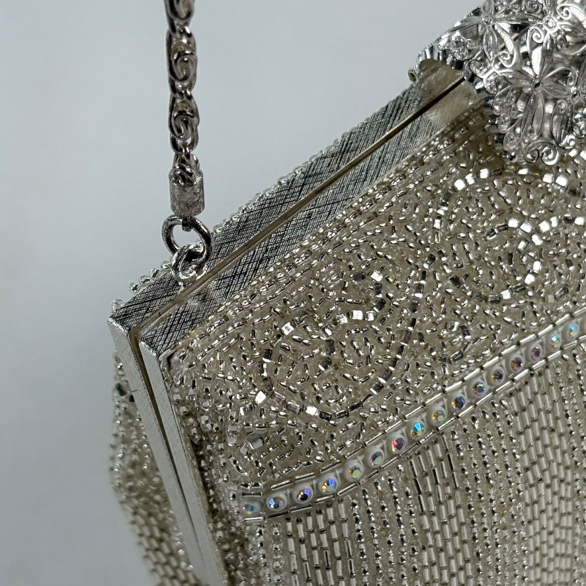 【美品】和装バッグ 優品 ビーズバッグ フォーマル チェーン付き 縞 唐草 ラインストーン 白 ビーズ 和装小物