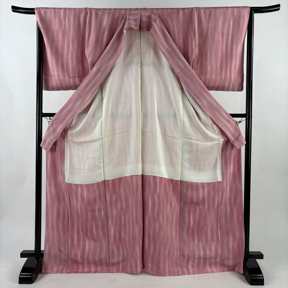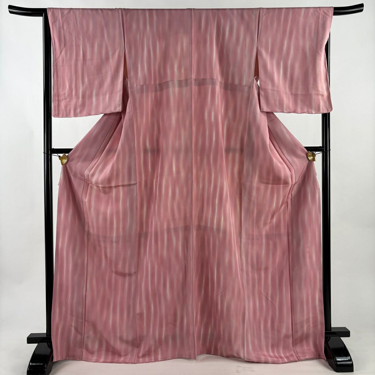 【美品】 小紋 身丈169.5cm 裄丈67cm M 袷 落款あり 縞 幾何学 ぼかし ピンク 正絹 優品
