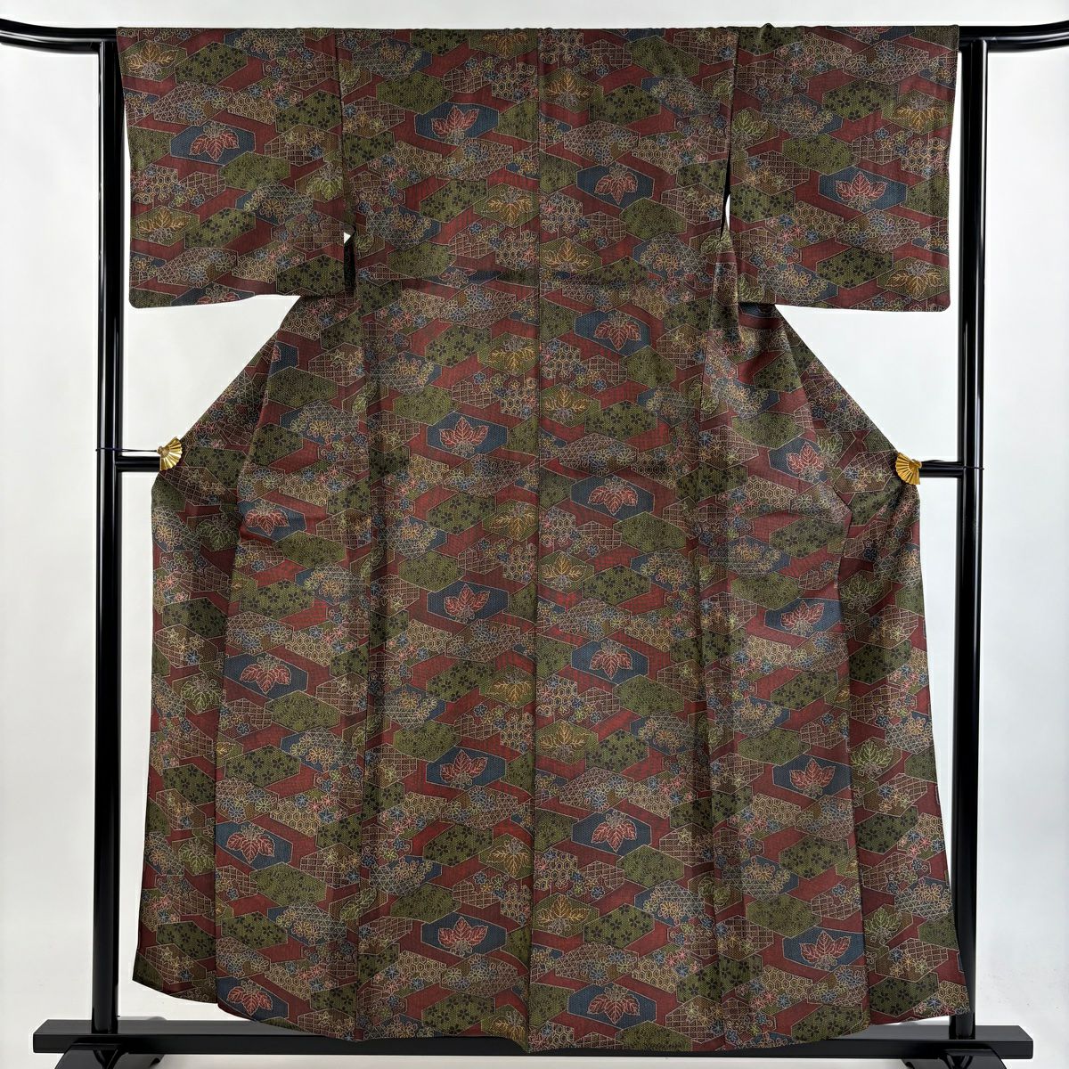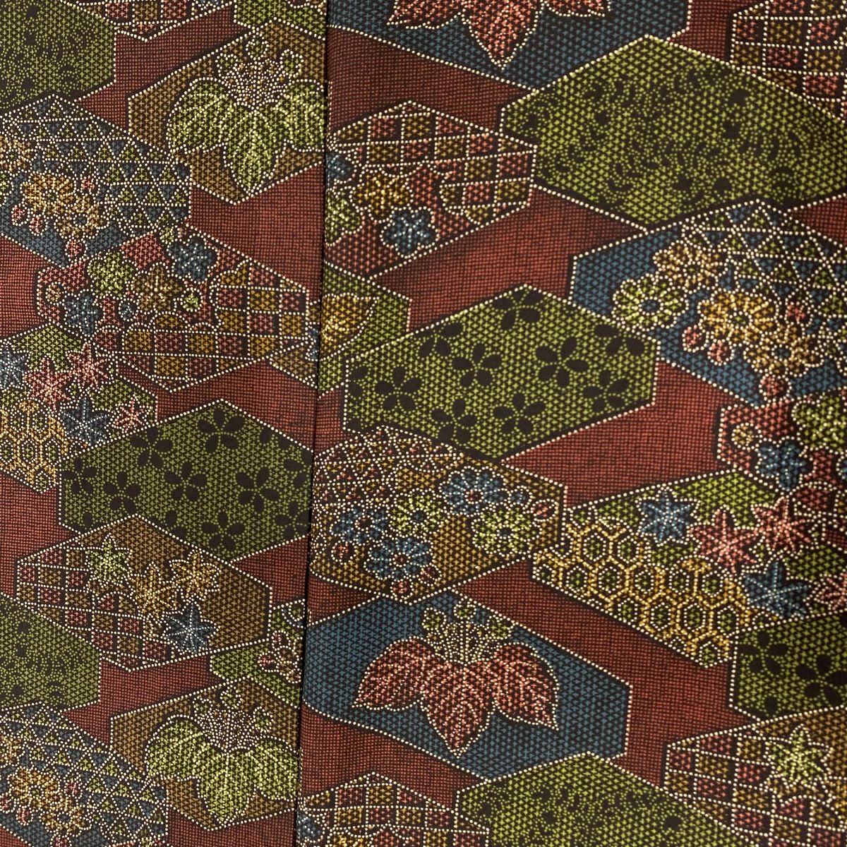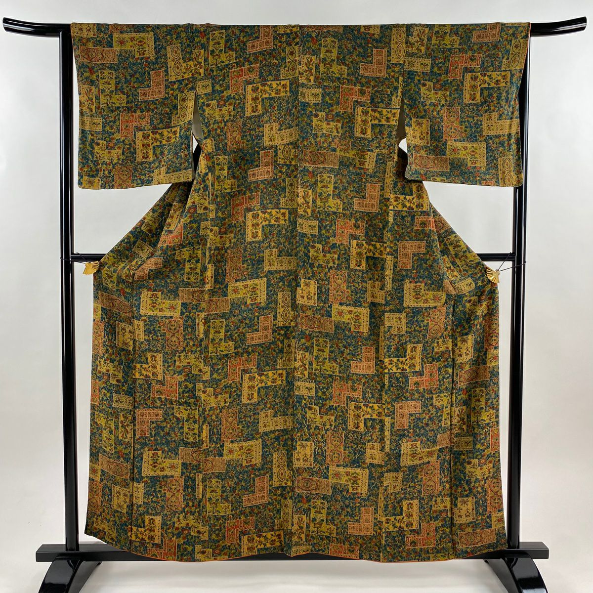 【在庫一掃】 【美品】 小紋 身丈159.5cm 裄丈65cm M 袷 草花 幾何学模様 縮緬 深緑 正絹 優品