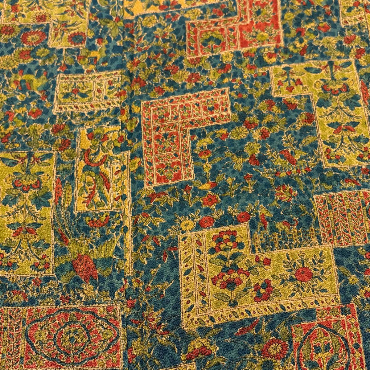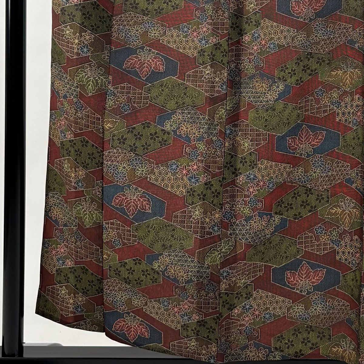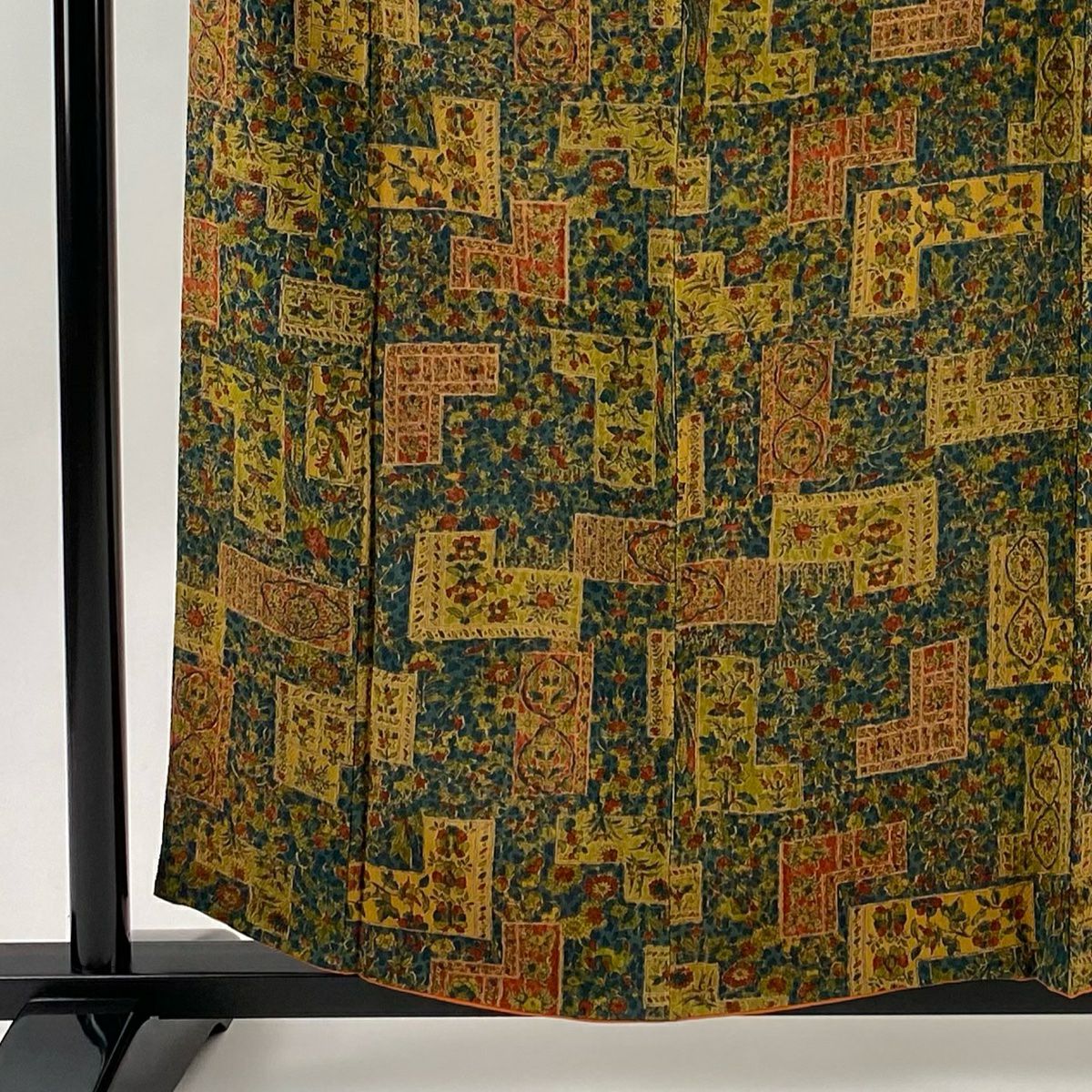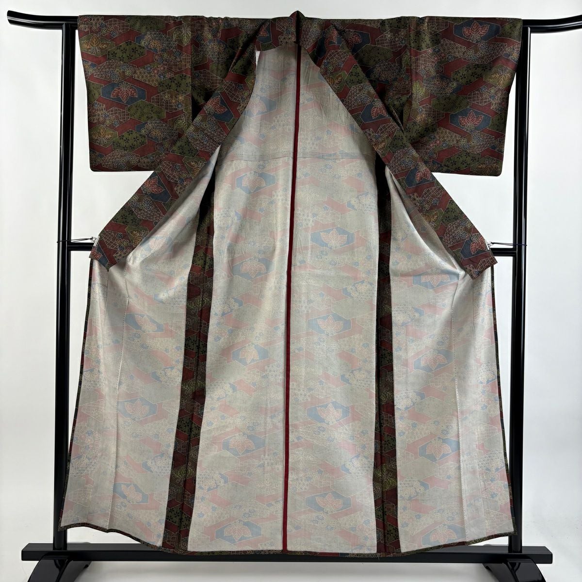 【在庫一掃】 【美品】 小紋 身丈159.5cm 裄丈65cm M 袷 草花 幾何学模様 縮緬 深緑 正絹 優品