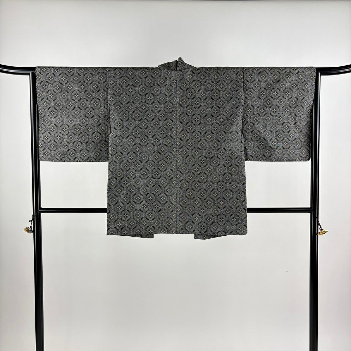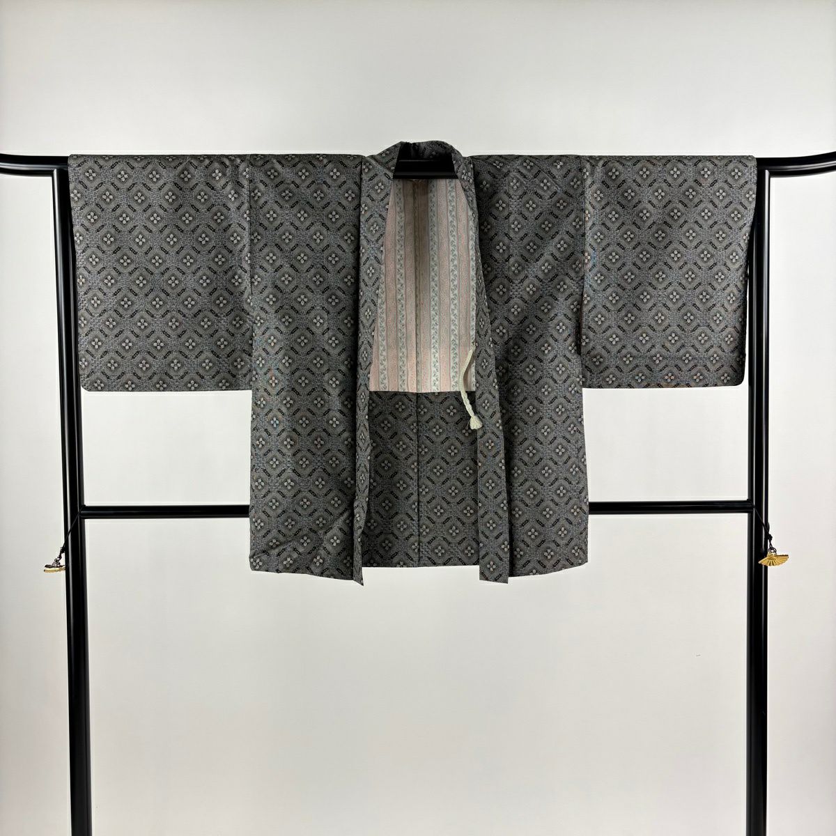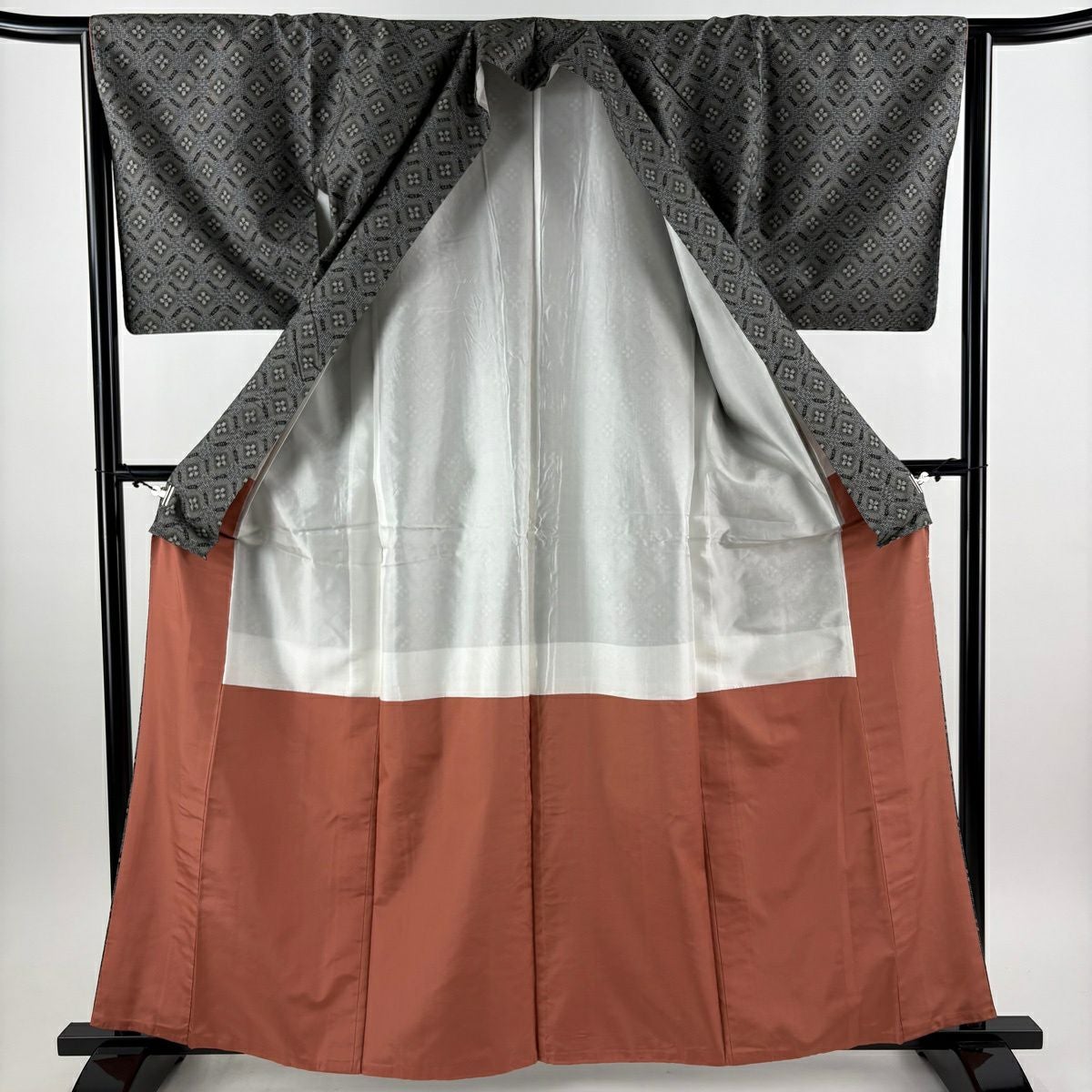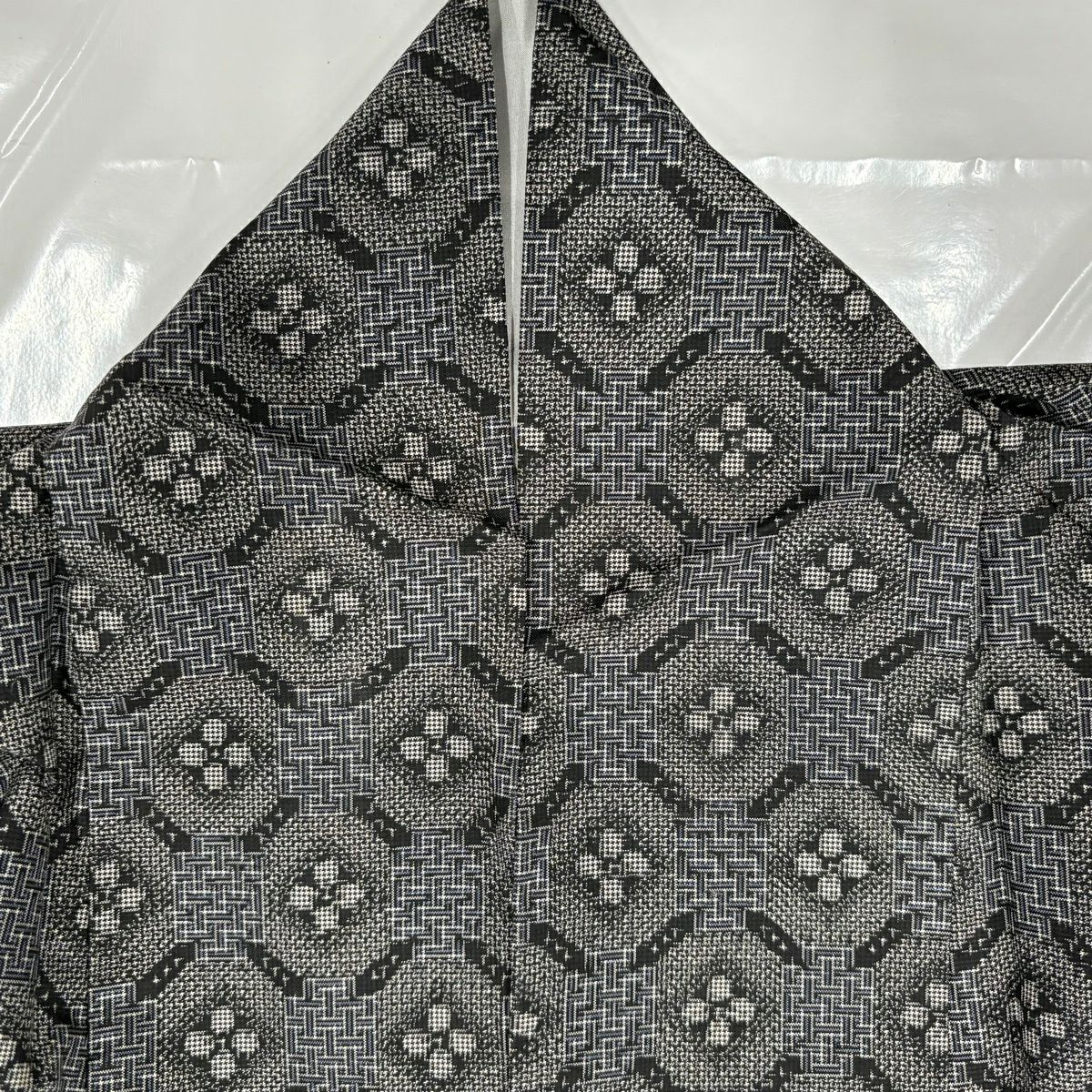 【美品】 紬 身丈161.5cm 裄丈64cm M 袷 アンサンブル 紬地 花 幾何学模様 灰色 正絹 優品