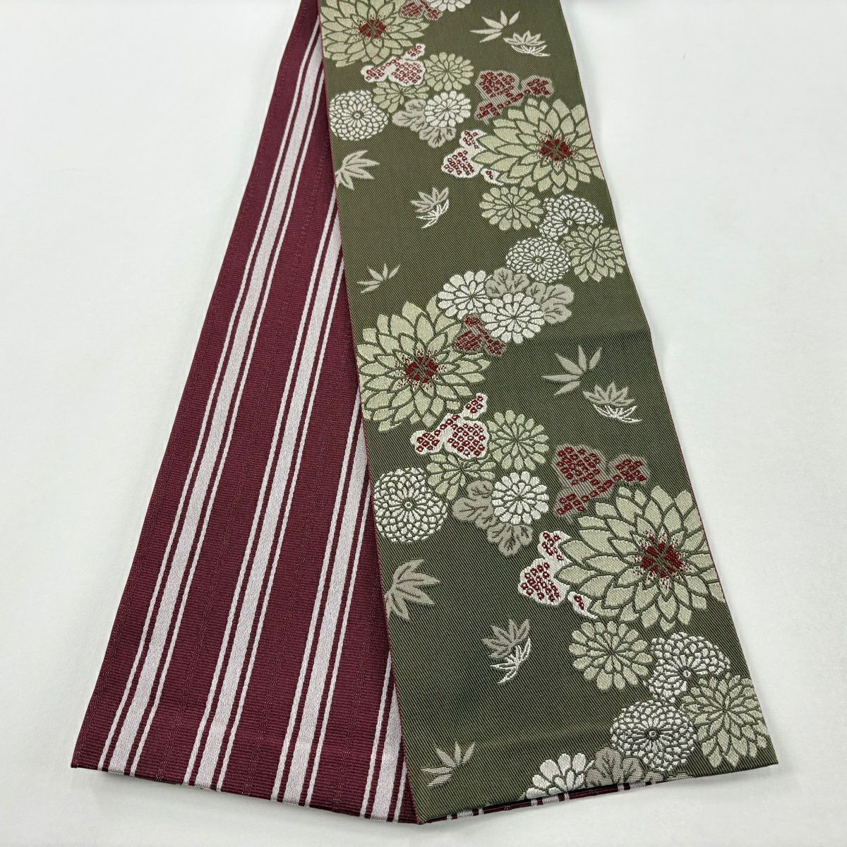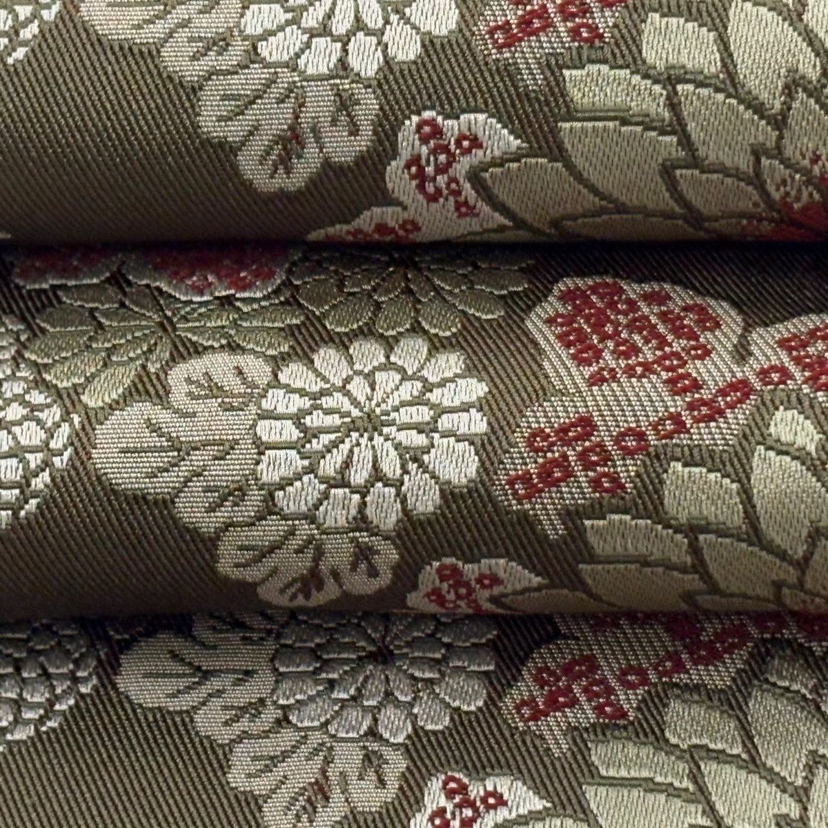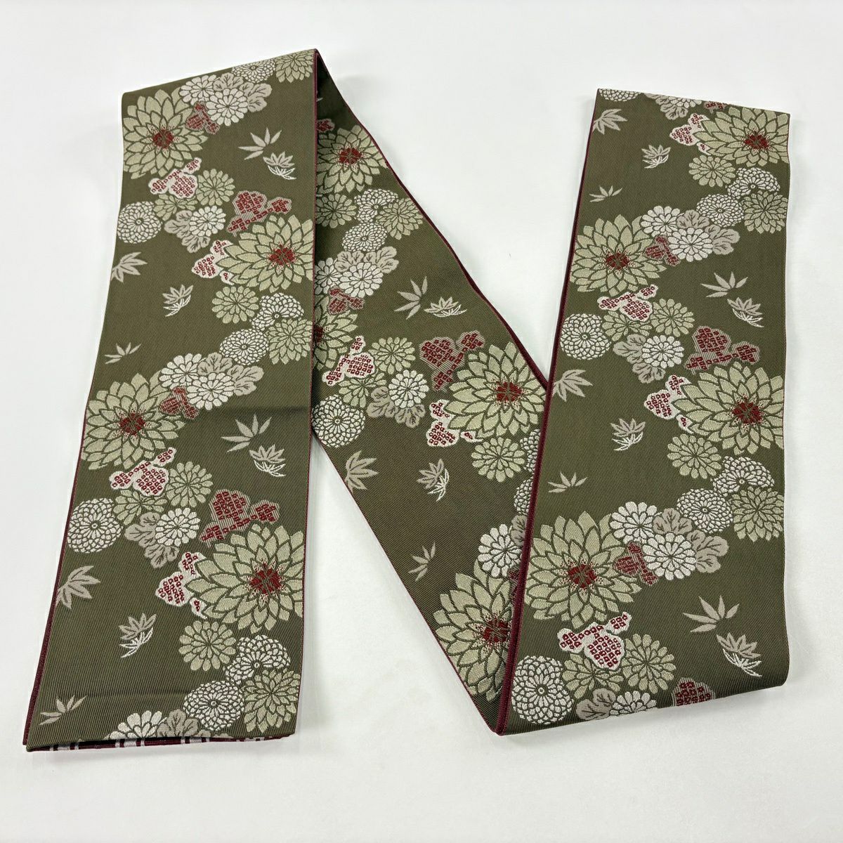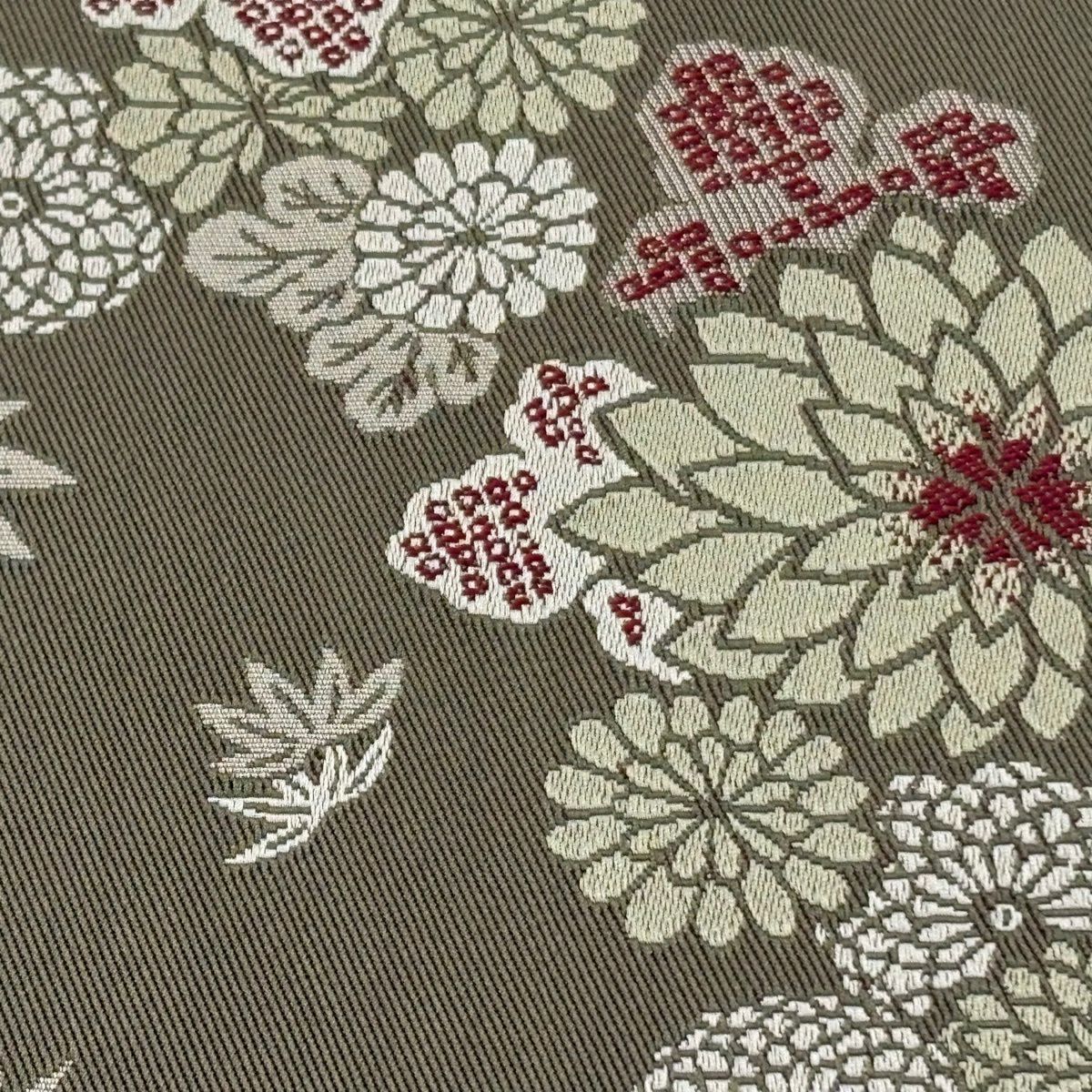 【美品】半幅帯 優品 菊 笹 茶緑色 化繊