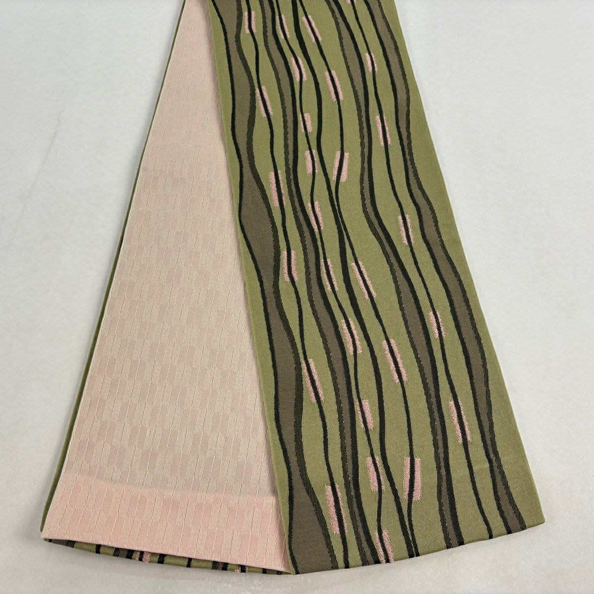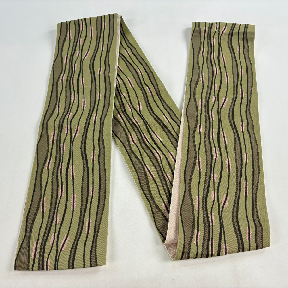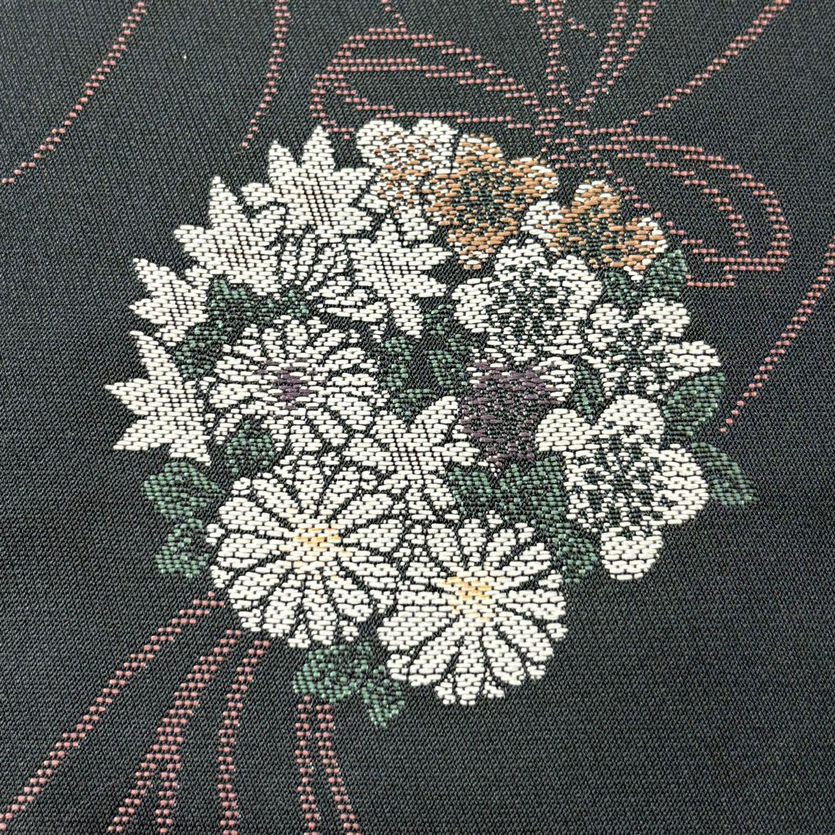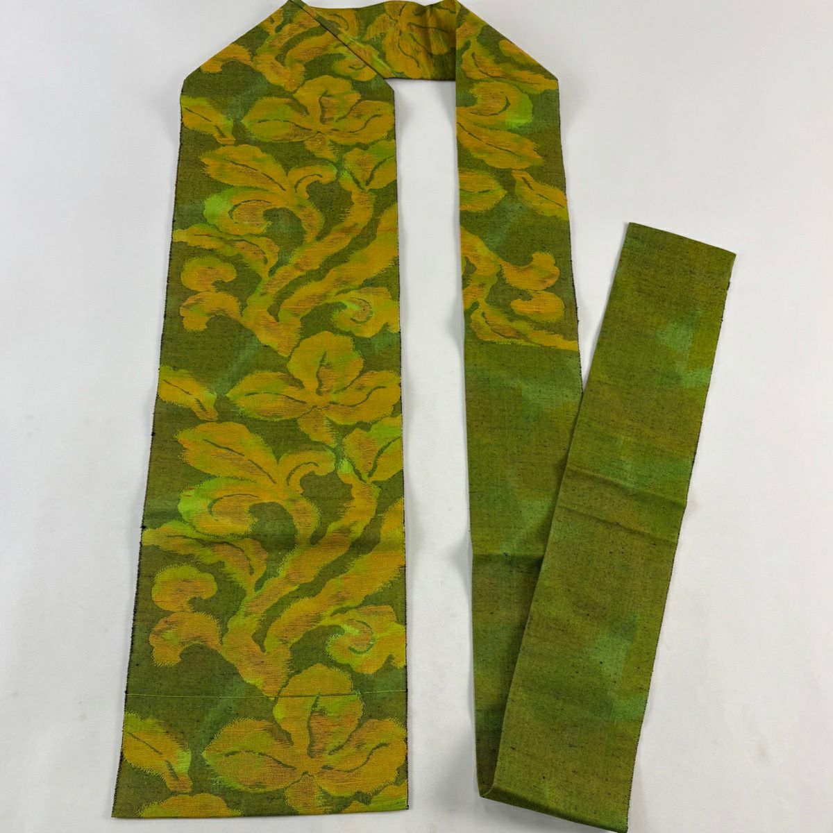 【美品】半幅帯 優品 菊 笹 茶緑色 化繊