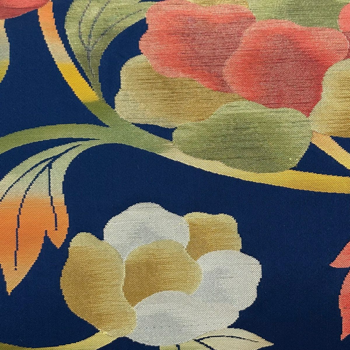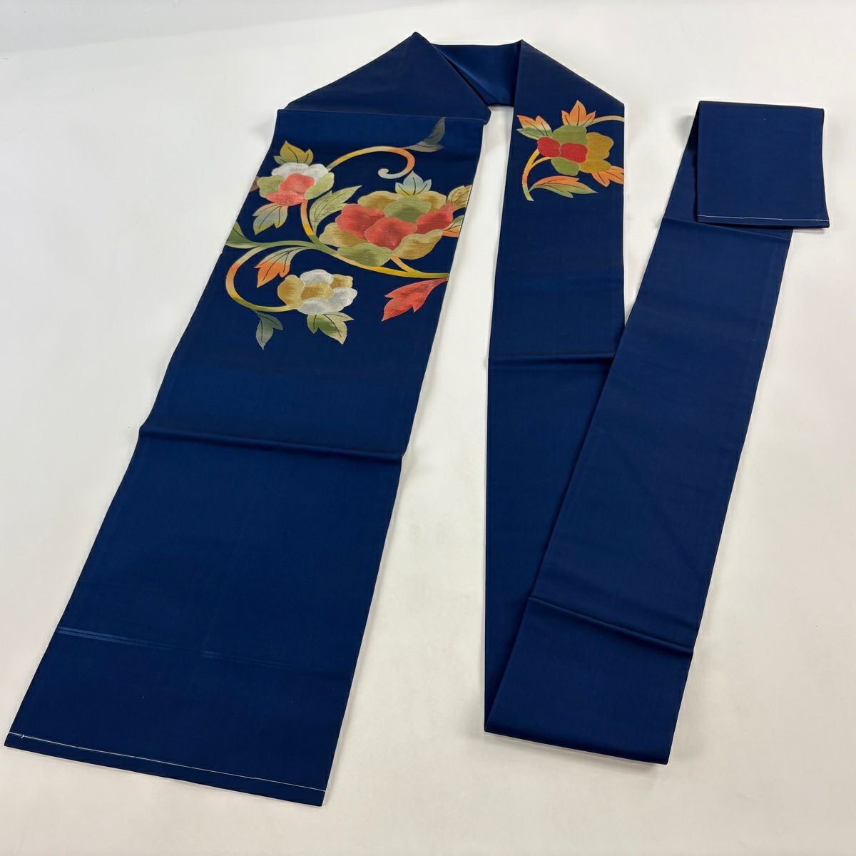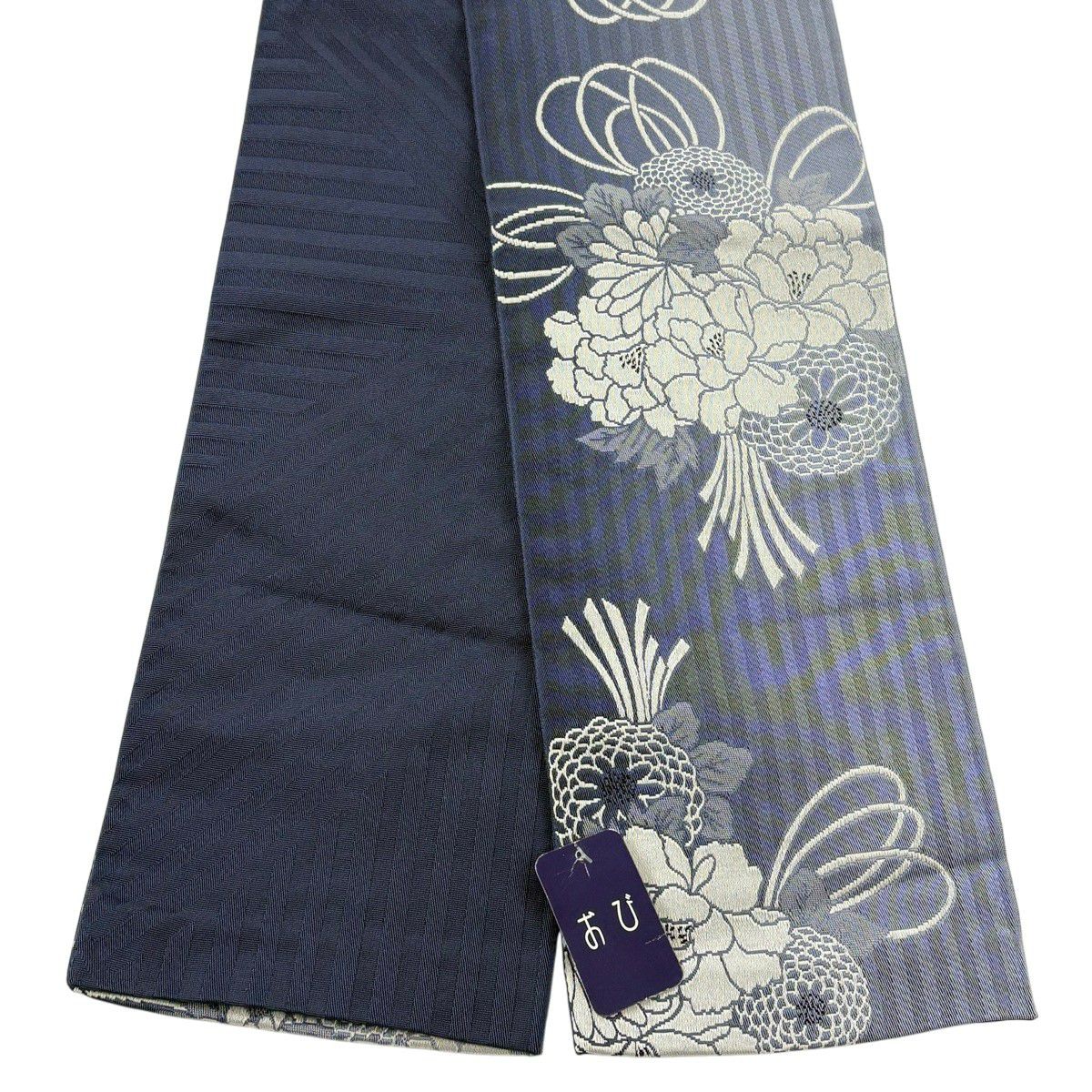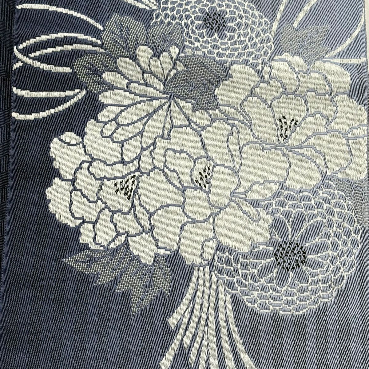 【美品】半幅帯 優品 花束 牡丹 紺色 化繊