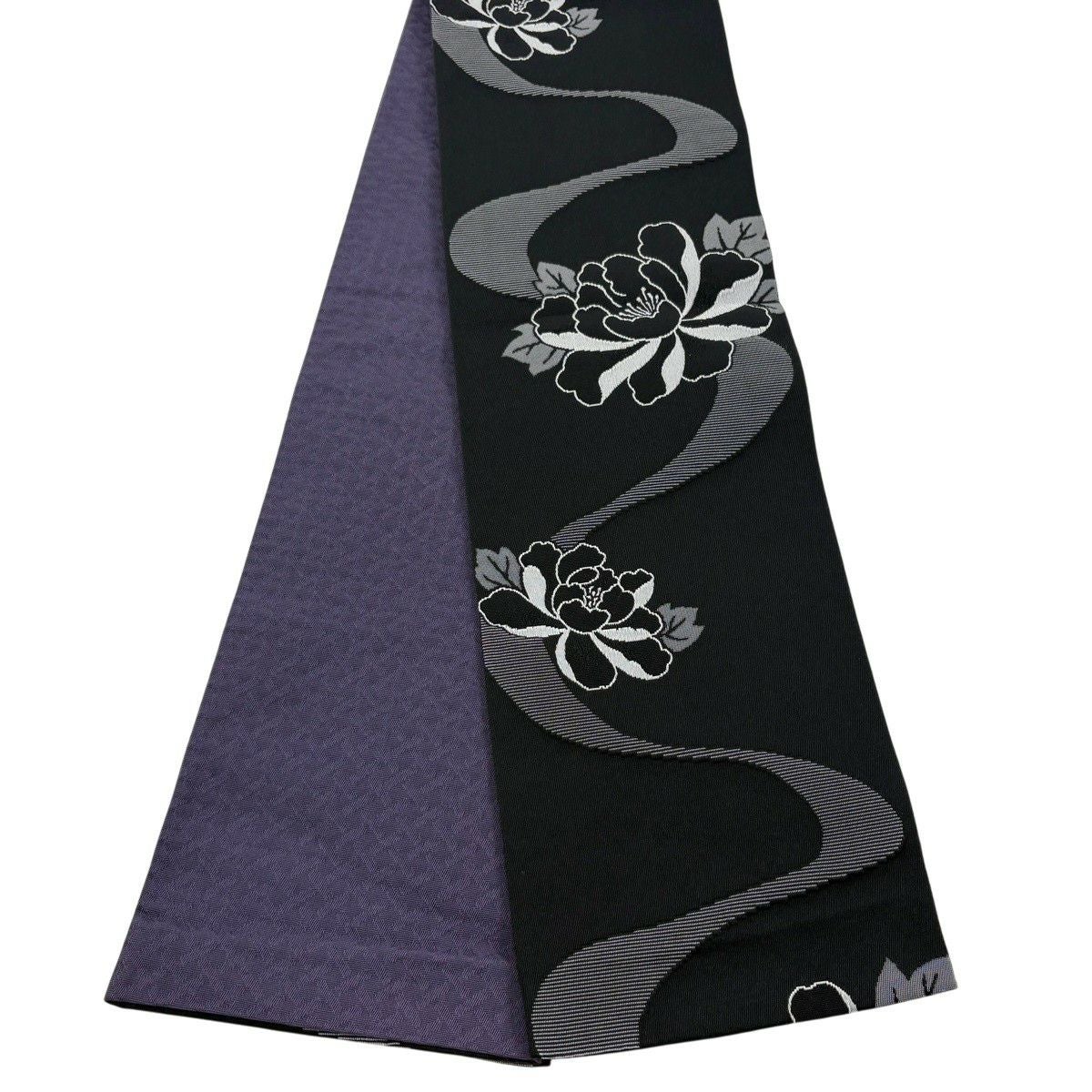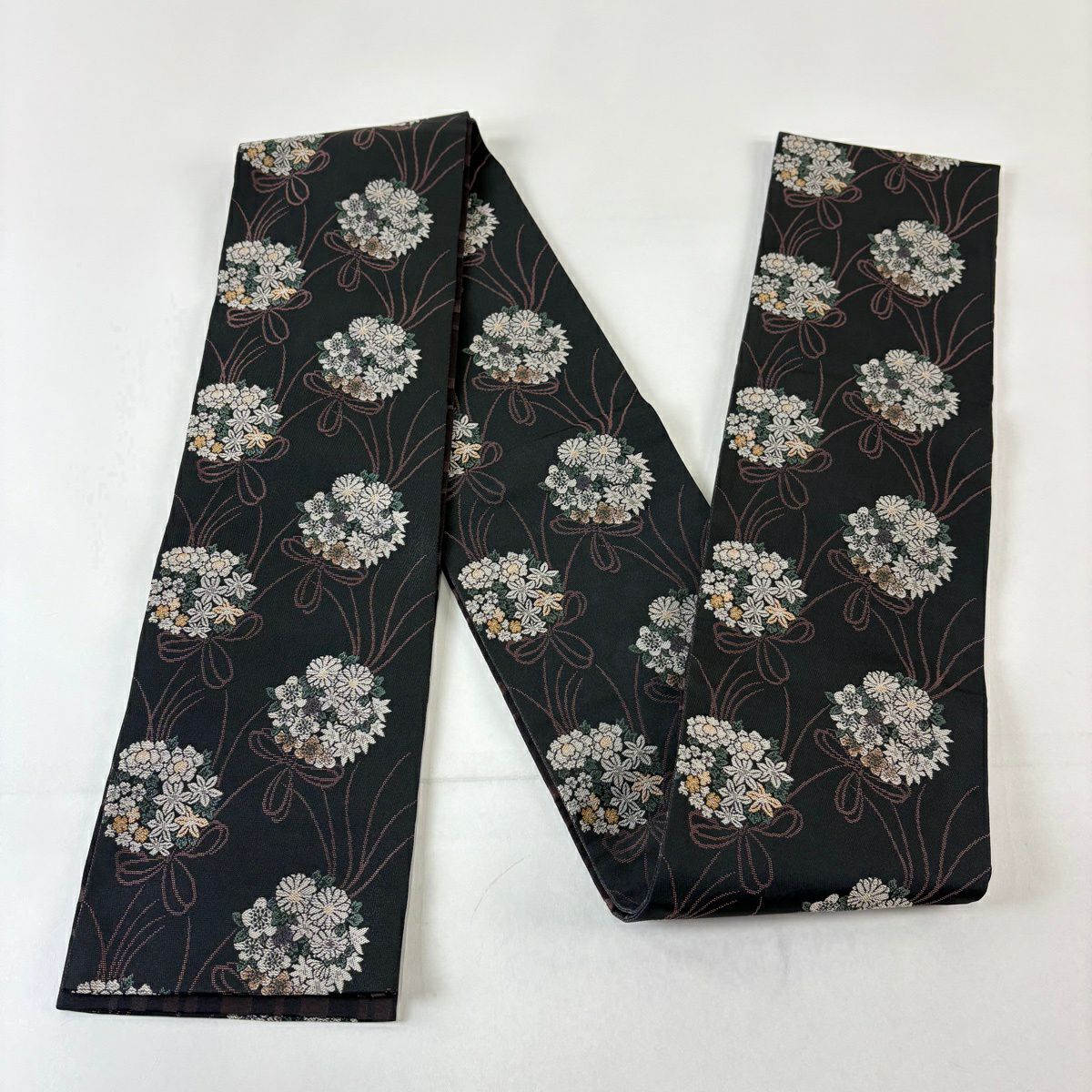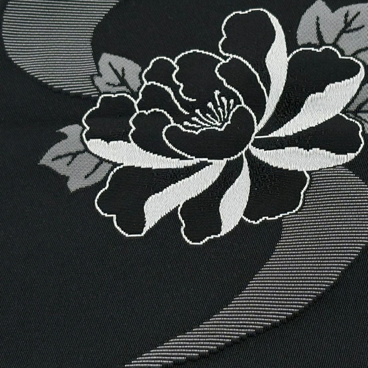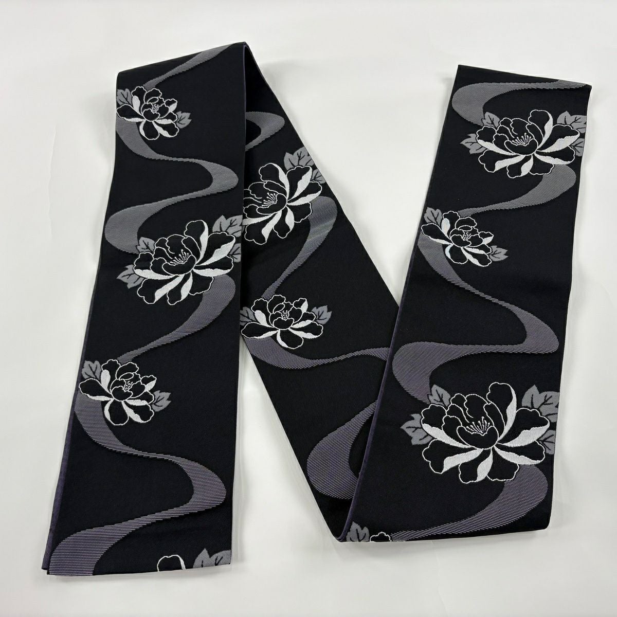 【美品】半幅帯 優品 花束 牡丹 紺色 化繊