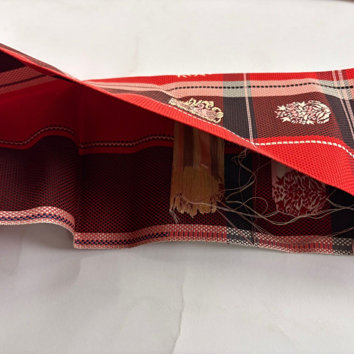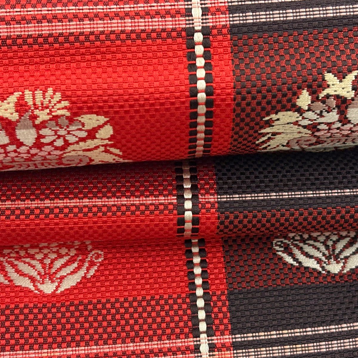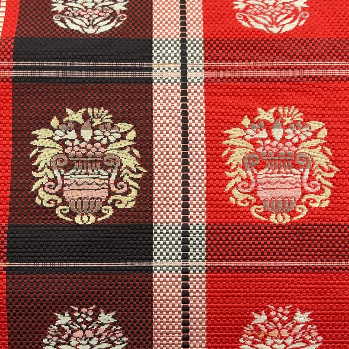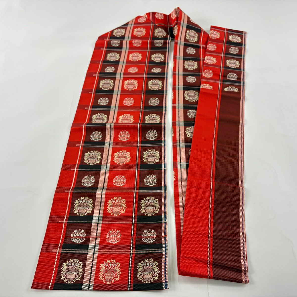 名古屋帯 優品 八寸名古屋帯 花器 格子 赤 正絹